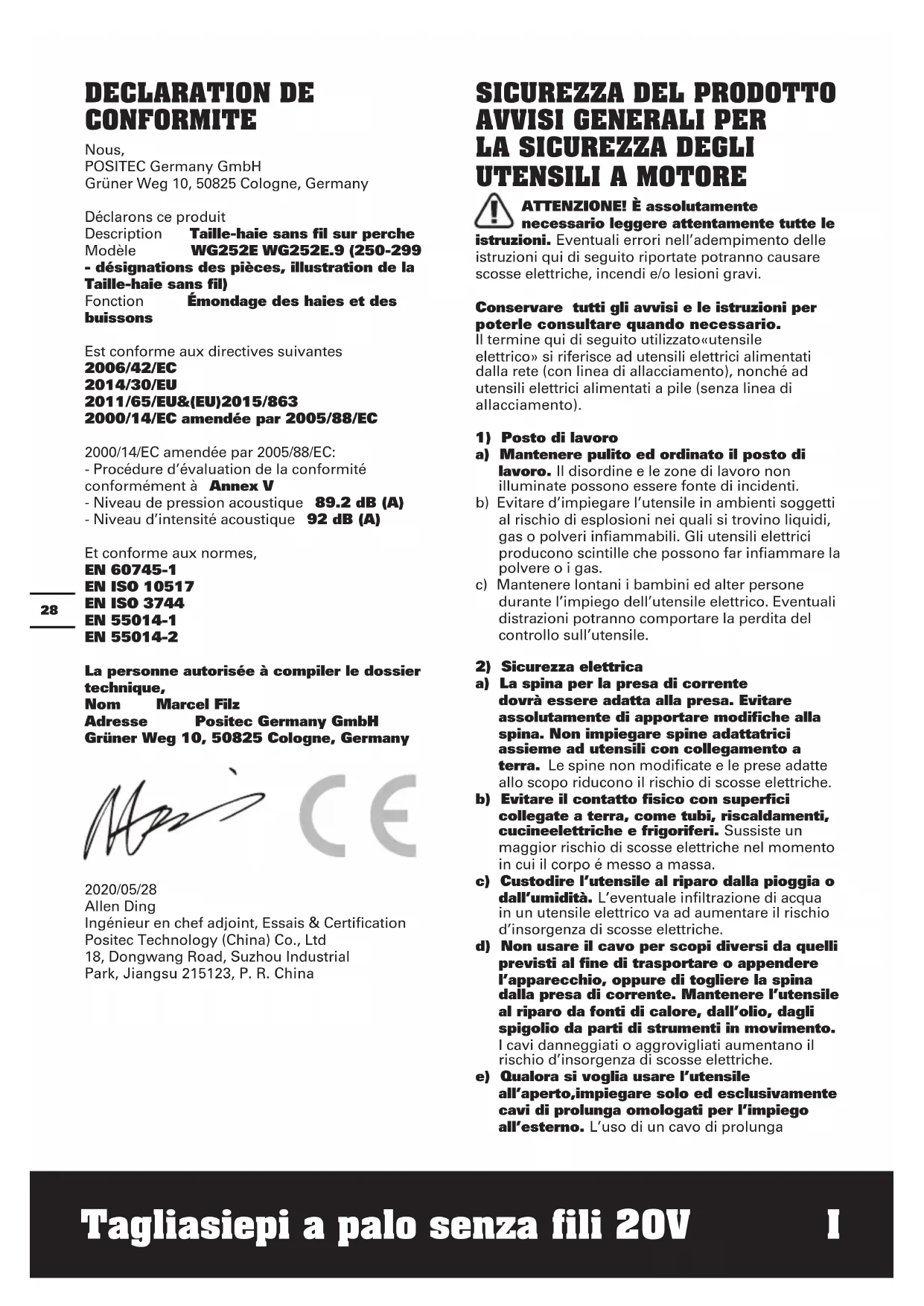 Quando si procede al taglio frontale e laterale, cominciare sempre dal basso verso l’alto arrotondando il lato della siepe. Questa forma esporrà al sole più superficie della siepe e quindi permetterà una crescita uniforme della stessa. MANUTENZIONE Prima di eseguire qualsiasi intervento di regolazione, manutenzione o assistenza estrarre la batteria dal tagliasiepi. All’interno dell’attrezzo non ci sono parti riparabili da parte dell’utente. Non usare mai acqua o detergenti chimici per pulire l’attrezzo. Pulire con un panno asciutto. Immagazzinare sempre gli attrezzi elettrici in luoghi asciutti. Tenere pulite le aperture di ventilazione del motore. Tenere puliti dalla polvere tutti i controlli operativi. TUTELA AMBIENTALE I prodotti elettrici non possono essere gettati tra i rifiuti domestici. L’apparecchio da rottamare deve essere portato al centro di riciclaggio per un corretto trattamento. Controllare con le autorità locali o con il rivenditore per localizzare il centro di raccolta/riciclaggio più vicino. DICHIARAZIONE DI CONFORMITÀ NOI, POSITEC Germany GmbH Grüner Weg 10, 50825 Cologne, Germany Dichiara che l’apparecchio, Descrizione Tagliasiepi con asta telescopica senza fili Codice WG252E WG252E.9 (250-299 - designazione del macchinario rappresentativo del tagliasiepi) Funzione L’utensile è previsto per tagliare e tosare siepi e cespugli del Vostro giardino. È conforme alle seguenti direttive, 2006/42/EC 2014/30/EU 2011/65/EU&(EU)2015/863 2000/14/EC modificata dalla 2005/88/EC 2000/14/EC modificata dalla 2005/88/EC: - Procedura di conformità come da Annex V - Potenza acustica pesata 89.2 dB(A) - Massima potenza di rumore garantita 92 dB(A) conforme a, EN 60745-1 EN ISO 10517 EN ISO 3744 EN 55014-1 EN 55014-2 Il responsabile autorizzato alla compilazione della documentazione tecnica, Nome Marcel Filz Indirizzo Positec Germany GmbH Grüner Weg 10, 50825 Cologne, Germany 2020/05/28 Allen Ding Vice capo ingegnere, testing e certificazione Positec Technology (China) Co., Ltd 18, Dongwang Road, Suzhou Industrial Park, Jiangsu 215123, P. R. China36 Recortadora de setos de poste inalámbrico de 20V