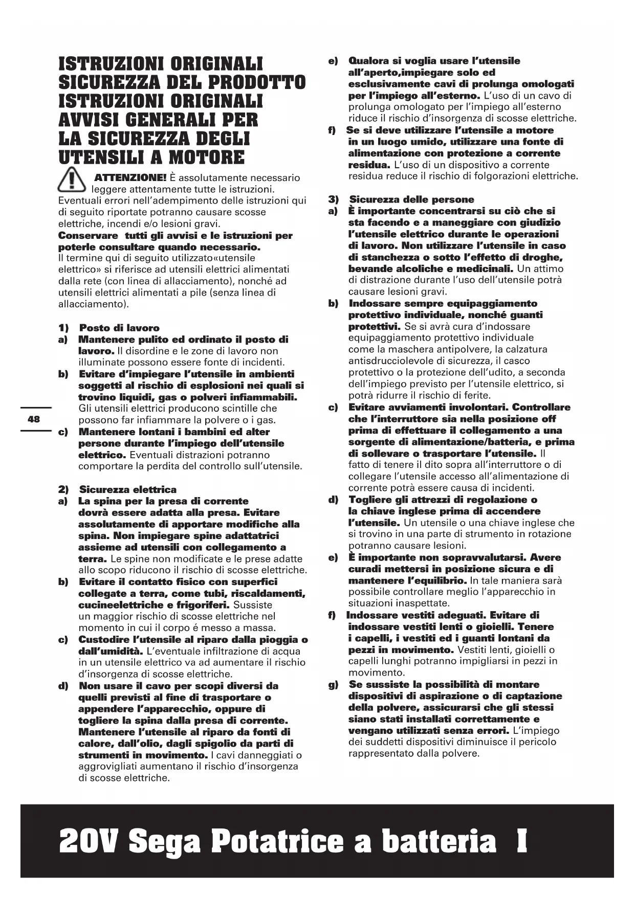 20V Sega Potatrice a batteria I ISTRUZIONI ORIGINALI