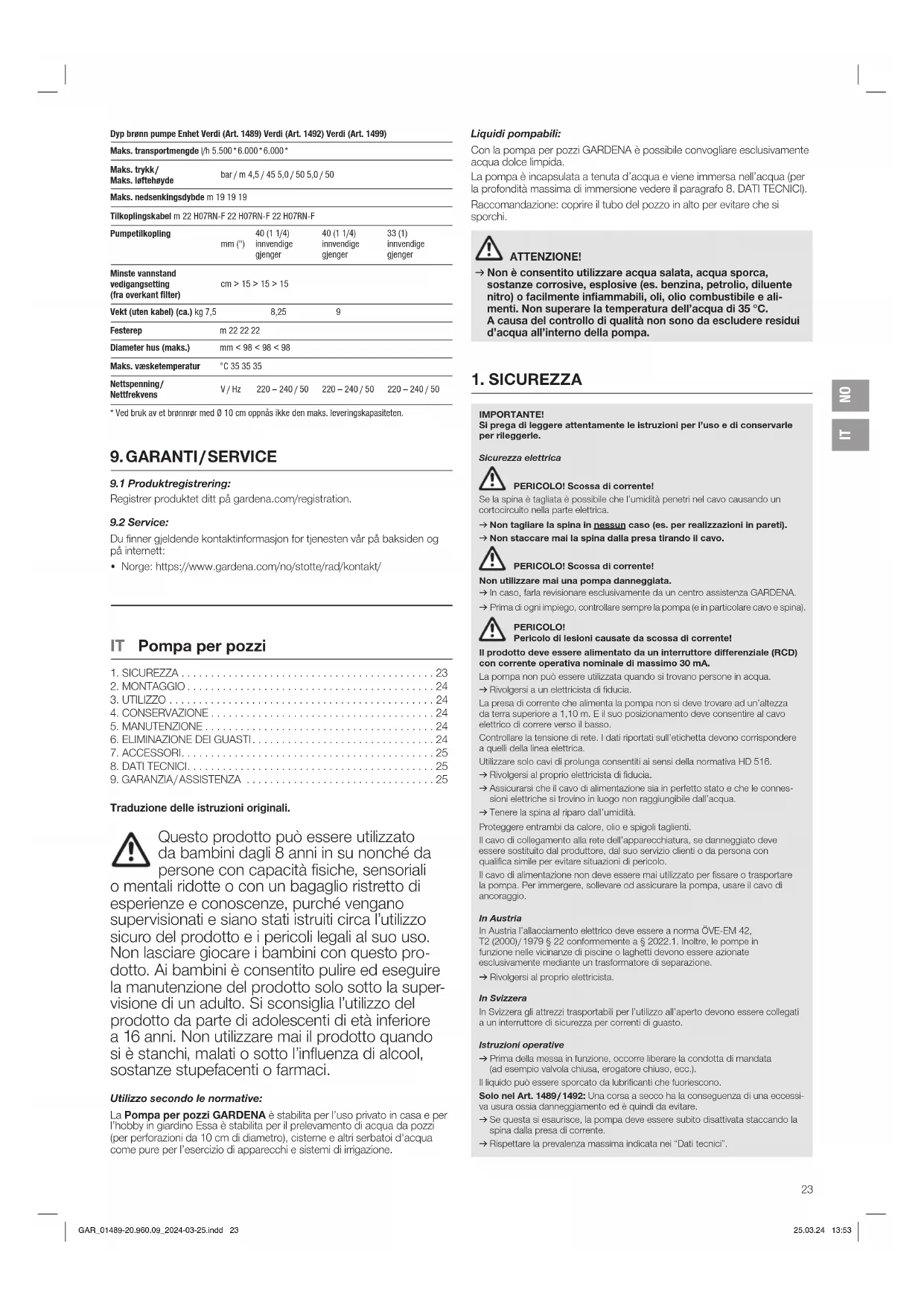 Liquidi pompabili: Con la pompa per pozzi GARDENA è possibile convogliare esclusivamente acqua dolce limpida. La pompa è incapsulata a tenuta d’acqua e viene immersa nell’acqua (per la profondità massima di immersione vedere il paragrafo 8. DATI TECNICI). Raccomandazione: coprire il tubo del pozzo in alto per evitare che si sporchi. ATTENZIONE! v Non è consentito utilizzare acqua salata, acqua sporca, sostanze corrosive, esplosive (es. benzina, petrolio, diluente nitro) o facilmente infiammabili, oli, olio combustibile e ali- menti. Non superare la temperatura dell’acqua di 35 °C. A causa del controllo di qualità non sono da escludere residui d’acqua all’interno della pompa. IMPORTANTE! Si prega di leggere attentamente le istruzioni per l’uso e di conservarle per rileggerle. Sicurezza elettrica PERICOLO! Scossa di corrente! Se la spina è tagliata è possibile che l’umidità penetri nel cavo causando un cortocircuito nella parte elettrica. v Non tagliare la spina in nessun caso (es. per realizzazioni in pareti). v Non staccare mai la spina dalla presa tirando il cavo. PERICOLO! Scossa di corrente! Non utilizzare mai una pompa danneggiata. v In caso, farla revisionare esclusivamente da un centro assistenza GARDENA. v Prima di ogni impiego, controllare sempre la pompa (e in particolare cavo e spina). PERICOLO! Pericolo di lesioni causate da scossa di corrente! Il prodotto deve essere alimentato da un interruttore differenziale (RCD) con corrente operativa nominale di massimo 30 mA. La pompa non può essere utilizzata quando si trovano persone in acqua. v Rivolgersi a un elettricista di fiducia. La presa di corrente che alimenta la pompa non si deve trovare ad un’altezza da terra superiore a 1,10 m. E il suo posizionamento deve consentire al cavo elettrico di correre verso il basso. Controllare la tensione di rete. I dati riportati sull’etichetta devono corrispondere a quelli della linea elettrica. Utilizzare solo cavi di prolunga consentiti ai sensi della normativa HD 516. v Rivolgersi al proprio elettricista di fiducia. v Assicurarsi che il cavo di alimentazione sia in perfetto stato e che le connes- sioni elettriche si trovino in luogo non raggiungi bile dall’acqua. v Tenere la spina al riparo dall’umidità. Proteggere entrambi da calore, olio e spigoli taglienti. Il cavo di collegamento alla rete dell’apparecchiatura, se danneggiato deve essere sostituito dal produttore, dal suo servizio clienti o da persona con qualifica simile per evitare situazioni di pericolo. Il cavo di alimentazione non deve essere mai utilizzato per fissare o trasportare la pompa. Per immergere, sollevare od assicurare la pompa, usare il cavo di ancoraggio. In Austria In Austria l’allacciamento elettrico deve essere a norma ÖVE-EM 42, T2 (2000) / 1979 § 22 conformemente a § 2022.1. Inoltre, le pompe in funzione nelle vici nanze di piscine o laghetti devono essere azionate esclusivamente mediante un trasformatore di separazione. v Rivolgersi al proprio elettricista. In Svizzera In Svizzera gli attrezzi trasportabili per l’utilizzo all’aperto devono essere collegati a un interruttore di sicurezza per correnti di guasto. Istruzioni operative v Prima della messa in funzione, occorre liberare la condotta di mandata (ad esempio valvola chiusa, erogatore chiuso, ecc.). Il liquido può essere sporcato da lubrificanti che fuoriescono. Solo nel Art. 1489 / 1492: Una corsa a secco ha la conseguenza di una eccessi- va usura ossia danneggiamento ed è quindi da evitare. v Se questa si esaurisce, la pompa deve essere subito disattivata staccando la spina dalla presa di corrente. v Rispettare la prevalenza massima indicata nei “Dati tecnici”.