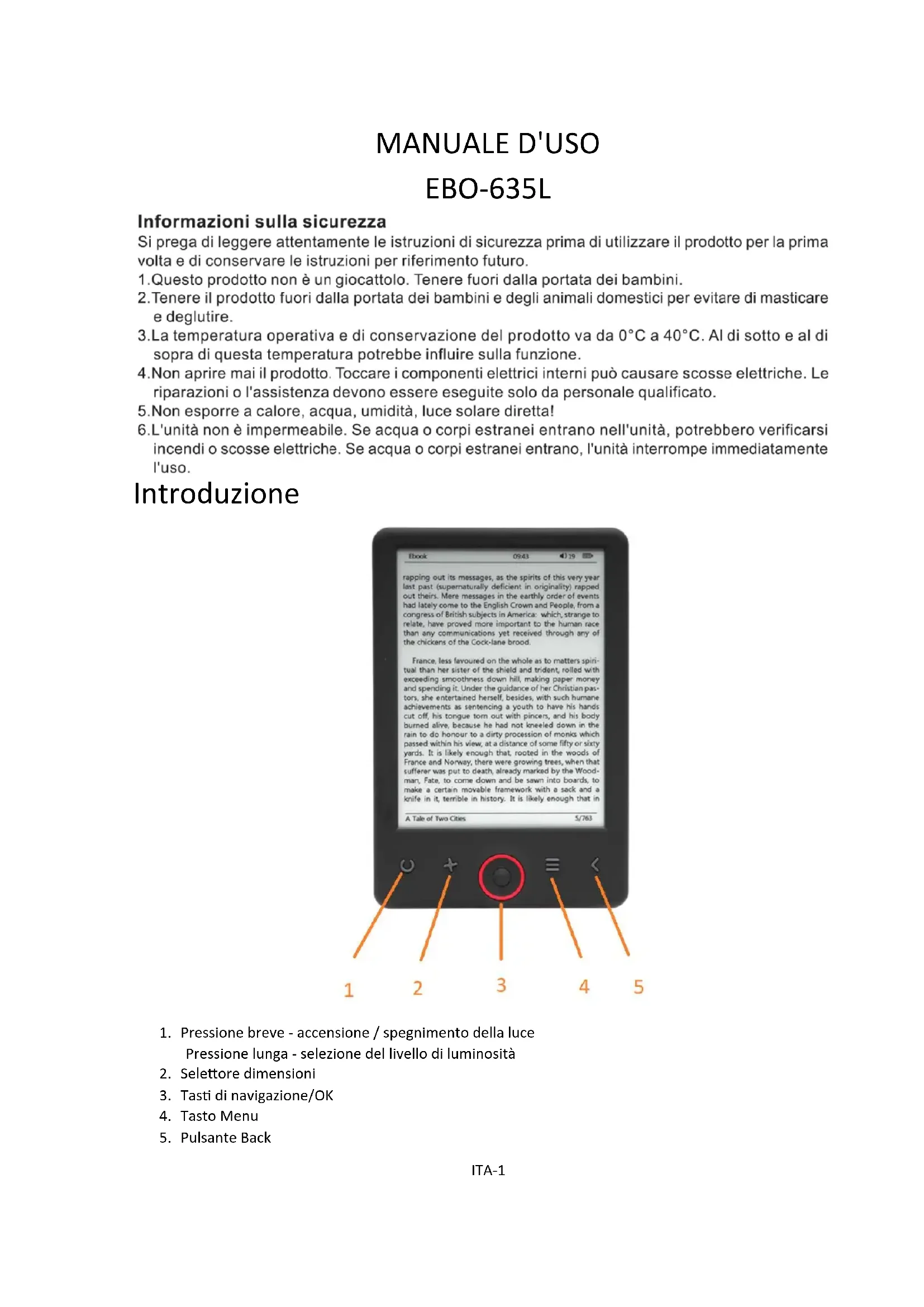 porta il lettore in modalità standby a scopo di risparmio energetico. Nota: l’utente ha la possibilità personalizzare lo screensaver in base alle proprie esigenze: aprire un’immagine precaricata, premere il pulsante “Menu” e selezionare "Imposta come screensaver". 3.Data e ora Nella schermata principale, la settimana, il giorno e la data vengono visualizzati nell'angolo inferiore sinistro del display mentre l'ora viene visualizzata nell'angolo inferiore destro. Durante la lettura di un libro, l'ora viene visualizzata nell'angolo superiore destro della schermata. Per modificare la data e l'ora, accedere a Impostazioni, andare su Data e ora e accedere alla scheda corrispondente. Nelle impostazioni dell'ora, utilizzare i pulsanti "Sinistra"/"Destra" per cambiare tra ora/minuto/formato e i pulsanti "Su"/"Giù" per modificare le cifre e selezionare tra formato a 24 ore/am/pm. Nelle impostazioni della data, utilizzare i pulsanti "Sinistra"/"Destra" per cambiare tra giorno (GG)/mese (MM)/anno (AA) e i pulsanti "Su"/"Giù" per modificare le cifre. 4.Impostazione della lingua Per modificare la lingua, andare su Impostazioni e selezionare Lingua. Verrà visualizzata una finestra di pop- up con le lingue disponibili. Scegliere la lingua desiderata e premere il pulsante “OK” per confermare. 5.Formattazione del dispositivo In questa scheda l’utente ha la possibilità di formattare il dispositivo. Tenere presente che durante la formattazione, tutti i dati salvati nella memoria interna verranno eliminati! Eseguire il back-up dei dati importanti! Consigliamo di rimuovere la scheda di memoria dal dispositivo prima della sua formattazione. 6.Impostazioni predefinite Per ripristinare le impostazioni predefinite del lettore, accedere a questa scheda, selezionare OK e premere il pulsante "OK" per confermare. Verranno ripristinate le impostazioni predefinite e sulla schermata verrà visualizzata una richiesta di selezione della lingua. Informazioni sul dispositivo. Accedere a questa scheda per visualizzare la versione del software, il numero del modello del dispositivo, la capacità utilizzata e totale della memoria interna e la capacità utilizzata e totale della memoria esterna. 7.Informazioni sul dispositivo Accedere a questa scheda per visualizzare la versione del software, il numero del modello del dispositivo, la capacità utilizzata e totale della memoria interna e la capacità utilizzata e totale della memoria esterna. Trasferimento dei dati Sono disponibili due modi per trasferire i file: 1.Inserire una scheda microSD con i file precaricati nello slot di memoria del dispositivo. 2.Collegare il lettore a un PC tramite il cavo USB fornito in dotazione. Sulla schermata viene visualizzato un messaggio a indicare che il collegamento USB è stato eseguito correttamente. A questo punto è possibile copiare i file sul dispositivo o sulla scheda di memoria. Nota: evitare di scollegare il lettore dal computer durante il trasferimento, in quanto ciò potrebbe danneggiare la memoria del dispositivo. Ripristino In caso di blocco del lettore, ad esempio, l'utente può ripristinare il dispositivo. Inserire un utensile sottile nel foro per il ripristino sul retro del dispositivo e tenere premuto il pulsante per riavviarlo. ITA-5Trasferimento di Ebook protetti da copia DRM sul tuo
