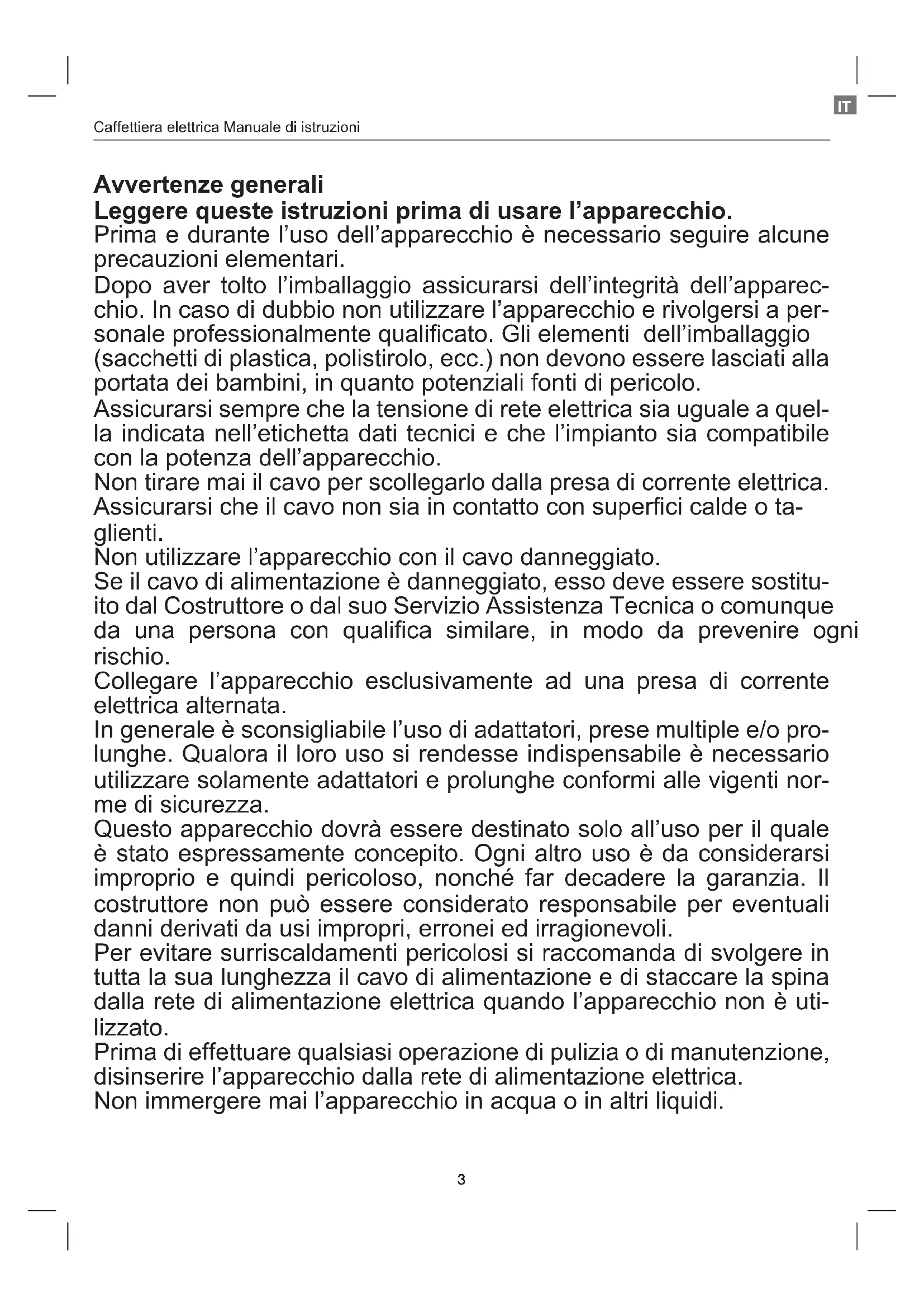 Avvertenze generali Leggere queste istruzioni prima di usare l’apparecchio. Prima e durante l’uso dell’apparecchio è necessario seguire alcune precauzioni elementari. Dopo aver tolto l’imballaggio assicurarsi dell’integrità dell’apparec- chio. In caso di dubbio non utilizzare l’apparecchio e rivolgersi a per- sonale professionalmente qualicato. Gli elementi dell’imballaggio (sacchetti di plastica, polistirolo, ecc.) non devono essere lasciati alla portata dei bambini, in quanto potenziali fonti di pericolo. Assicurarsi sempre che la tensione di rete elettrica sia uguale a quel- la indicata nell’etichetta dati tecnici e che l’impianto sia compatibile con la potenza dell’apparecchio. Non tirare mai il cavo per scollegarlo dalla presa di corrente elettrica. Assicurarsi che il cavo non sia in contatto con superci calde o ta- glienti. Non utilizzare l’apparecchio con il cavo danneggiato. Se il cavo di alimentazione è danneggiato, esso deve essere sostitu- ito dal Costruttore o dal suo Servizio Assistenza Tecnica o comunque da una persona con qualica similare, in modo da prevenire ogni rischio. Collegare l’apparecchio esclusivamente ad una presa di corrente elettrica alternata. In generale è sconsigliabile l’uso di adattatori, prese multiple e/o pro- lunghe. Qualora il loro uso si rendesse indispensabile è necessario utilizzare solamente adattatori e prolunghe conformi alle vigenti nor- me di sicurezza. Questo apparecchio dovrà essere destinato solo all’uso per il quale è stato espressamente concepito. Ogni altro uso è da considerarsi improprio e quindi pericoloso, nonché far decadere la garanzia. Il costruttore non può essere considerato responsabile per eventuali danni derivati da usi impropri, erronei ed irragionevoli. Per evitare surriscaldamenti pericolosi si raccomanda di svolgere in tutta la sua lunghezza il cavo di alimentazione e di staccare la spina dalla rete di alimentazione elettrica quando l’apparecchio non è uti- lizzato. Prima di effettuare qualsiasi operazione di pulizia o di manutenzione, disinserire l’apparecchio dalla rete di alimentazione elettrica. Non immergere mai l’apparecchio in acqua o in altri liquidi.Caffettiera elettrica Manuale di istruzioni
