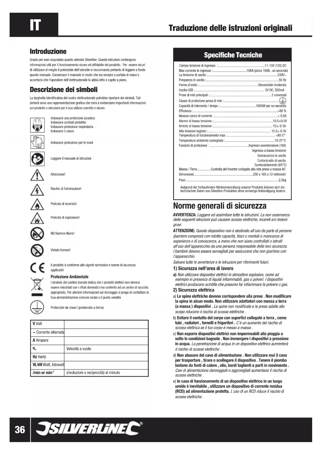 Velocità a vuotoHz HertzW, kW Watt, kilowatt/min or min (rivoluzioni o reciprocità) al minuto Specifiche Tecniche Campo tensione di ingresso :.........................................................11-15V (12V) DC Max corrente in ingresso :.........................................100A (picco 160A , un secondo)La tensione di uscita :.....................................................................................230V~ Frequenza in uscita :........................................................................................50 HzForma d'onda :........................................................................Sinusoidale moderataUscita USB :.................................................................................... 5V DC, 500mAPrese di rete principali :...........................................................................2 universaliClasse di protezione presa di rete :..................................................................Capacità di intervento / tempo :............................................1600W per un secondo Efficienza :......................................................................................................>88 % Nessun carico di corrente :............................................................................< 0,8AAlarme di bassa tensione :........................................................................10.5+0.5V Arresto di bassa tensione :....................................................................... 10± 0.5V Alta tensione tagliato :............................................................................ 15.5± 0.3VTemperatura di funzionamento max :.......................................................... <65 C°Temperatura ambiente consigliata :............................................................10-27°C Funzioni di protezione :...............................................Ingresso sovratensione (16V)Ingresso a bassa tensione Sovraccarico in uscitaCortocircuito di uscitaSurriscaldamento (65°C)Massa / Terra :...............Custodia del’inverter collegato alla rete presa a massa AC Dimensioni:.......................................................................250 x 165 x 72 millimetri Peso : .............................................................................................................2.2kg Aufgrund der fortlaufenden Weiterentwicklung unserer Produkte können sich die technischen Daten von Silverline-Produkten ohne vorherige Ankündigung ändern. Norme generali di sicurezza AVVERTENZA: Leggere ed assimilare tutte le istruzioni. La non osservanza delle seguenti istruzioni può causare scosse elettriche, incendi e/o lesioni gravi.ATTENZIONE: Questo dispositivo non è destinato all'uso da parte di persone (bambini compresi) con ridotte capacità, fisici o mentali o mancanza di esperienza o di conoscenza, a meno che non siano controllati o istruiti all'uso dell'apparecchio da una persona responsabile della loro sicurezza. I bambini devono essere sorvegliati per assicurarsi che non giochino con l'apparecchio. Salvare tutte le avvertenze e le istruzioni per riferimenti futuri.