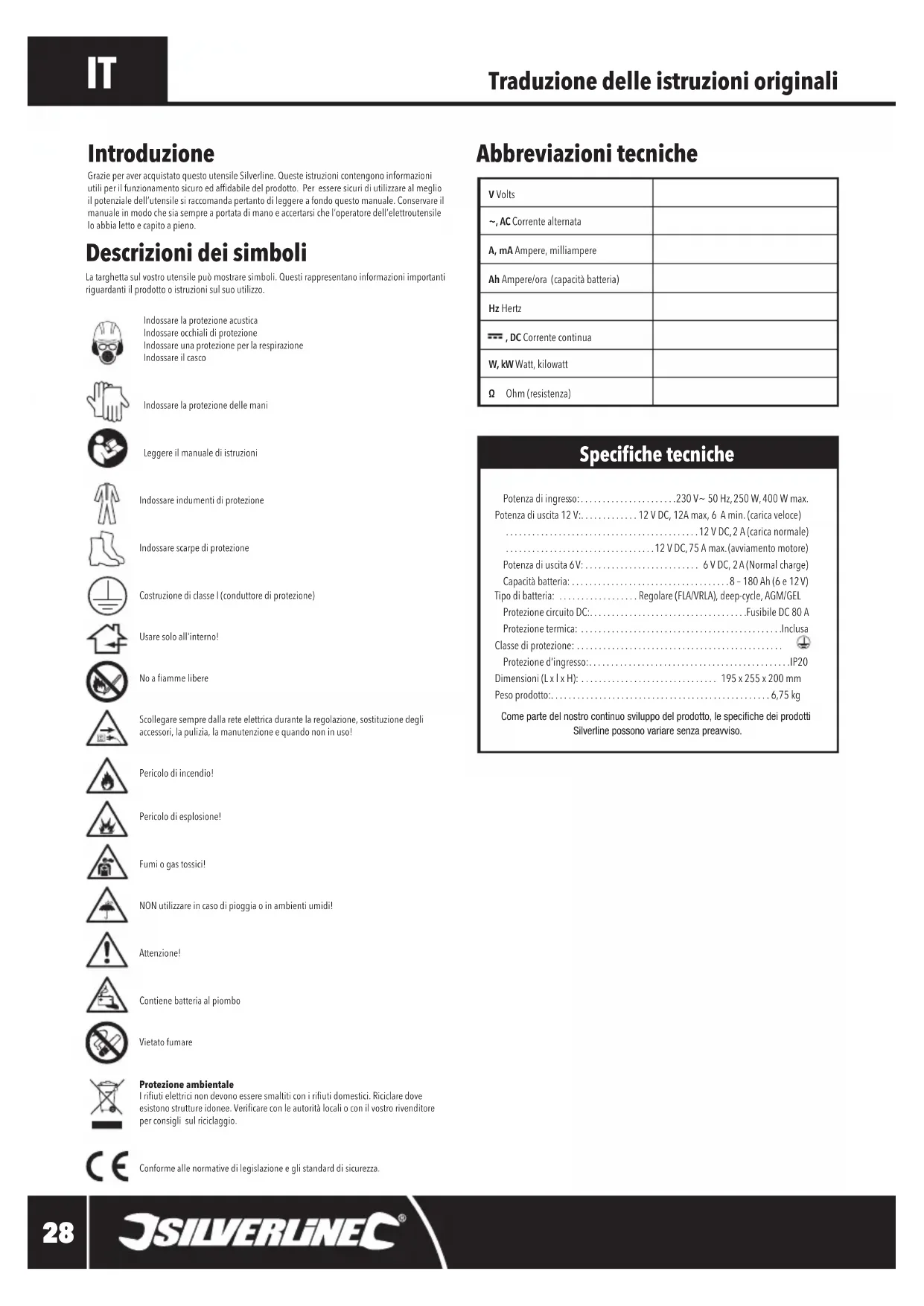 Traduzione delle istruzioni originali Abbreviazioni tecniche Descrizioni dei simboli La targhetta sul vostro utensile può mostrare simboli. Questi rappresentano informazioni importanti riguardanti il prodotto o istruzioni sul suo utilizzo.Indossare la protezione acusticaIndossare occhiali di protezioneIndossare una protezione per la respirazioneIndossare il cascoIndossare la protezione delle maniLeggere il manuale di istruzioniIndossare indumenti di protezioneIndossare scarpe di protezioneCostruzione di classe I (conduttore di protezione)Usare solo all'interno!No a amme libereScollegare sempre dalla rete elettrica durante la regolazione, sostituzione degli accessori, la pulizia, la manutenzione e quando non in uso!Pericolo di incendio!Pericolo di esplosione!Fumi o gas tossici!NON utilizzare in caso di pioggia o in ambienti umidi!Attenzione!Contiene batteria al piomboVietato fumareProtezione ambientale I riuti elettrici non devono essere smaltiti con i riuti domestici. Riciclare dove esistono strutture idonee. Vericare con le autorità locali o con il vostro rivenditore per consigli sul riciclaggio.Conforme alle normative di legislazione e gli standard di sicurezza. Introduzione Grazie per aver acquistato questo utensile Silverline. Queste istruzioni contengono informazioni utili per il funzionamento sicuro ed afdabile del prodotto. Per essere sicuri di utilizzare al meglio il potenziale dell’utensile si raccomanda pertanto di leggere a fondo questo manuale. Conservare il manuale in modo che sia sempre a portata di mano e accertarsi che l’operatore dell’elettroutensile lo abbia letto e capito a pieno. V Volts~, AC Corrente alternataA, mA Ampere, milliampereAh Ampere/ora (capacità batteria)Hz Hertz , DC Corrente continuaW, kW Watt, kilowattΩ Ohm (resistenza) Speciche tecniche