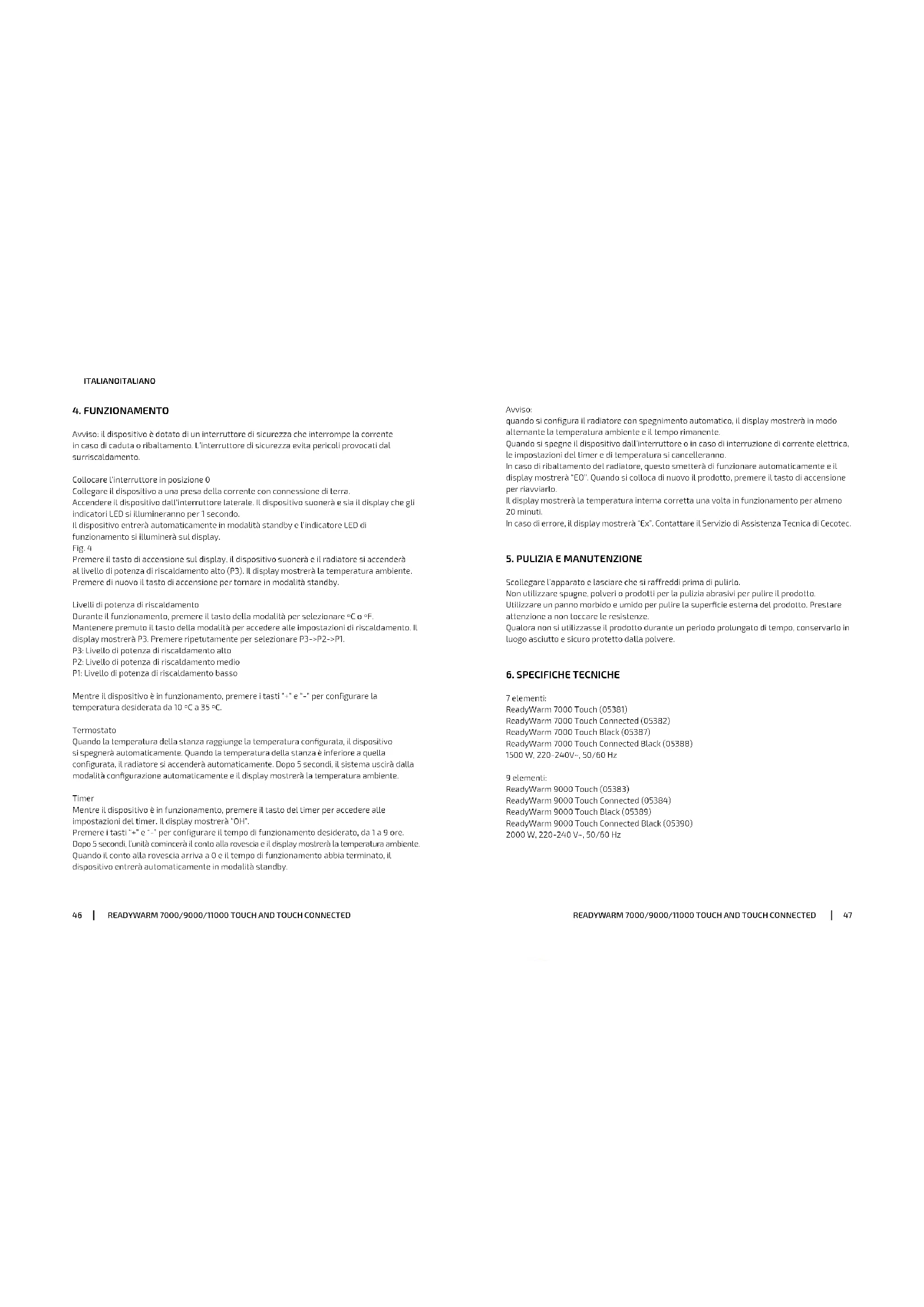 Leggere attentamente le seguenti istruzioni prima di usare il prodotto. Conservare questo manuale per riferimenti futuri o nuovi utenti. Vericare che la tensione di rete coincida con quella specicata nell’etichetta di classicazione del prodotto e che la presa elettrica sia di terra. Questo prodotto è stato progettato esclusivamente per uso domestico. Non utilizzare a ni industriali o commerciali. Questo prodotto è indicato solamente per luoghi caldi o per uso episodico. Scollegare il radiatore dalla corrente quando non in uso e in caso di pulizia. Non lasciare il dispositivo incustodito mentre è in funzionamento. Non coprire il dispositivo, potrebbe provocare rischio di incendio. Ispezionare regolarmente il cavo di alimentazione in cerca di danni visibili. Se il cavo dovesse essere danneggiato, dovrà essere riparato dal Servizio di Assistenza Tecnica ufciale di Cecotec per evitare qualsiasi tipo di pericolo. Non collocare il dispositivo vicino a fonti di calore, sostanze inammabili, superci bagnate dove possa cadere o essere gettato in acqua, nè permettere che entri a contatto con acqua o altri liquidi. Non utilizzare in esterni. Non coprire le aperture di entrata e uscita d’aria durante il funzionamento dell’apparato. Mantenere il dispositivo a una distanza minima di 90 cm da materiali inammabili come mobili, tende, lenzuola o carta.READYWARM 7000/9000/11000 TOUCH AND TOUCH CONNECTEDREADYWARM 7000/9000/11000 TOUCH AND TOUCH CONNECTED 1918 PORTUGUÊSITALIANO Este produto não é adequado para aquecimento primário. Este produto só é indicado em sítios abrigados ou para uso ocasional.