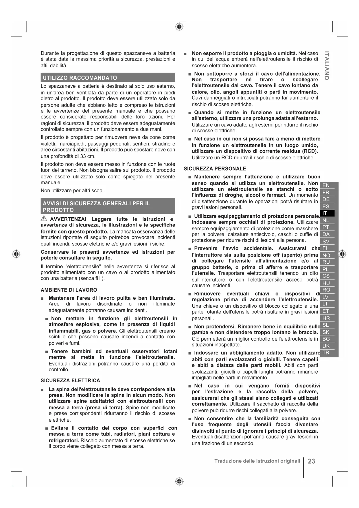 Traduzione delle istruzioni originaliPREPARAZIONE ■ Ispezionare attentamente la zona nella quale il dispositivo deve essere utilizzato e rimuovere eventuali zerbini, slitte, assi, cavi ed altri corpi estranei. ■ Disinnestare tutte le frizioni e mettere in folle prima di avviare il motore. ■ Mentre si mette in funzione il dispositivo indossare sempre abbigliamento invernale adeguato e calzature di sicurezza anti-scivolo. Evitare di indossare abbigliamento con parti svolazzanti o con cordicelle o cordini pendenti; tali elementi potranno infatti rimanere impigliati nelle parti in movimento. ■ Assicurare i capelli lunghi all'altezza delle spalle per evitare che rimangano impigliati nelle parti in movimento. ■ Indossare sempre occhiali di sicurezza o schermi per gli occhi durante l'utilizzo o durante una regolazione o riparazione, per proteggere gli occhi da corpi estranei che potrebbero essere lanciati dal prodotto. ■ Assicurarsi prima di ciascun utilizzo che tutti i comandi e i dispositivi di sicurezza funzionino correttamente. Non utilizzare il prodotto se l'interruttore "off" (spegnimento) non lo spegne. ■ Prima di ciascun utilizzo, controllare sempre che l'alloggiamento sia integro e che le protezioni e le maniglie siano in posizione e adeguatamente fissate. UTILIZZO ■ Non utilizzare il prodotto in caso di rischi di fulmini. ■ Tenere mani e piedi lontani dalle parti rotanti. Tenersi sempre lontani dalle aperture di scarico. Non inserire oggetti nelle aperture. ■ Prestare estrema cautela durante l'utilizzo o durante l'attraversamento di sentieri o vialetti di ghiaia. Restare vigili per la presenza di pericoli nascosti o durante l'utilizzo in prossimità delle vie pubbliche. ■ Per ridurre il rischio di lesioni associate al contatto con le parti mobili, spegnere sempre il prodotto e rimuovere il pacco batteria. Assicurarsi che tutte le parti in movimento si siano arrestate: ● Dopo aver colpito un corpo estraneo controllare il prodotto per individuare eventuali danni ● prima di svolgere operazioni di pulizia o rimuovere un blocco ● prima di lasciare il prodotto incustodito ● prima di svolgere operazioni di controllo, manutenzione o lavoro sul prodotto ● se il prodotto inizia a vibrare in maniera anormale (controllare immediatamente) Le vibrazioni sono in genere una spia del malfunzionamento della macchina. ■ Sui pendii procedere sempre in diagonale e mai in direzione verticale. Fare estrema attenzione quando si cambia direzione sui pendii. Non tentare di rimuovere la neve da pendii ripidi. ■ Non mettere in funzione il prodotto senza aver montato adeguati schermi e piastre o altri dispositivi di protezione di sicurezza. ■ Non dirigere mai lo scarico verso le persone o verso aree in cui si potrebbero causare danni materiali. Tenere eventuali osservatori, soprattutto animali e bambini, lontani dall’area di taglio. ■ Non sovraccaricare la capacità della macchina tentando di rimuovere la neve troppo velocemente. ■ Non utilizzare mai il prodotto ad alta velocità su superfici scivolose. Durante l'utilizzo a marcia indietro guardare dietro di sé e prestare attenzione. ■ Quando il prodotto viene trasportato o non è utilizzato, scollegare l'alimentazione da collettore e girante. ■ Utilizzare solo parti di ricambio, accessori e dispositivi originali della ditta produttrice. ■ Non utilizzare mai il prodotto in caso di scarsa visibilità o illuminazione. Verificare sempre l'appoggio dei piedi e impugnare saldamente le maniglie. Camminare, non correre mai. ■ Posizionare sempre il prodotto su superfici dure e pulite e mai su altro tipo di superfici, quando il motore è avviato. Ghiaia, sabbia e altri detriti potranno essere aspirati dalla griglia dell'aria e scagliati verso l'operatore o l'osservatore, causando gravi lesioni possibili. ■ Non mettere in funzione il prodotto accanto a divisori in vetro, automobili, finestre o porte senza aver prima regolato correttamente l'angolo di spalatura neve. ■ Se il prodotto viene fatto cadere, subisce un grave impatto oppure vibra in maniera anomala, spegnerlo immediatamente e ispezionarlo per verificare la presenza di danni o per identificare la causa delle vibrazioni. Riparare eventuali danni o far sostituire i pezzi da un centro servizi autorizzato. ■ Azionare il prodotto solo con temperature tra 0°C e 40°C. ■ Conservare il prodotto in una posizione in cui la temperatura ambiente è compresa tra 0°C e 40°C.