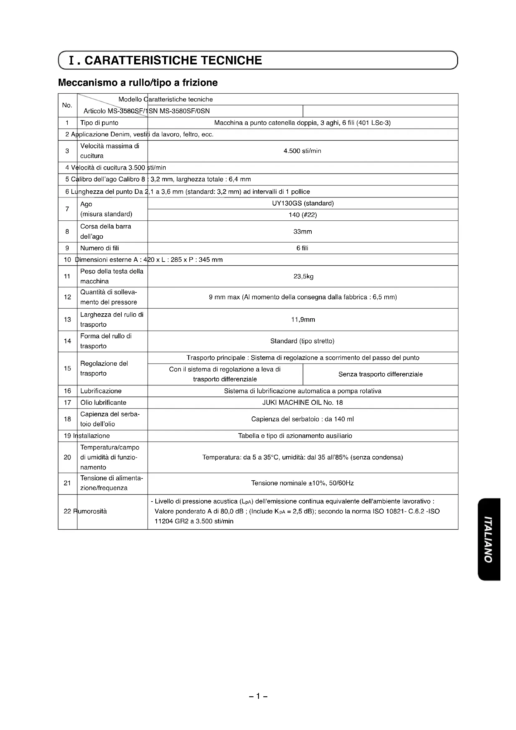 (SOLO PER LA MACCHINA PER CUCIRE DOTATA DI MOTORE A FRIZIONE) ...... 54− 1 − No. Modello Caratteristiche tecniche Articolo MS-3580SF/1SN MS-3580SF/0SN 1 Tipo di punto Macchina a punto catenella doppia, 3 aghi, 6 fi li (401 LSc-3) 2 Applicazione Denim, vestiti da lavoro, feltro, ecc.