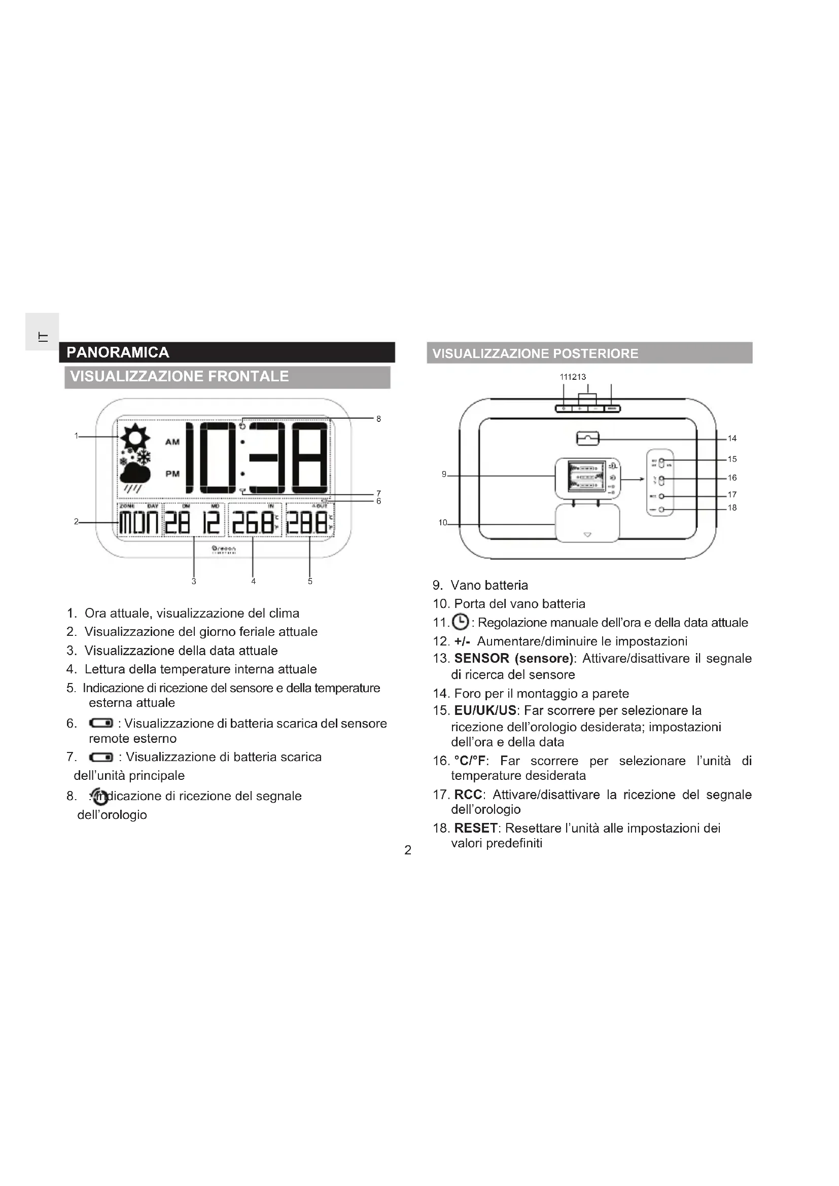 POSIZIONE SIGNIFICATO Area orologio Batterie scariche dell’unità principale Area della temperature esterna Sensore di batteraie scariche SENSORE REMOTO L’unità principale può raccogliere dati da un massimo di 1 sensore. Per impostare il sensore: