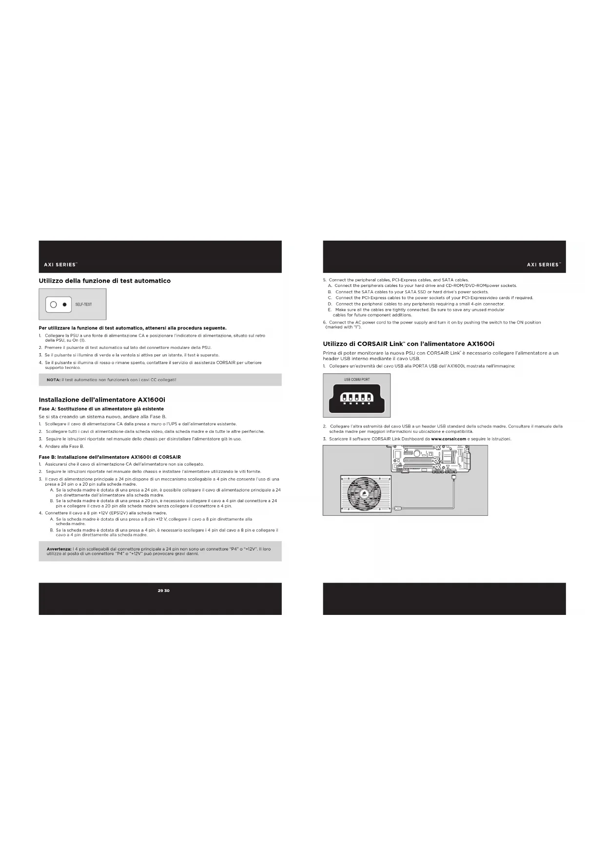 SELF-TEST NOTA: il test automatico non funzionerà con i cavi CC collegati! Avvertenza: I 4 pin scollegabili dal connettore principale a 24 pin non sono un connettore “P4” o “+12V”. Il loro utilizzo al posto di un connettore “P4” o “+12V” può provocare gravi danni.31 32 AXi SERIES