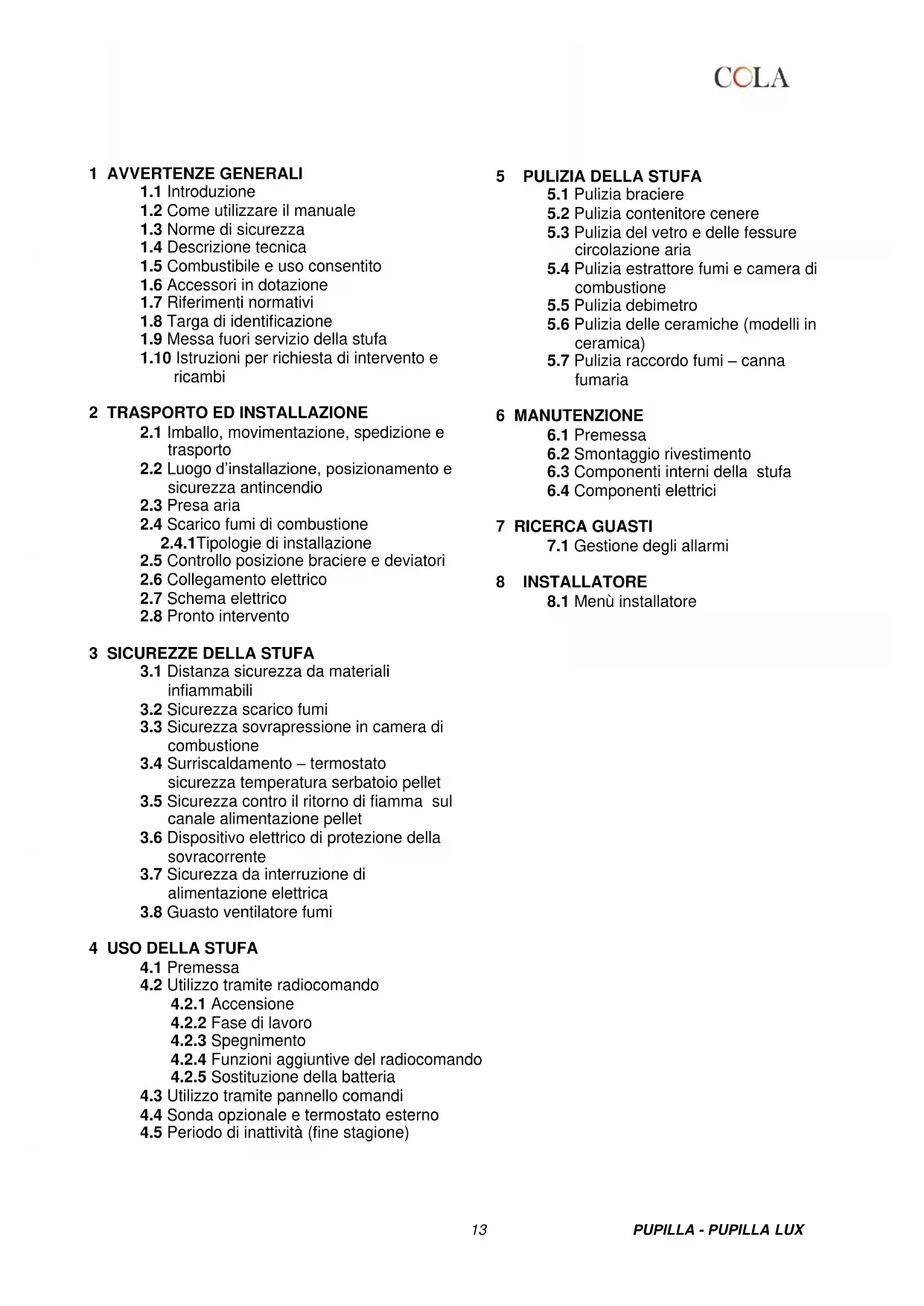 MENU’ 02 – Set orologio Prima di operare con la stufa è necessario impostare l’ora e la data corrente affinché si abbia un riferimento per le eventuali programmazioni del crono. Il controllo elettronico è provvisto di batteria al litio mod. CR2032 da 3 Volt che permette all’orologio interno un autonomia propria; qualora a stufa non alimentato l’orologio non mantiene l’orario o alla riaccensione viene visualizzato una serie di zeri è necessario procedere alla sostituzione chiamando un centro di assistenza autorizzato. Per regolare l’orologio, accedere al menù premendo P5 e impostare il giorno con i tasti P1 e P2. Premendo ancora P5, si può passare alla regolazione delle ore, minuti, giorno, mese ed anno. MENU’ 03 – Set crono Permette di abilitare e disabilitare tutte le funzioni del programmazione oraria. Per abilitare il crono accedere al primo sottomenù ABILITA CRONO ed impostarlo su ON con i tasti P1 e P2. I comandi manuali da pannello di emergenza o da telecomando sono prioritari rispetto alla programmazione. La stufa è dotata di tre diversi tipi di programmazione: giornaliera, settimanale e del week-end. Le programmazioni giornaliere, settimanali e del week end, sono attive solo se viene abilitato il crono generale. Accedendo al secondo sottomenù PROGRAM GIORNO è possibile abilitare o disabilitare la programmazione giornaliera con i tasti P1 e P2. Premendo poi il tasto P5 e poi i tasti P1 e P2 è possibile impostare fino a due fasi di funzionamento delimitate dagli orari impostati. Accedendo al secondo sottomenù PROGRAM SETTIM è possibile abilitare, disabilitare ed impostare le funzioni della programmazione settimanale. Seguire le medesime modalità del paragrafo precedente. E’ possibile impostare fino a quattro fasi di funzionamento delimitate dagli orari e dai giorni impostati. Effettuare la programmazione con attenzione evitando di far sovrapporre le ore di attivazione e/o disattivazione nello stesso giorno in differenti programmi. Accedendo al terzo sottomenù PROGRAM WEEK-END è possibile abilitare, disabilitare ed impostare le funzioni della programmazione settimanale nel fine settimana. Seguire le medesime modalità del paragrafo precedente. E’ possibile impostare fino a due fasi di funzionamento delimitate dagli orari. Al fine di evitare operazioni di avvio e spegnimento non voluti, attivare un solo programma per volta. MENU’ 04 – Scegli lingua Con questa selezione è possibile selezionare la lingua desiderata tra quelle disponibili. MENU’ 05 – Modo stand-by Con la selezione ON nella modalità STAND-BY la stufa si spegne automaticamente dopo che la temperatura T ha raggiunto il valore (Tsettaggio+∆T) per un tempo prefissato. La successiva riaccensione in automatico sarà possibile solamente quando la temperatura ambiente scende al di sotto di quella di settaggio impostata di qualche grado e precisamente (Tsettaggio - ∆T) dove ∆T di defalt = 2 °C. Con la selezione OFF, non è attiva la modalità STAND-BY, ma la funzione di modulazione. Pertanto quando la temperatura supera il valore di SET la stufa funzionerà in potenza minima. MENU’ 06 – Modo cicalino Con questa selezione è possibile attivare o disattivare le segnalazioni acustiche dell’stufa per gli allarmi. MENU’ 07 – Carico iniziale Consente di effettuare un precarico di pellet per un tempo definito. Questa funzione può essere attivata solo ad stufa spento ed è utilizzata se la coclea di caricamento si è svuotata per esaurimento del pellet. Si avvia con il tasto P1 e si interrompe con il tasto P3. MENU’ 08 – Stato stufa/stufa Tale selezione è riservata al solo tecnico autorizzato del centro di assistenza COLA. MENU’ 09 – Tarature tecnico : Tale selezione è riservata al solo tecnico autorizzato del centro di assistenza COLA La modifica dei parametri tecnici sul menu 09 deve essere effettuata da personale autorizzato e competente; eventuali modifiche fatte in modo casuale possono provocare gravi danni che escludono da qualsiasi responsabilità la ditta COLA. MENU’ 10 – Tarature installatore : Tale selezione è riservata all’installatore abilitato e/o al tecnico autorizzato del centro di assistenza COLA. MENU’ 11 - Modalità ECO : Con la selezione ON nella modalità ECO, si vincola la stufa a funzionare in modulazione, cioè a potenza minima. Sul display compare l’indicazione MOD. ECO. Il prospetto seguente sintetizza la struttura dei menu con le varie selezioni disponibili per l’utente:26 PUPILLA - PUPILLA LUX27 PUPILLA - PUPILLA LUX28 PUPILLA - PUPILLA LUX
