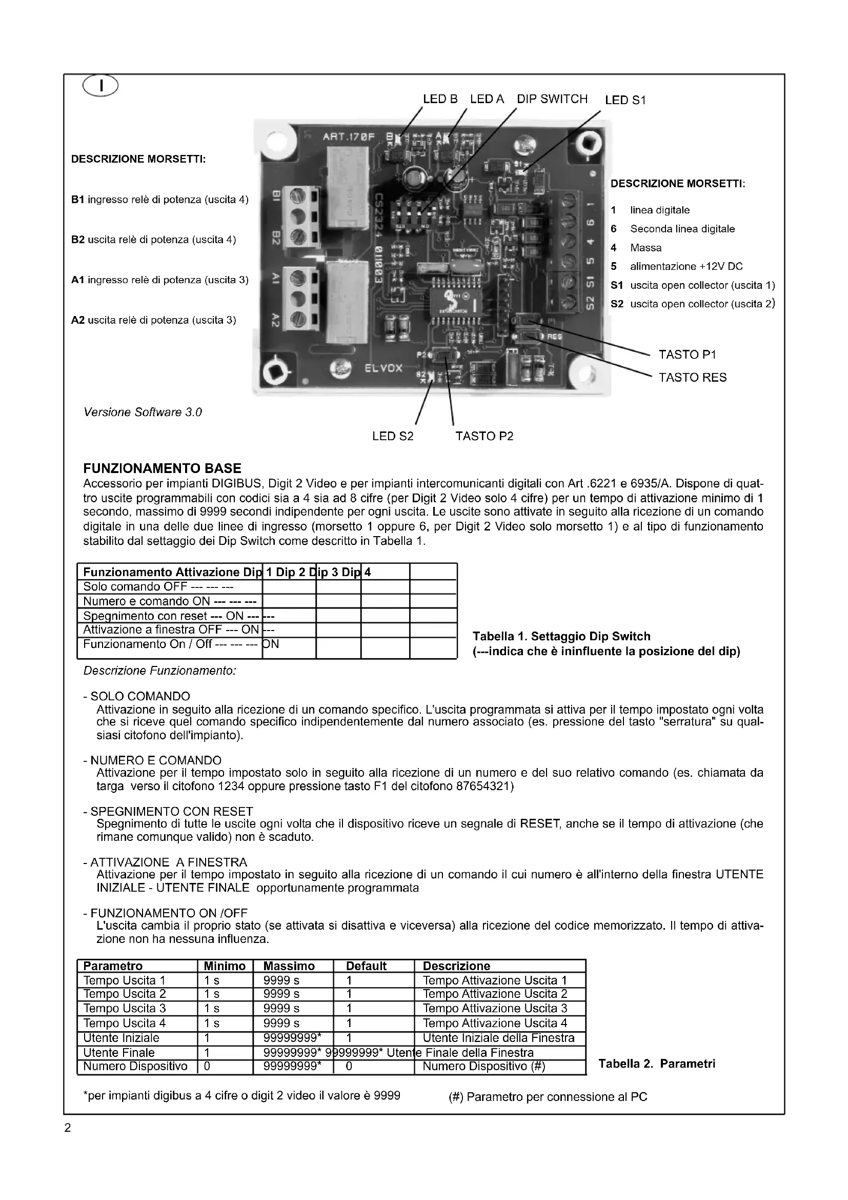 Il prodotto è conforme alla direttiva europea 2004/108/CE e successive. Product is according to EC Directive 2004/108/CE and following norms.2 DESCRIZIONE MORSETTI: B1 ingresso relè di potenza (uscita 4) B2 uscita relè di potenza (uscita 4) A1 ingresso relè di potenza (uscita 3) A2 uscita relè di potenza (uscita 3) FUNZIONAMENTO BASE Accessorio per impianti DIGIBUS, Digit 2 Video e per impianti intercomunicanti digitali con Art .6221 e 6935/A. Dispone di quat- tro uscite programmabili con codici sia a 4 sia ad 8 cifre (per Digit 2 Video solo 4 cifre) per un tempo di attivazione minimo di 1 secondo, massimo di 9999 secondi indipendente per ogni uscita. Le uscite sono attivate in seguito alla ricezione di un comando digitale in una delle due linee di ingresso (morsetto 1 oppure 6, per Digit 2 Video solo morsetto 1) e al tipo di funzionamento stabilito dal settaggio dei Dip Switch come descritto in Tabella 1. Funzionamento Attivazione Dip 1 Dip 2 Dip 3 Dip 4 Solo comando OFF --- --- --- Numero e comando ON --- --- --- Spegnimento con reset --- ON --- --- Attivazione a finestra OFF --- ON --- Funzionamento On / Off --- --- --- ON Descrizione Funzionamento: - SOLO COMANDO Attivazione in seguito alla ricezione di un comando specifico. L'uscita programmata si attiva per il tempo impostato ogni volta che si riceve quel comando specifico indipendentemente dal numero associato (es. pressione del tasto "serratura" su qual- siasi citofono dell'impianto).