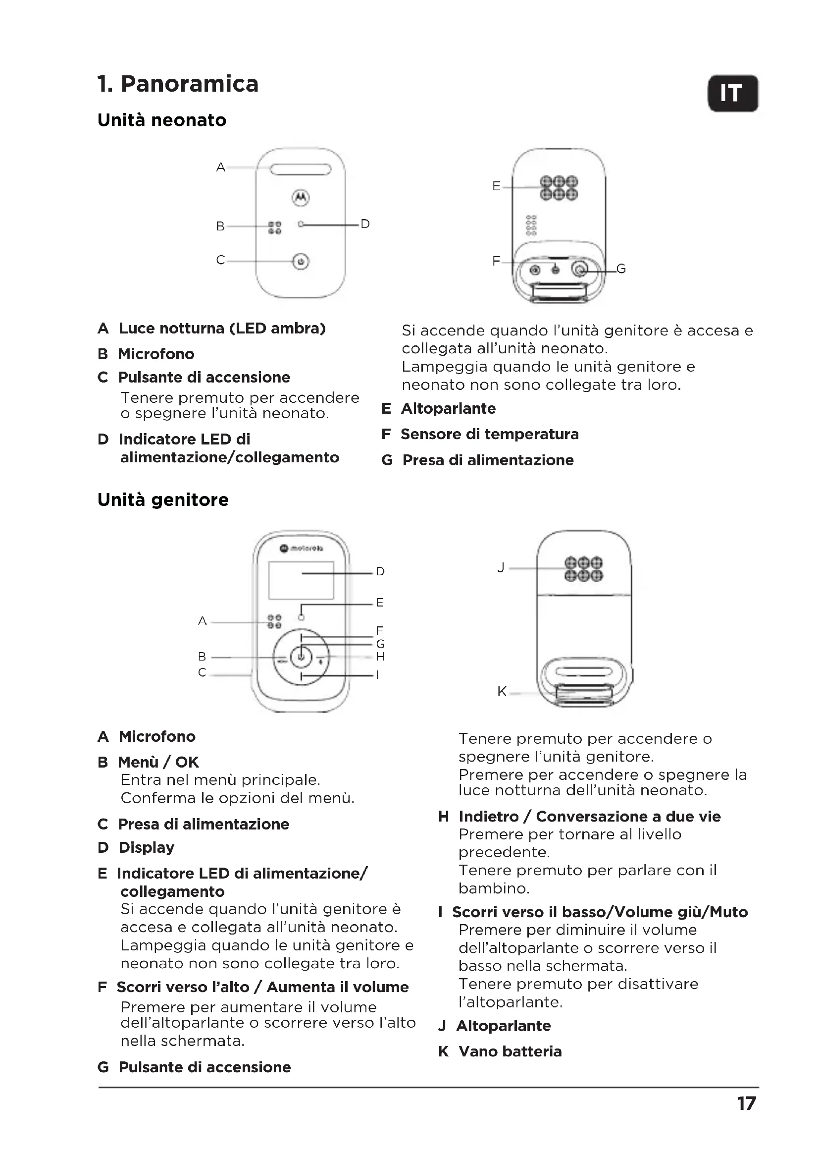 Tenere premuto per accendere o spegnere l’unità genitore. Premere per accendere o spegnere la luce notturna dell’unità neonato. H Indietro / Conversazione a due vie Premere per tornare al livello precedente. Tenere premuto per parlare con il bambino. I Scorri verso il basso/Volume giù/Muto Premere per diminuire il volume dell’altoparlante o scorrere verso il basso nella schermata. Tenere premuto per disattivare l’altoparlante. J Altoparlante K Vano batteria