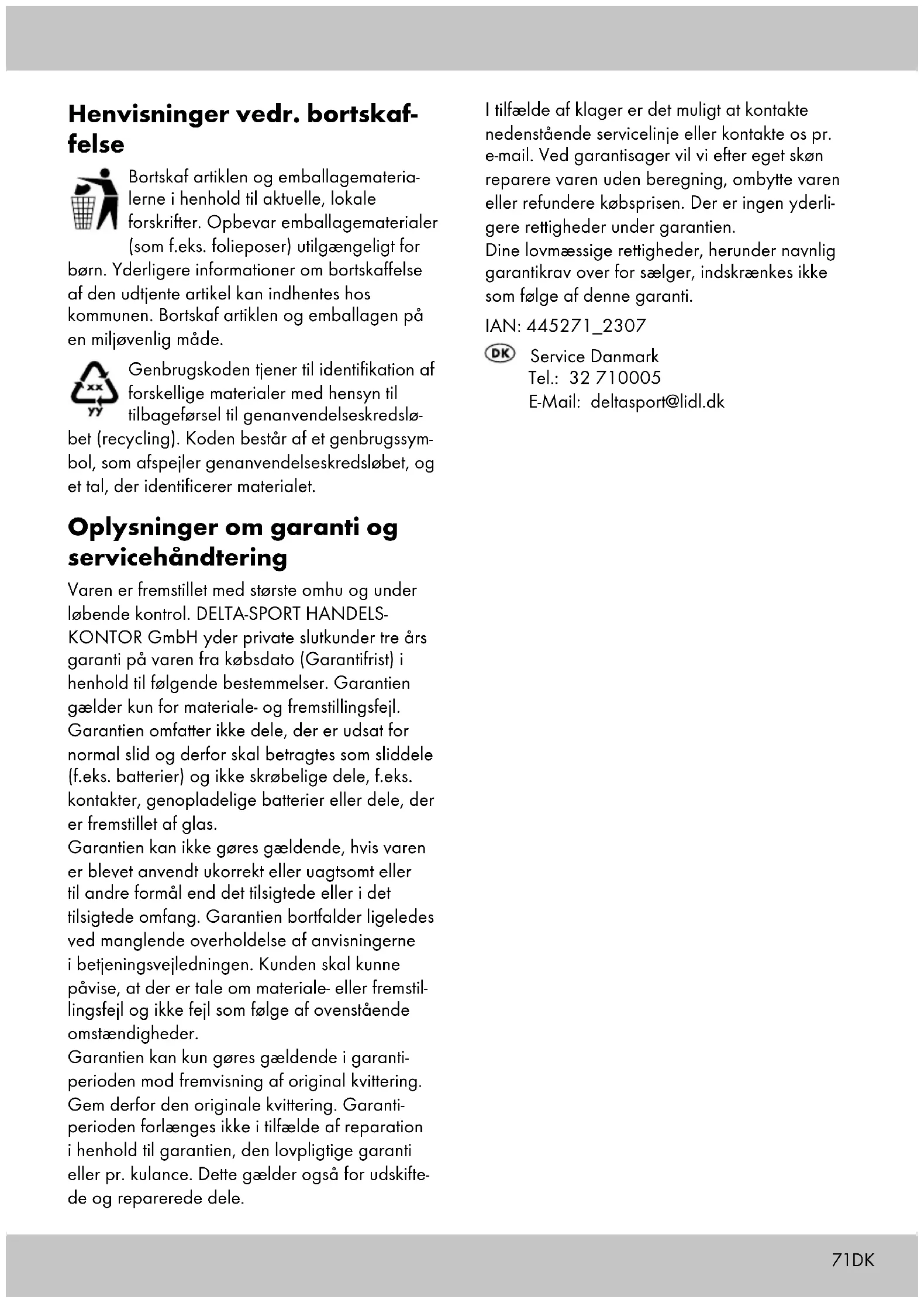 della pagaia. Indicazione: Gli anelli antigoccia rimangono sulle aste della pagaia. Trasporto Trasportare il kayak sempre in due. Conservazione, pulizia AVVERTENZA! Utilizzare solo prodotti per la cura del prodotto che non contengano acidi o benzina, e non utilizzare mai prodotti a base di silicone. Conservare l’articolo sempre asciutto, pulito e sgonfiato a temperatura ambiente lontano dalla portata dei roditori. Durante la conservazione le valvole devono essere sempre chiuse. Assicu- rarsi che riporre l’articolo non deformato, ma orizzontale. IT78 Presso la propria amministrazione comunale o cittadina è possibile ottenere ulteriori informa- zioni sullo smaltimento dell’articolo alla fine del suo periodo di impiego. Smaltire l’articolo e la confezione nel rispetto dell’ambiente. Il codice di riciclaggio serve per indicare i diversi materiali per il loro ritorno al ciclo di riutilizzo (recycling). Il codice è composto da un simbolo di riciclaggio per il ciclo di riutilizzo e da un numero che contraddi- stingue il materiale. Avvertenze sulla garanzia e sulla gestione dei servizi di assistenza L’articolo è stato prodotto con la massima cura e sotto un continuo controllo. DELTA-SPORT HANDELSKONTOR GmbH concede ai clienti finali privati, su questo articolo, tre anni di garanzia dalla data di acquisto (termine di garanzia) sulla base delle seguenti disposizioni. La garanzia vale per difetti del materiale o di fabbricazione. Questa garanzia non si estende a componenti del prodotto esposti a normale logorio, che possono pertanto essere considerati come componenti soggetti a usura (esempio capacità della batteria, calcificazione, lampade, pneumatici, filtri, spazzole…). La garanzia non si estende altresì a danni che si verificano su com- ponenti delicati (esempio interruttori, batterie, parti realizzate in vetro, schermi, accessori vari) nonché a danni derivanti dal trasporto o altri incidenti. Dalla presente garanzia sono escluse le richieste legate a casi di utilizzo non conforme oppure di abuso dell’articolo, oppure di utilizzo avvenuto non nell’ambito delle condizioni previste oppure del campo di impiego previsto, oppure in caso di non osservanza delle direttive riportate nelle istruzioni d’uso, a meno che il cliente non dimostri che sussista un vizio di materiale o di lavorazione che non sia riconducibile ad una delle circostanze riportate sopra. Le richieste di garanzia possono essere avanza- te solo entro il relativo termine, su presentazione dello scontrino originale di acquisto. Si prega quindi di conservare lo scontrino origi- nale. Il termine di garanzia non sarà prolungato a seguito di eventuali riparazioni effettuate sulla base della garanzia, della garanzia obbligato- ria prevista per legge oppure di accondiscen- denza. Ciò vale anche per le parti sostituite oppure riparate. In caso di contestazione rivolgersi dapprima alla hotline di assistenza sotto indicata oppure mettersi in contatto con noi via e-mail. Laddove sussista un caso coperto dalla garanzia, l’artico- lo sarà – a nostra discrezione – da noi riparato gratuitamente, sostituito oppure sarà rimborsato il prezzo di acquisto. Non sussistono ulteriori diritti derivanti dalla garanzia. I vostri diritti giuridici, in particolare i diritti di garanzia obbligatoria prevista dalla legge nei confronti del relativo venditore, non sono limitati dalla presente garanzia. IAN: 445271_2307 Assistenza Italia Tel.: 800781188 E-Mail: deltasport@lidl.it IT79 Szívből gratulálunk! Vásárlásával kiváló minőségű terméket válasz- tott. Használatba vétele előtt ismerkedjen meg a termékkel. Figyelmesen olvassa el az alábbi használati útmutatót. A terméket kizárólag az itt ismertetett módon, a rendeltetésének megfelelően használja. Gondo- san őrizze meg a használati útmutatót. A termék továbbadásakor adja át az összes kapcsolódó dokumentumot is. A jelen útmutató fontos ismeretekkel szolgál a termékkel, annak összeszerelésével, üzemelte- tésével és ápolásával kapcsolatban, illetve tar- talmazza a biztonsági szabályokat. Mivel a vízi sportok mindig kockázatosak, a termék alapos ismeretével adott esetben személyi sérüléseket vagy akár haláleseteket is megelőzhet. A csomag tartalma (A ábra) 1 x kajak (1) 1 x elülső fröccsenésvédő (2) 1 x elülső ülés (3) 1 x hátulsó fröccsenésvédő és ülés (4) 1 x háromszög alakú párna/lábtámasz (5) 2 x evező (6) 1 x középső elem (7) 2 x cseppfogó gyűrű (8) 1 x kötélkészlet (9) 1 x 200 cm (9a) 1 x 85 cm (9b) 3 x kétutas csavarszelep (10) 1 x ellenőrző vonalzó (11) 1 x javítókészlet (12) 1 x tárolótasak (13) 1 x vízálló táska (14) 1 x használati útmutató Műszaki adatok Méretek (felfújt állapotban): Kajak: kb. 325 x 76 x 48 cm (h x sz x m) Duplaevező: Hossz: kb. 220 cm Súly: kb. 8,2 kg Megengedett üzemi nyomás: kb. 0,05 bar (0,73 psi) Gyártás dátuma (hónap/év): 12/2023