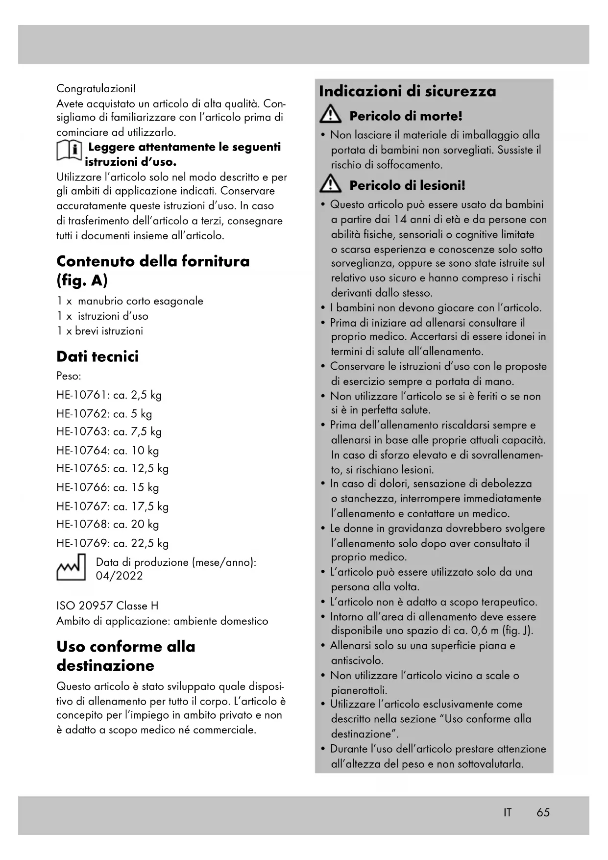 Importante: accertarsi che le cosce resti- no parallele tra loro e vicine. Portare in avanti il bacino, il busto resta dritto.70 Conservazione, pulizia In caso di mancato utilizzo, riporre l’articolo a temperatura ambiente in un luogo asciutto e pulito. Pulire solo con un panno umido e quindi asciu- gare. IMPORTANTE! Non utilizzare mai detergenti aggressivi. Smaltimento Smaltire l’articolo e i materiali dell’imballaggio in conformità con le direttive locali in vigore. I materiali di imballaggio, come ad esempio le pellicole, non devono essere alla portata dei bambini. Conservare i materiali di imballaggio in un luogo non raggiungibile per i bambini. Smaltire i prodotti e gli imballaggi in modo ecologico. Il codice di riciclaggio ha lo scopo di contrassegnare i diversi materiali al fine di introdurli nel ciclo di riutilizzo (recycling). Il codice è composto dal simbolo del riciclo, che dovrebbe rappresentare il ciclo del riutilizzo, e un numero che indica di che materiale si tratta. Avvertenze sulla garanzia e sulla gestione dei servizi di assistenza L’articolo è stato prodotto con la massima cura e sotto un continuo controllo. DELTA-SPORT HAN- DELSKONTOR GmbH concede ai clienti finali privati, su questo articolo, tre anni di garanzia dalla data di acquisto (termine di garanzia) sul- la base delle seguenti disposizioni. La garanzia vale solo per i vizi di materiale e di lavorazione. La garanzia non si estende alle parti soggette ad un normale degradamento e che siano quindi da considerarsi come pezzi soggetti ad usura (ad es. le batterie) né ai pezzi fragili come ad es. interruttori, batterie ricaricabili oppure pezzi in vetro. Dalla presente garanzia sono escluse le richieste legate a casi di utilizzo non conforme oppure di abuso dell’articolo, oppure di utilizzo avvenuto non nell’ambito delle condizioni previste oppure del campo di impiego previsto, oppure in caso di non osservanza delle direttive riportate nelle istruzioni d’uso, a meno che il cliente non dimostri che sussista un vizio di materiale o di lavorazione che non sia riconducibile ad una delle circostanze riportate sopra. Le richieste di garanzia possono essere avanza- te solo entro il relativo termine, su presentazione dello scontrino originale di acquisto. Si prega quindi di conservare lo scontrino originale. Il ter- mine di garanzia non sarà prolungato a seguito di eventuali riparazioni effettuate sulla base della garanzia, della garanzia obbligatoria prevista per legge oppure di accondiscendenza. Ciò vale anche per le parti sostituite oppure riparate. In caso di contestazione rivolgersi dapprima alla hotline di assistenza sotto indicata oppure mettersi in contatto con noi via e-mail. Laddove sussista un caso coperto dalla garanzia, l’artico- lo sarà – a nostra discrezione – da noi riparato gratuitamente, sostituito oppure sarà rimborsato il prezzo di acquisto. Non sussistono ulteriori diritti derivanti dalla garanzia. I vostri diritti giuridici, in particolare i diritti di garanzia obbligatoria prevista dalla legge nei confronti del relativo venditore, non sono limitati dalla presente garanzia. IAN: 404074_2110 (22,5 kg) IAN: 404075_2110 (20 kg) IAN: 404076_2110 (17,5 kg) IAN: 404077_2110 (15 kg) IAN: 404078_2110 (12,5 kg) IAN: 404080_2110 (10 kg) IAN: 404081_2110 (7,5 kg) IAN: 404083_2110 (5 kg) IAN: 404084_2110 (2,5 kg) Assistenza Italia Tel.: 02 36003201 E-Mail: deltasport@lidl.it IT71HU Szívből gratulálunk! Vásárlásával kiváló minőségű terméket válasz- tott. Használatba vétele előtt ismerkedjen meg a termékkel. Figyelmesen olvassa el az alábbi használati útmutatót. A terméket kizárólag az itt ismertetett módon, a rendeltetésének megfelelően használja. Gondo- san őrizze meg a használati útmutatót. A termék továbbadásakor adja át az összes kapcsolódó dokumentumot is. Csomag tartalma (A ábra) 1 x hatszögletű súlyzó 1 x használati útmutató 1 x rövid útmutató Műszaki adatok Tömeg: HE-10761: kb. 2,5 kg HE-10762: kb. 5 kg HE-10763: kb. 7,5 kg HE-10764: kb. 10 kg HE-10765: kb. 12,5 kg HE-10766: kb. 15 kg HE-10767: kb. 17,5 kg HE-10768: kb. 20 kg HE-10769: kb. 22,5 kg Gyártási dátum (hónap/év): 04/2022 ISO 20957 H osztály Alkalmazási terület: otthoni használat Rendeltetésszerű használat A terméket olyan edzőeszközként fejlesztettük ki, amellyel az egész testét edzheti. A terméket magánjellegű használatra tervezték, az gyógyá- szati, üzleti és kereskedelmi célú felhasználásra nem alkalmas. Biztonsági utasítások Életveszély!