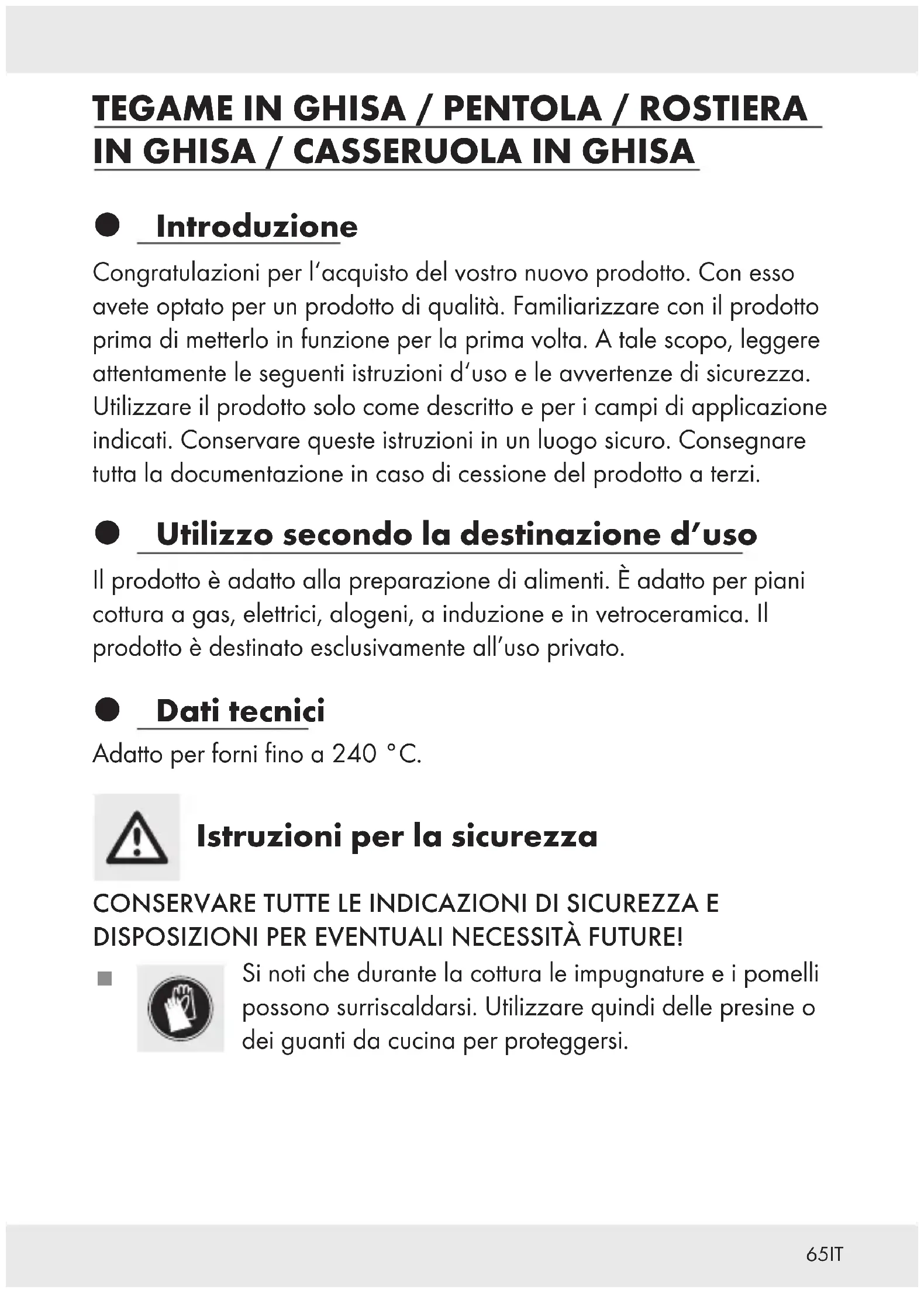 Introduzione Congratulazioni per l‘acquisto del vostro nuovo prodotto. Con esso avete optato per un prodotto di qualità. Familiarizzare con il prodotto prima di metterlo in funzione per la prima volta. A tale scopo, leggere attentamente le seguenti istruzioni d‘uso e le avvertenze di sicurezza. Utilizzare il prodotto solo come descritto e per i campi di applicazione indicati. Conservare queste istruzioni in un luogo sicuro. Consegnare tutta la documentazione in caso di cessione del prodotto a terzi. Utilizzo secondo la destinazione d’uso Il prodotto è adatto alla preparazione di alimenti. È adatto per piani cottura a gas, elettrici, alogeni, a induzione e in vetroceramica. Il prodotto è destinato esclusivamente all’uso privato. Dati tecnici Adatto per forni fino a 240°C. Istruzioni per la sicurezza CONSERVARE TUTTE LE INDICAZIONI DI SICUREZZA E DISPOSIZIONI PER EVENTUALI NECESSITÀ FUTURE!