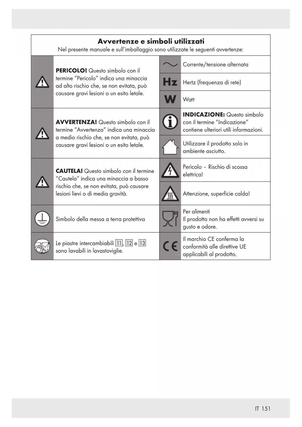 Avvertenze e simboli utilizzati Nel presente manuale e sull’imballaggio sono utilizzate le seguenti avvertenze: PERICOLO! Questo simbolo con il termine “Pericolo” indica una minaccia ad alto rischio che, se non evitata, può causare gravi lesioni o un esito letale. Corrente/tensione alternata Hertz (frequenza di rete) Watt AVVERTENZA! Questo simbolo con il termine “Avvertenza” indica una minaccia a medio rischio che, se non evitata, può causare gravi lesioni o un esito letale. INDICAZIONE: Questo simbolo con il termine “Indicazione” contiene ulteriori utili informazioni. Utilizzare il prodotto solo in ambiente asciutto. CAUTELA! Questo simbolo con il termine “Cautela” indica una minaccia a basso rischio che, se non evitata, può causare lesioni lievi o di media gravità. Pericolo– Rischio di scossa elettrica! Attenzione, superficie calda! Simbolo della messa a terra protettiva Per alimenti Il prodotto non ha effetti avversi su gusto e odore. Le piastre intercambiabili [], [] e [] sono lavabili in lavastoviglie. Il marchio CE conferma la conformità alle direttive UE applicabili al prodotto.152