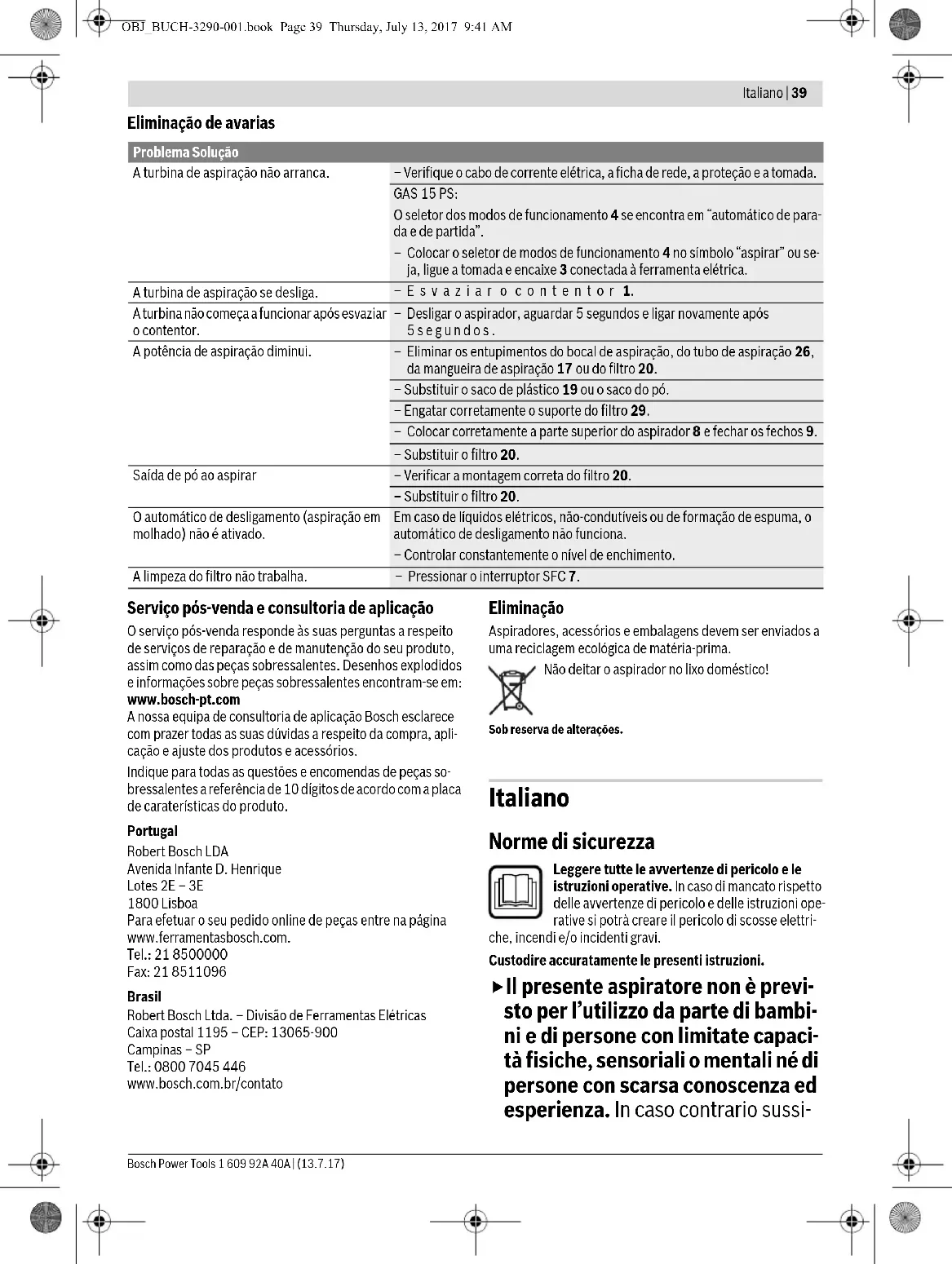 Substitua um filtro danificado. – Coloque o suporte do filtro 29 no filtro limpo/novo 20. – Encaixe o suporte do filtro 29 juntamente com o filtro 20 no cesto do filtro 30 e rode o suporte do filtro 29 até ao ba- tente no sentido de rotação “ ”. – Recolocar a parte superior do aspirador 8 e fechar os fe- chos 9. Depósito – Limpar o depósito 1 de tempos em tempos com um produ- to de limpeza de tipo comercial, não abrasivo, e permita que possa secar. Arrecadação e transporte (veja figura I) – Enrole o cabo de corrente elétrica em volta do punho 6. – Insira os tubos de aspiração 26 nos suportes 12. – Coloque a mangueira de aspiração 17 à volta da parte su- perior do aspirador e engate ao laço de suporte 16 no su- porte 11. – O aspirador só deve ser transportado pelo punho de trans- porte 6. – Depositar o aspirador em um recinto seco e proteja-o con- tra uso não-autorizado. – Para fixar os rolos de guia 10 é necessário premir o travão do rolo de guia 14 com o pé. OBJ_BUCH-3290-001.book Page 38 Thursday, July 13, 2017 9:41 AMItaliano | 39 Bosch Power Tools 1 609 92A 40A | (13.7.17) Eliminação de avarias Serviço pós-venda e consultoria de aplicação O serviço pós-venda responde às suas perguntas a respeito de serviços de reparação e de manutenção do seu produto, assim como das peças sobressalentes. Desenhos explodidos e informações sobre peças sobressalentes encontram-se em: www.bosch-pt.com A nossa equipa de consultoria de aplicação Bosch esclarece com prazer todas as suas dúvidas a respeito da compra, apli- cação e ajuste dos produtos e acessórios. Indique para todas as questões e encomendas de peças so- bressalentes a referência de 10 dígitos de acordo com a placa de caraterísticas do produto. Portugal Robert Bosch LDA Avenida Infante D. Henrique Lotes 2E – 3E 1800 Lisboa Para efetuar o seu pedido online de peças entre na página www.ferramentasbosch.com. Tel.: 21 8500000 Fax: 21 8511096 Brasil Robert Bosch Ltda. – Divisão de Ferramentas Elétricas Caixa postal 1195 – CEP: 13065-900 Campinas – SP Tel.: 0800 7045 446 www.bosch.com.br/contato Eliminação Aspiradores, acessórios e embalagens devem ser enviados a uma reciclagem ecológica de matéria-prima. Não deitar o aspirador no lixo doméstico! Sob reserva de alterações. Italiano Norme di sicurezza Leggere tutte le avvertenze di pericolo e le istruzioni operative. In caso di mancato rispetto delle avvertenze di pericolo e delle istruzioni ope- rative si potrà creare il pericolo di scosse elettri- che, incendi e/o incidenti gravi. Custodire accuratamente le presenti istruzioni. Il presente aspiratore non è previ- sto per l’utilizzo da parte di bambi- ni e di persone con limitate capaci- tà fisiche, sensoriali o mentali né di persone con scarsa conoscenza ed esperienza. In caso contrario sussi- Problema Solução A turbina de aspiração não arranca. – Verifique o cabo de corrente elétrica, a ficha de rede, a proteção e a tomada. GAS 15 PS: O seletor dos modos de funcionamento 4 se encontra em “automático de para- da e de partida”. – Colocar o seletor de modos de funcionamento 4 no símbolo “aspirar” ou se- ja, ligue a tomada e encaixe 3 conectada à ferramenta elétrica. A turbina de aspiração se desliga. –Esvaziar o contentor 1. A turbina não começa a funcionar após esvaziar o contentor. – Desligar o aspirador, aguardar 5 segundos e ligar novamente após 5segundos. A potência de aspiração diminui. – Eliminar os entupimentos do bocal de aspiração, do tubo de aspiração 26, da mangueira de aspiração 17 ou do filtro 20. – Substituir o saco de plástico 19 ou o saco do pó. – Engatar corretamente o suporte do filtro 29. – Colocar corretamente a parte superior do aspirador 8 e fechar os fechos 9. – Substituir o filtro 20. Saída de pó ao aspirar – Verificar a montagem correta do filtro 20. – Substituir o filtro 20. O automático de desligamento (aspiração em molhado) não é ativado. Em caso de líquidos elétricos, não-condutíveis ou de formação de espuma, o automático de desligamento não funciona. – Controlar constantemente o nível de enchimento. A limpeza do filtro não trabalha. – Pressionar o interruptor SFC 7. OBJ_BUCH-3290-001.book Page 39 Thursday, July 13, 2017 9:41 AM40 | Italiano 1 609 92A 40A | (13.7.17) Bosch Power Tools ste il pericolo di un impiego errato e di infortuni. Sorvegliare i bambini. In questo mo- do è possibile evitare che i bambini giochino con l’aspiratore. Non aspirare sostanze dannose per la salute, p. es. polvere di legno di faggio, di quercia, polvere minerale, amianto. Queste so- stanze sono considerate cancerogene. InformateVi relativamente alle norme/leggi in vigore nel Vostro paese riguardanti il trattamento di polveri nocive per la salute. Utilizzare l’aspiratore soltanto quando si disponga di adeguate in- formazioni sul suo impiego. Informandosi accuratamente al riguardo si ridurrà il rischio di comandi errati e lesioni. L’aspiratore è adatto per l’aspira- zione di materiali asciutti e, trami- te misure adatte, anche per l’aspirazione di liquidi. La pe- netrazione di liquidi aumenta il rischio di una scossa elettrica. Non aspirare con l’aspiratore liquidi infiammabili oppu- re esplosivi, come ad esempio benzina, olio, alcool, sol- venti. Non aspirare polvere bollenti oppure brucianti. Non mettere in funzione l’aspiratore in locali soggetti al pericolo di esplosioni. Le polveri, i vapori oppure i liquidi si possono infiammare oppure esplodere. Utilizzare la presa di corrente esclusivamente per gli scopi stabi- liti nelle istruzioni per l’uso. Spegnere immediatamente l’aspi- ratore non appena fuoriesce schiu- ma oppure acqua e svuotare il serbatoio. In caso contrario l’aspiratore potrebbe venire danneggiato. Custodire l’aspiratore al riparo dal- la pioggia e dall’umidità. La pene- trazione di acqua nella parte superiore dell’a