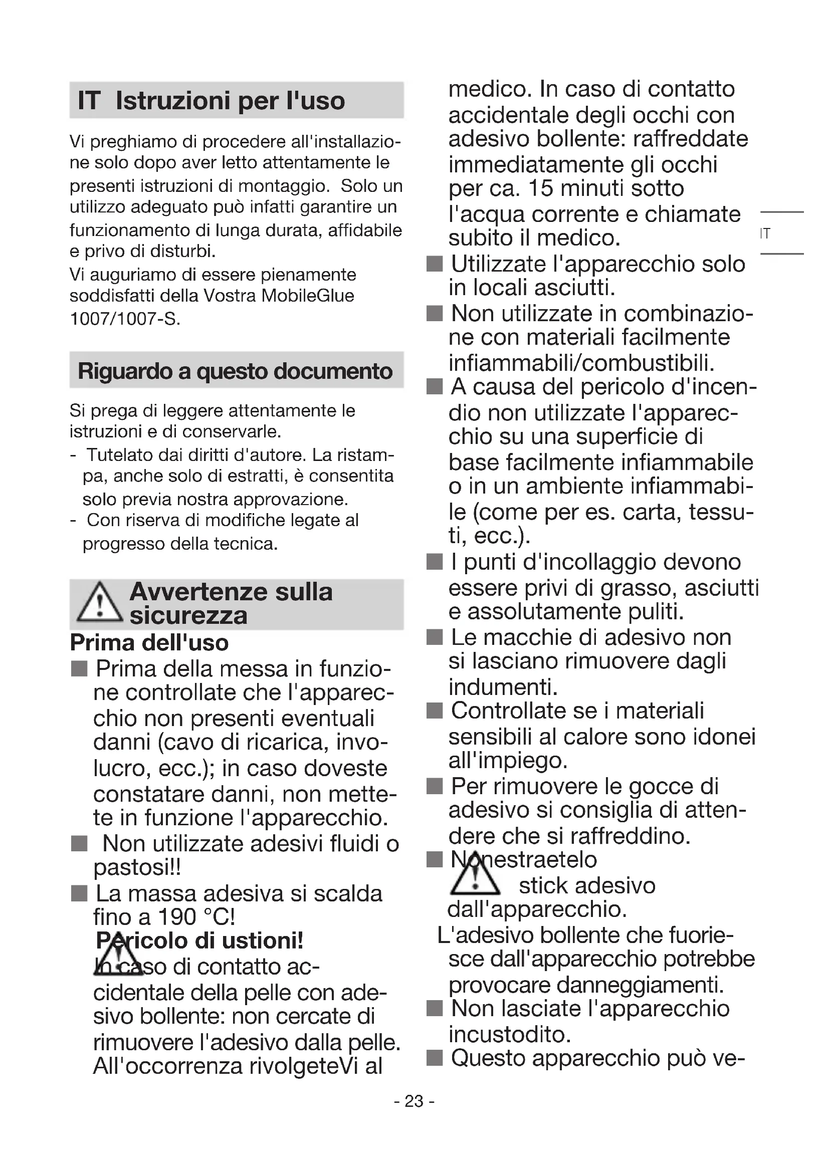 FABRIEKS JAAR GARANTIE FABRIEKS JAAR GARANTIE FABRIEKS JAAR GARANTIE- 23 - IT Istruzioni per l'uso Vi preghiamo di procedere all'installazio- ne solo dopo aver letto attentamente le presenti istruzioni di montaggio. Solo un utilizzo adeguato può infatti garantire un funzionamento di lunga durata, affidabile e privo di disturbi. Vi auguriamo di essere pienamente soddisfatti della Vostra MobileGlue 1007/1007-S. Riguardo a questo documento Si prega di leggere attentamente le istruzioni e di conservarle. - Tutelato dai diritti d'autore. La ristam- pa, anche solo di estratti, è consentita solo previa nostra approvazione. - Con riserva di modifiche legate al progresso della tecnica. Prima dell'uso Prima della messa in funzio- ne controllate che l'apparec- chio non presenti eventuali danni (cavo di ricarica, invo- lucro, ecc.); in caso doveste constatare danni, non mette- te in funzione l'apparecchio. Non utilizzate adesivi fluidi o pastosi!! La massa adesiva si scalda fino a 190 °C! Pericolo di ustioni! In caso di contatto ac- cidentale della pelle con ade- sivo bollente: non cercate di rimuovere l'adesivo dalla pelle. All'occorrenza rivolgeteVi al Avvertenze sulla sicurezza medico. In caso di contatto accidentale degli occhi con adesivo bollente: raffreddate immediatamente gli occhi per ca. 15 minuti sotto l'acqua corrente e chiamate subito il medico. Utilizzate l'apparecchio solo in locali asciutti. Non utilizzate in combinazio- ne con materiali facilmente infiammabili/combustibili. A causa del pericolo d'incen- dio non utilizzate l'apparec- chio su una superficie di base facilmente infiammabile o in un ambiente infiammabi- le (come per es. carta, tessu- ti, ecc.). I punti d'incollaggio devono essere privi di grasso, asciutti e assolutamente puliti. Le macchie di adesivo non si lasciano rimuovere dagli indumenti. Controllate se i materiali sensibili al calore sono idonei all'impiego. Per rimuovere le gocce di adesivo si consiglia di atten- dere che si raffreddino. Non estraete lo stick adesivo dall'apparecchio. L'adesivo bollente che fuorie- sce dall'apparecchio potrebbe provocare danneggiamenti. Non lasciate l'apparecchio incustodito. Questo apparecchio può ve- IT- 24 - nire utilizzato da bambini di età superiore agli 8 anni e da persone con capacità fisiche, sensoriali o mentali ridotte o con esperienza e conoscenze insufficienti solo sotto sorve- glianza o se sono stati/e istru- iti circa il sicuro utilizzo dell'apparecchio e i possibili pericoli che da esso risultano. Non lasciate giocare i bambini con l'apparecchio. Un perfetto funzionamento viene garantito solo se ven- gono impiegati stick originali STEINEL. Cavo di caricamento USB Mantenere pulito il cavo di ricarica. Esiste il rischio di scosse elettriche dovute allo sporco. Conservate l'apparecchio in un ambiente con temperatura compresa tra 0 °C e 35 °C. Caricare l'unità solo con il cavo di ricarica USB in do- tazione (tipo 15.3841). Non riaricare batterie estranee. Sussiste altrimenti il rischio di incendio ed esplosione. Accumulatore Non aprite mai l'apparecchio o l'accumulatore. Pericolo di corto circuito. L'accumulatore agli ioni di litio può venire caricato in ogni momento senza che ciò ne ri- duca la durata. Un'interruzio- ne del processo di carica non danneggia l'accumulatore. In caso l'apparecchio non venga utilizzato per lungo tempo, ritiratelo con l'accu- mulatore caricato. Ciò pro- lunga la durata dell'accumu- latore agli ioni di litio. In caso di danneggiamento o di utilizzo inappropriato dell'accumulatore potrebbero fuoriuscire vapori o liquido elettrolitico. In caso di ma- lessere consultate un medico e provvedete a far entrare aria pulita. I vapori potrebbe- ro irritare le vie respiratorie. Utilizzo adeguato allo scopo Questo apparecchio elettrico è destinato esclusivamente all'incollaggio senza solventi di componenti per modellismo e materiali da bricolage comunemente impiegati per l'uso domestico. Campo di applicazione Stick a termoadesivazione con batteria agli ioni di litio. L'ideale incollatutto per lavori di riparazione, decorazione e bricolage. Adatto per: carta, cartoncino, sughero, legno, pelle, tessuti, plastica, ceramica, materiale espanso, mattonelle... Descrizione apparecchio Cavo di ricarica USB Display a LED Presa per il cavo di ricarica Pulsante ON/OFF Detrazione per mangimi Colla stick- 25 - Funzionamento e utilizzo ■ Alla prima messa in esercizio caricate completamente l'apparecchio (2-3 ore) ai fini di prolungare la durata dell'accumulatore. (vedi carica/fun- zionamento) ■ Inserite lo stick adesivo nel canale di riscaldamento sul lato posteriore. ■ Alla prima messa in esercizio è neces- sario azionare più volte l'avanzamento per riempire di adesivo la camera di riscaldamento. All'occorrenza occorre spingere brevemente lo stick adesivo. ■ Per evitare che l'apparecchio si ac- cenda involontariamente, il pulsante deve essere premuto per circa 2 secondi. Il LED verde lampeggia per 15 secondi. ■ Azionate l'avanzamento e applicate l'adesivo su un lato. ■ Fate forte pressione sui materiali da incollare ed eventualmente corregge- tene la posizione. ■ Già dopo brevissimo tempo (ca. 2 minuti) il punto d'incollaggio è completamente pronto a sopportare sollecitazioni! ■ In caso di pezzi di lungi e/o di larga superficie si consiglia un incollaggio a punti. ■ In tal caso si deve solo badare che l'adesivo bollente venga applicato sulla superficie di base e non sul polistirolo. ■ Per l'incollaggio di tessuti o materiali affini si consiglia di applicare l'adesi- vo bollente in "linee a serpente". ■ Dopo l'utilizzo fate raffreddare l'appa- recchio. Carica / funzionamento Alla consegna l'accumulatore della MobileGlue 1007/1007-S è parzialmente carico. Durante il processo di carica dell'ac- cumulatore non è possibile usare la MobileGlue 1007/1007-S. Un'interruzione del processo di carica non danneggia l'accumulatore. Esso può venire caricato in ogni momento senza che ciò ne r