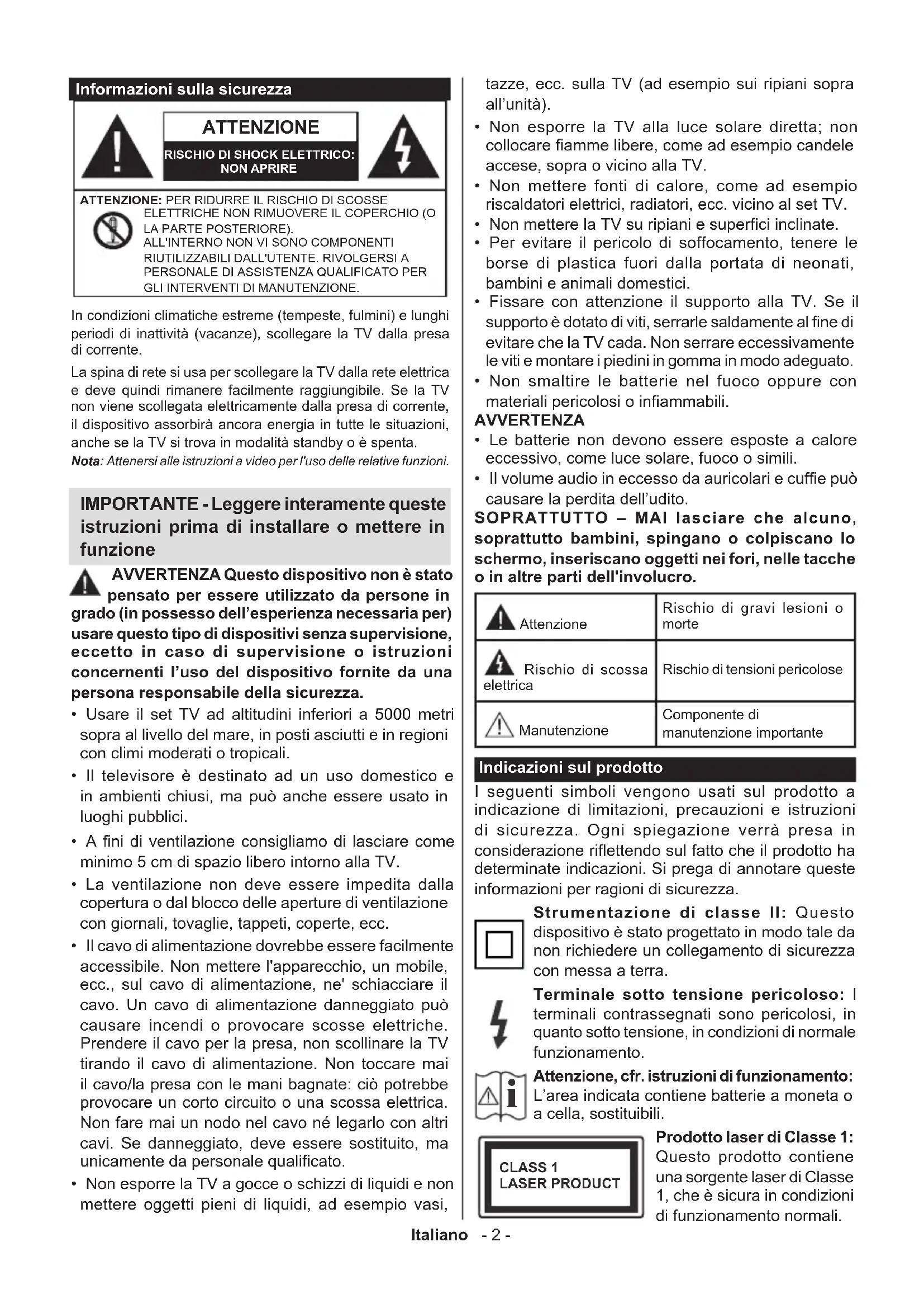 - L'apparecchio è adatto solo per il montaggio ad altezze ≤ 2m. Qualora la TV venga conservata e spostata, valgono le stesse considerazioni indicate più sopra. – – – – – – – – – – – – Un apparecchio collegato alla messa a terra di protezione dell’installazione dell’edificio attraverso le connessioni di CORRENTE o attraverso un altro apparecchio con un collegamento di messa a terra di protezione – e ad un sistema televisivo di distribuzione che usa un cavo coassiale può, in alcuni casi, creare rischi di incendio. Il collegamento a un sistema di distribuzione via televisione deve quindi essere eseguito tramite un dispositivo che fornisce isolamento elettrico al di sotto di una certa gamma di frequenza (isolatore galvanico) AVVERTENZE PER