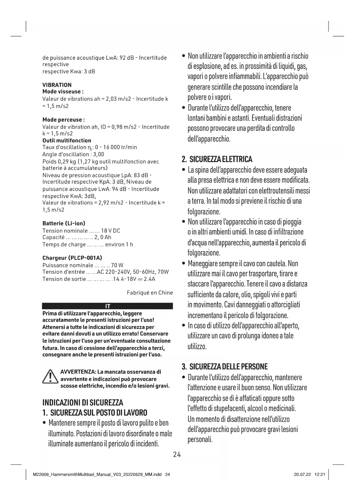 - Durante l‘utilizzo dell‘apparecchio, mantenere l‘attenzione e usare il buon senso. Non utilizzare l‘apparecchio se di è affaticati oppure sotto l‘effetto di stupefacenti, alcool o medicinali. Un momento di disattenzione nell‘utilizzo dell‘apparecchio può provocare gravi lesioni personali. M22606_HammersmithMultitool_Manual_V03_20220629_MM.indd 24M22606_HammersmithMultitool_Manual_V03_20220629_MM.indd 24 20.07.22 12:2120.07.22 12:2124