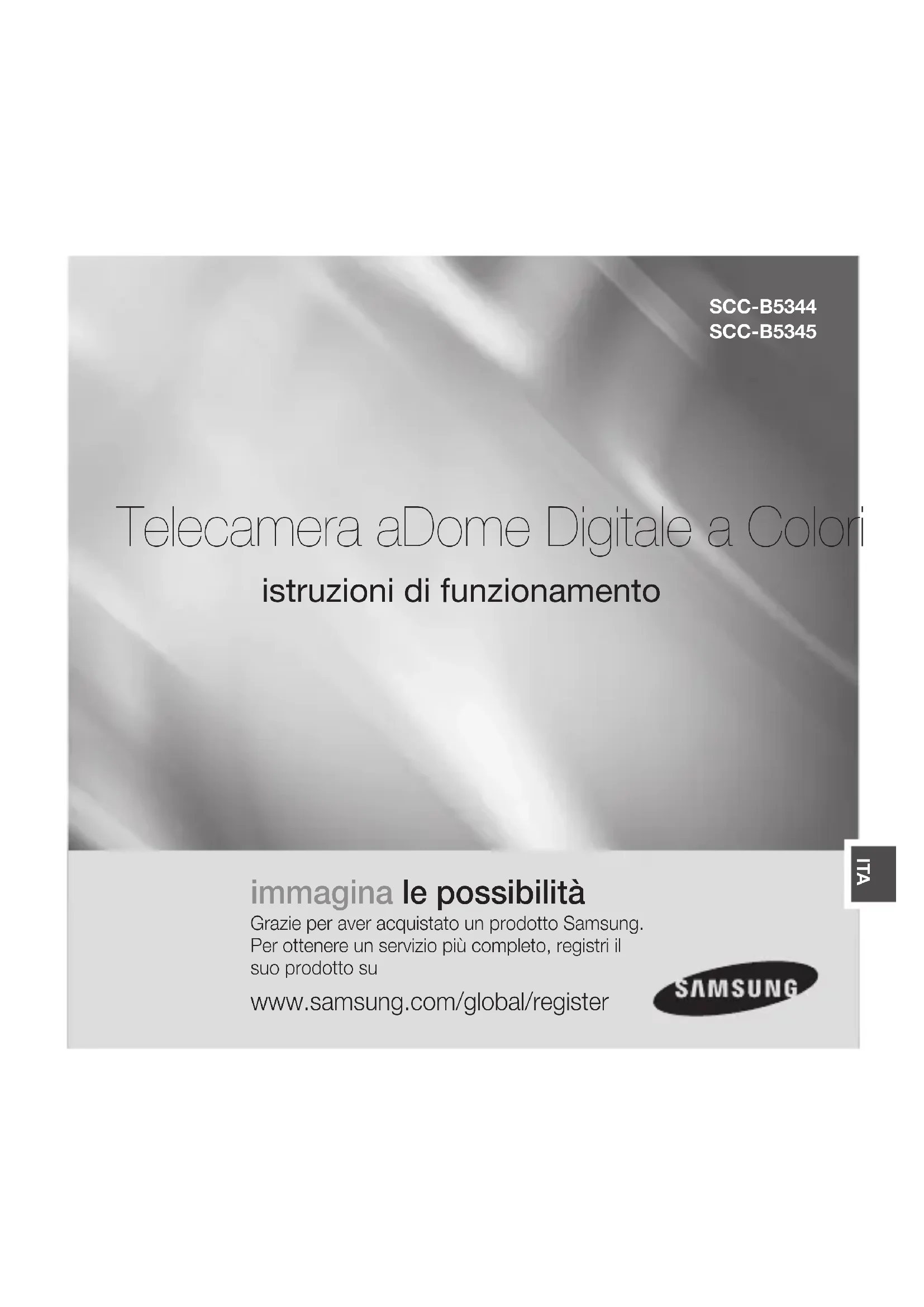 0 Vp-p, 75ohm, cablaggio) Obiettivo Auto Iris (DC) / Lunghezza focale: da 2,9 ~ 10,0mm / Raggio apertura 1,2 Funzione PAN Raggio: da 0 a 355° (100 gradi in senso orario e 255 in senso antiorario) Funzione INCLINAZIONE Raggio: da 0 a 90° Controlli Line lock (LL) Sens-up; Otturatore a bassa velocità (LSS) Rotazione Orizzontale (H-REV) Rotazione Verticale (V-REV) Compensazione luce di fondo (BLC) Flickerless (FL) Passaggio dalle modalità a colori a bianco e nero (D/N) Bilanciamento automatico del bianco (AWB) Riduzione digitale del rumore (DNR) Compensazione CCD dei difetti automatica Colore del Prodotto SCC-B5344P/B5345P : Bianco Temperatura di esercizio da -10°C a +50°C Umidità di esercizio Fino al 90% Dimensioni 128(Ø) x 91(H)mm Peso 327g B5344_B5345-00687D(00).indb 15 2008-09-05 오전 10:40:54Corretto smaltimento del prodotto (riuti elettrici ed elettronici) (Applicabile in i paesi dell’Unione Europea e in quelli con sistema di raccolta differenziata) Il marchio riportato sul prodotto o sulla sua documentazione indica che il prodotto non deve essere smaltito con altri riuti domestici al termine del ciclo di vita. Per evitare eventuali danni all’ambiente o alla salute causati dall’inopportuno smaltimento dei riuti, si invita l’utente a separare questo prodotto da altri tipi di riuti e di riciclarlo in maniera responsabile per favorire il riutilizzo sostenibile delle risorse materiali. Gli utenti domestici sono invitati a contattare il rivenditore presso il quale è stato acquistato il prodotto o l’ufcio locale preposto per tutte le informazioni relative alla raccolta differenziata e al riciclaggio per questo tipo di prodotto. Gli utenti aziendali sono invitati a contattare il proprio fornitore e vericare i termini e le condizioni del contratto di acquisto. Questo prodotto non deve essere smaltito unitamente ad altri riuti commerciali. B5344_B5345-00687D(00).indb 16 2008-09-05 오전 10:40:54SCC-B5344 SCC-B5345 kullanım talimatları Dijital Renkli Dome Kamera olanakları hayal edin Bir Samsung ürünü aldığınız için teşekkür ederiz. Daha eksiksiz bir hizmet alabilmek için lütfen ürününüzü www.samsung.com/global/register adresinden kaydettirinr TUR B5344_B5345-00687D(00).indb 1 2008-09-05 오전 10:40:552