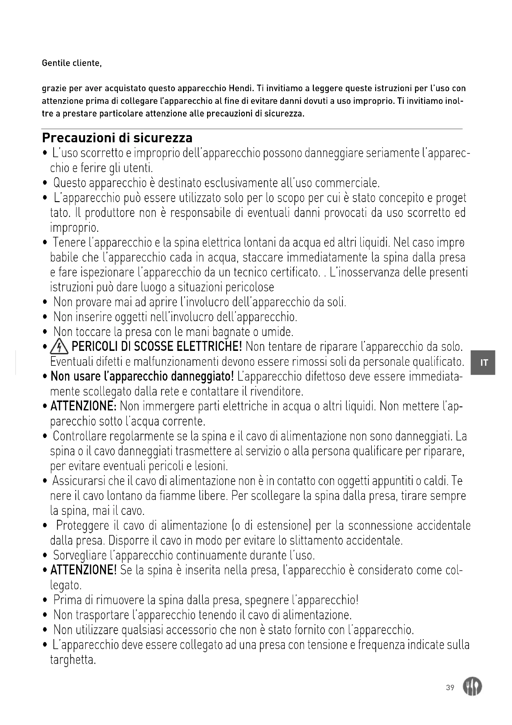 Gentile cliente, grazie per aver acquistato questo apparecchio Hendi. Ti invitiamo a leggere queste istruzioni per l’uso con attenzione prima di collegare l’apparecchio al fine di evitare danni dovuti a uso improprio. Ti invitiamo inol- tre a prestare particolare attenzione alle precauzioni di sicurezza. Precauzioni di sicurezza