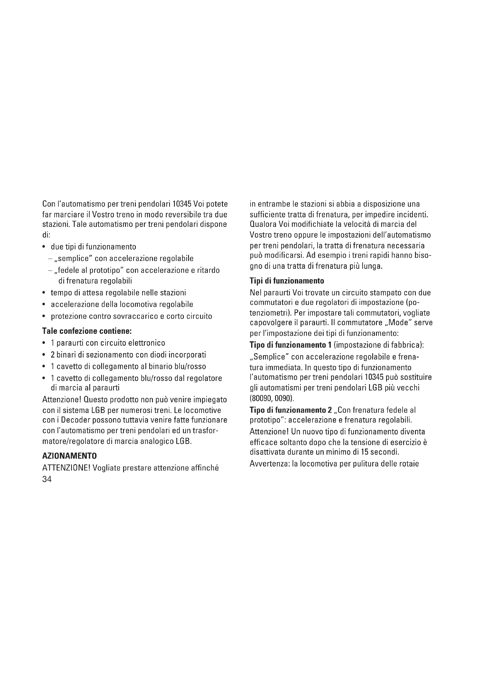 - Nuove impostazioni di durata della sosta e di accelerazione/ritardo divengono efficaci solo dopo una fermata nella successiva stazione. A tale scopo non c’è bisogno che venga disattivata la tensione di esercizio. Protezione dal sovraccarico Tale automatismo per treni pendolari è equipaggiato con una protezione dal sovraccarico, la quale proteg- ge da guasti in presenza di corto circuito e sovrac- carico. Quando scorre una corrente di più di 3 A, l’automatismo per treni pendolari si disattiva durante 10 secondi. Questa disattivazione per sovracorrente funziona però soltanto quando il trasformatore/re- golatore collegato può erogare come minimo 3 A di38 corrente di trazione. Dopo 10 secondi l’automatismo per treni pendolari si riattiva nuovamente. Qualora il Vostro trasformatore eroghi meno di 3 A, in caso di un corto circuito viene fatta scattare la prote- zione da sovraccarico del trasformatore LGB. Massima corrente di trazione Con tale automatismo per treni pendolari possono venire eserciti dei treni con un fabbisogno di corrente sino a 3 A. Locomotive con effetti sonori, in doppia trazione oppure con numerose carrozze illuminate in alcuni casi hanno bisogno di più di 3 A (si veda protezione dal sovraccarico). Minima tensione di marcia L’automatismo per treni pendolari funziona solamente qualora la tensione di esercizio ammonti come minimo a 10 volt.