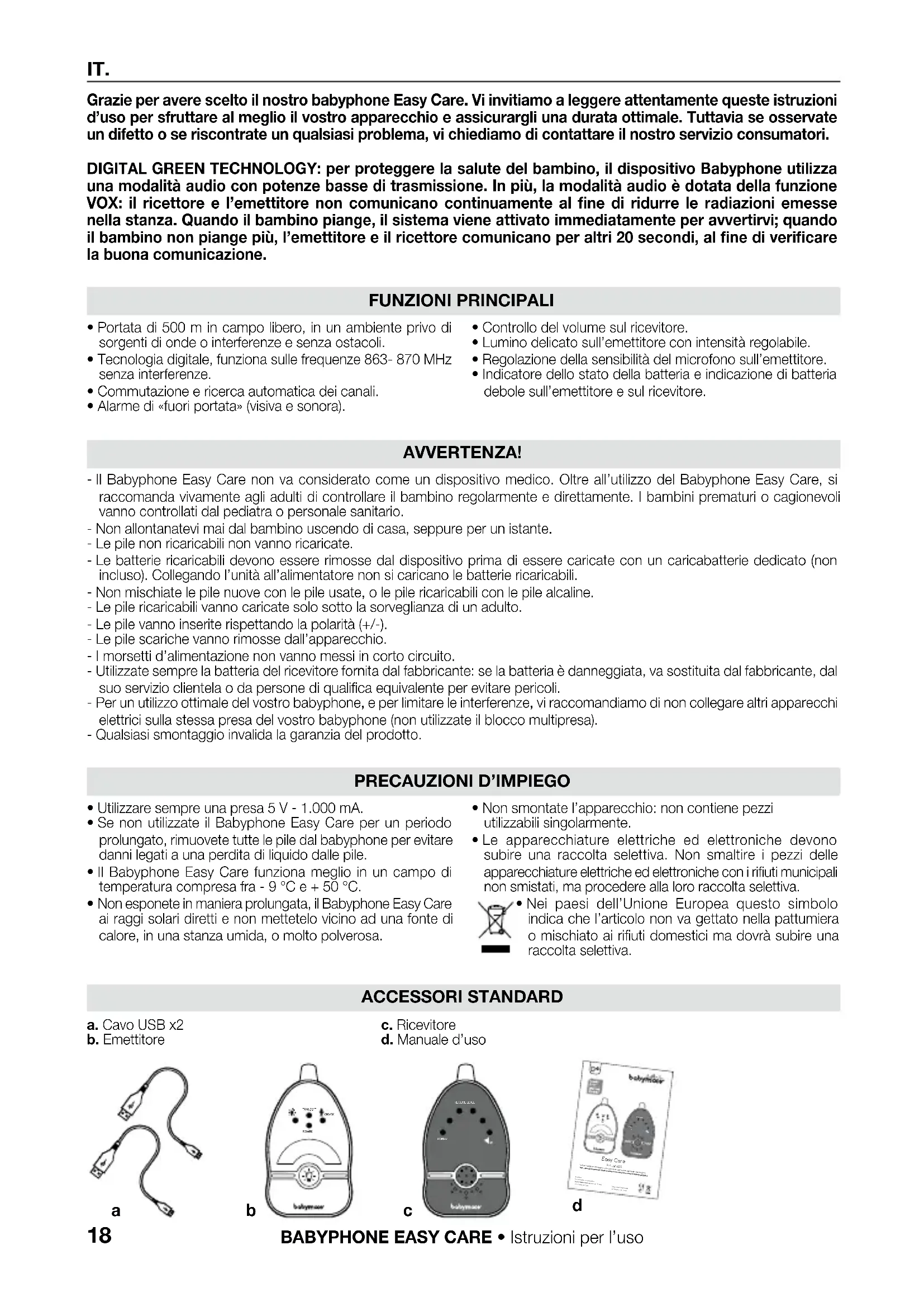 IT. Grazie per avere scelto il nostro babyphone Easy Care. Vi invitiamo a leggere attentamente queste istruzioni d’uso per sfruttare al meglio il vostro apparecchio e assicurargli una durata ottimale. Tuttavia se osservate un difetto o se riscontrate un qualsiasi problema, vi chiediamo di contattare il nostro servizio consumatori. DIGITAL GREEN TECHNOLOGY: per proteggere la salute del bambino, il dispositivo Babyphone utilizza una modalità audio con potenze basse di trasmissione. In più, la modalità audio è dotata della funzione VOX: il ricettore e l’emettitore non comunicano continuamente al fine di ridurre le radiazioni emesse nella stanza. Quando il bambino piange, il sistema viene attivato immediatamente per avvertirvi; quando il bambino non piange più, l’emettitore e il ricettore comunicano per altri 20 secondi, al fine di verificare la buona comunicazione. FUNZIONI PRINCIPALI