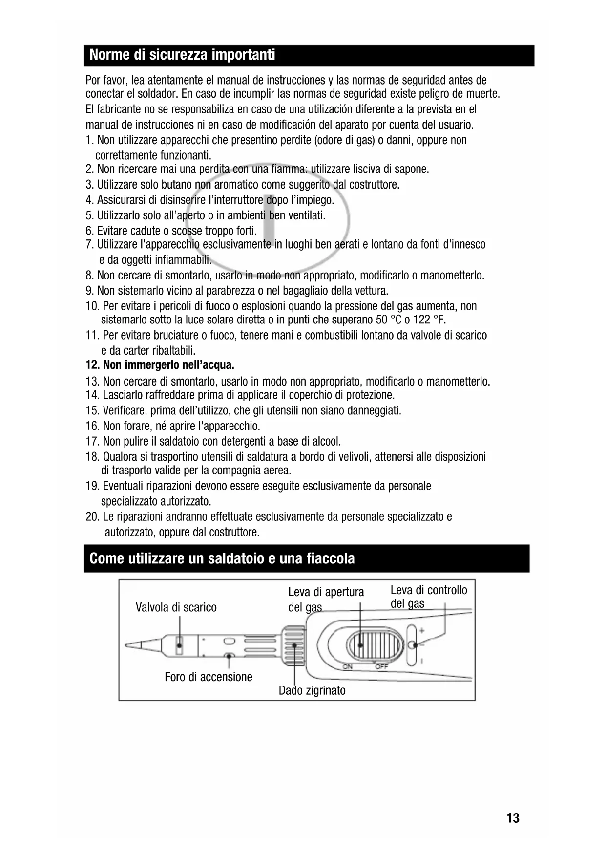autorizzato, oppure dal costruttore. Norme di sicurezza importanti Come utilizzare un saldatoio e una fiaccola Valvola di scarico Foro di accensione Dado zigrinato Leva di controllo del gas Leva di apertura del gas WP 60K_9x15:Pyropen jr.qxd 06.12.12 16:04 Seite 1214 Istruzioni di accensione