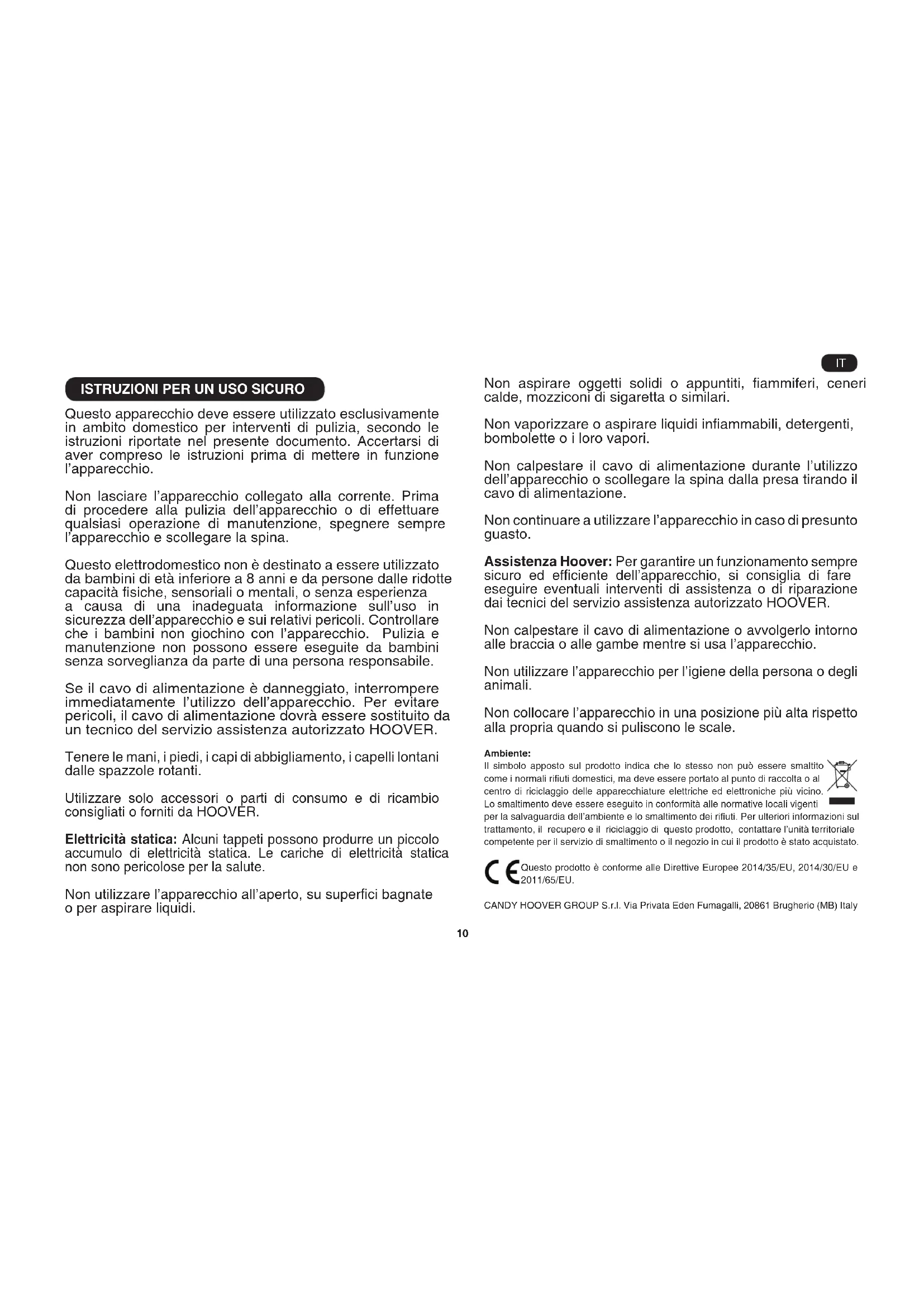 Questo apparecchio deve essere utilizzato esclusivamente in ambito domestico per interventi di pulizia, secondo le istruzioni riportate nel presente documento. Accertarsi di aver compreso le istruzioni prima di mettere in funzione l’apparecchio. Non lasciare l’apparecchio collegato alla corrente. Prima di procedere alla pulizia dell’apparecchio o di effettuare qualsiasi operazione di manutenzione, spegnere sempre l’apparecchio e scollegare la spina. Questo elettrodomestico non è destinato a essere utilizzato da bambini di età inferiore a 8 anni e da persone dalle ridotte capacità siche, sensoriali o mentali, o senza esperienza a causa di una inadeguata informazione sull’uso in sicurezza dell’apparecchio e sui relativi pericoli. Controllare che i bambini non giochino con l’apparecchio. Pulizia e manutenzione non possono essere eseguite da bambini senza sorveglianza da parte di una persona responsabile. Se il cavo di alimentazione è danneggiato, interrompere immediatamente l’utilizzo dell’apparecchio. Per evitare pericoli, il cavo di alimentazione dovrà essere sostituito da un tecnico del servizio assistenza autorizzato HOOVER. Tenere le mani, i piedi, i capi di abbigliamento, i capelli lontani dalle spazzole rotanti. Utilizzare solo accessori o parti di consumo e di ricambio consigliati o forniti da HOOVER. Elettricità statica: Alcuni tappeti possono produrre un piccolo accumulo di elettricità statica. Le cariche di elettricità statica non sono pericolose per la salute. Non utilizzare l’apparecchio all’aperto, su superci bagnate o per aspirare liquidi. Non aspirare oggetti solidi o appuntiti, ammiferi, ceneri calde, mozziconi di sigaretta o similari. Non vaporizzare o aspirare liquidi inammabili, detergenti, bombolette o i loro vapori. Non calpestare il cavo di alimentazione durante l’utilizzo dell’apparecchio o scollegare la spina dalla presa tirando il cavo di alimentazione. Non continuare a utilizzare l’apparecchio in caso di presunto guasto. Assistenza Hoover: Per garantire un funzionamento sempre sicuro ed efciente dell’apparecchio, si consiglia di fare eseguire eventuali interventi di assistenza o di riparazione dai tecnici del servizio assistenza autorizzato HOOVER. Non calpestare il cavo di alimentazione o avvolgerlo intorno alle braccia o alle gambe mentre si usa l’apparecchio. Non utilizzare l’apparecchio per l’igiene della persona o degli animali. Non collocare l’apparecchio in una posizione più alta rispetto alla propria quando si puliscono le scale. Ambiente: Il simbolo apposto sul prodotto indica che lo stesso non può essere smaltito come i normali riuti domestici, ma deve essere portato al punto di raccolta o al centro di riciclaggio delle apparecchiature elettriche ed elettroniche più vicino. Lo smaltimento deve essere eseguito in conformità alle normative locali vigenti per la salvaguardia dell’ambiente e lo smaltimento dei riuti. Per ulteriori informazioni sul trattamento, il recupero e il riciclaggio di questo prodotto, contattare l’unità territoriale competente per il servizio di smaltimento o il negozio in cui il prodotto è stato acquistato. Questo prodotto è conforme alle Direttive Europee 2014/35/EU, 2014/30/EU e 2011/65/EU. CANDY HOOVER GROUP S.r.l. Via Privata Eden Fumagalli, 20861 Brugherio (MB) Italy IT11 *Solo su alcuni modelli **Il design delle spazzole può variare secondo il modello