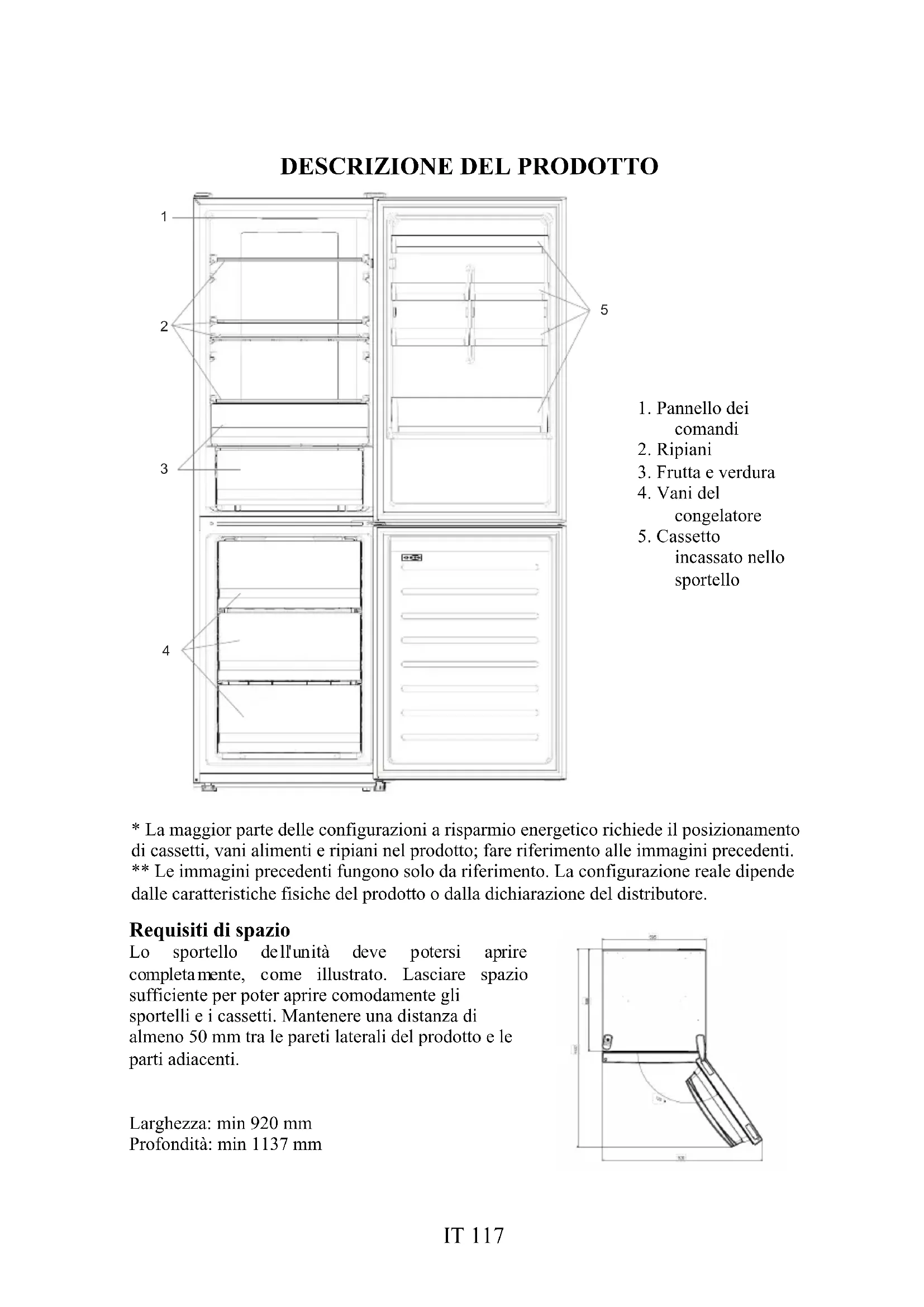 nte, c ome illustrato. Lasciare spazio sufficiente per poter aprire comodamente gli sportelli e i cassetti. Mantenere una distanza di almeno 50 mm tra le pareti laterali del prodotto e le parti adiacenti. Larghezza: min 920 mm Profondità: min 1137 mm