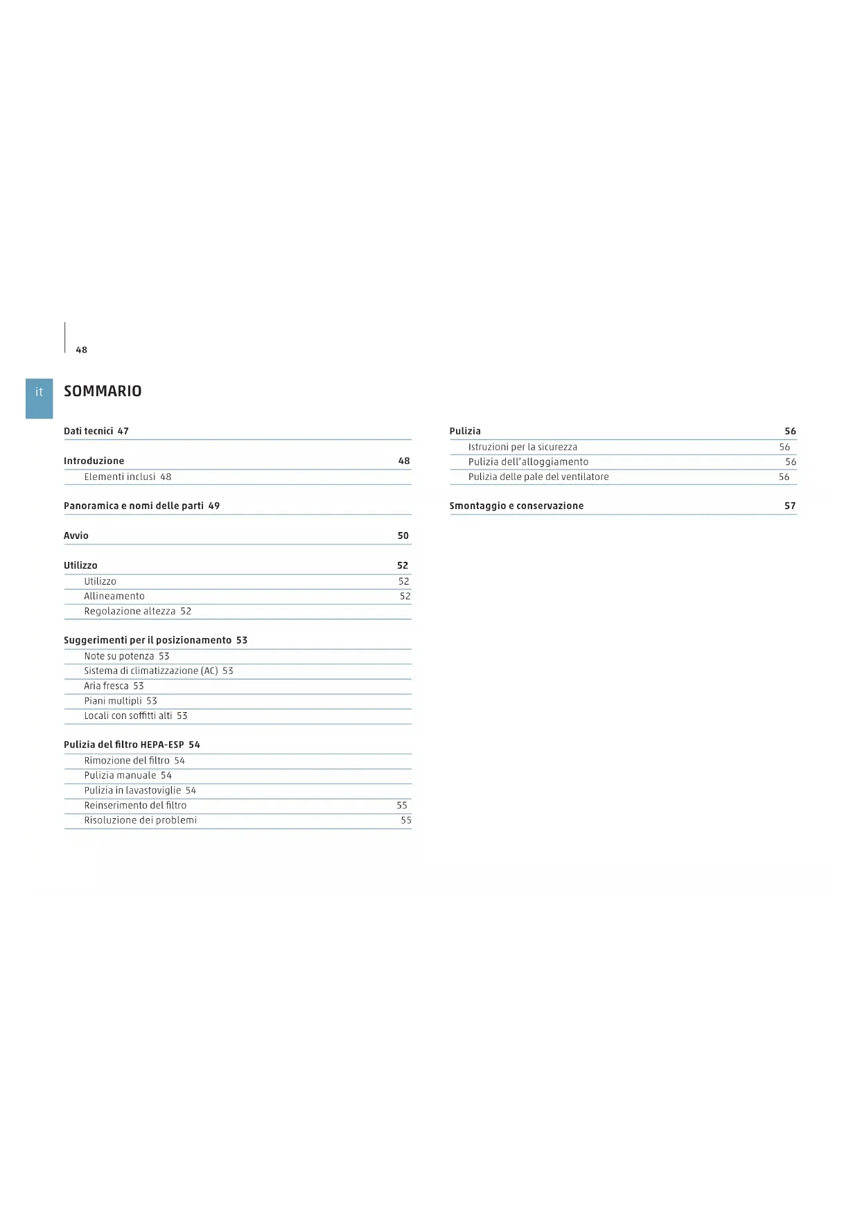 SOMMARIO Dati tecnici 47 Introduzione 48 Elementi inclusi 48 Panoramica e nomi delle parti 49 Avvio 50 Utilizzo 52 Utilizzo 52 Allineamento 52 Regolazione altezza 52 Suggerimenti per il posizionamento 53 Note su potenza 53 Sistema di climatizzazione (AC) 53 Aria fresca 53 Piani multipli 53 Locali con sotti alti 53 Pulizia del filtro HEPA-ESP 54 Rimozione del filtro 54 Pulizia manuale 54 Pulizia in lavastoviglie 54 Reinserimento del filtro 55 Risoluzione dei problemi 55 Pulizia 56 Istruzioni per la sicurezza 56 Pulizia dell’alloggiamento 56 Pulizia delle pale del ventilatore 56 Smontaggio e conservazione 5749