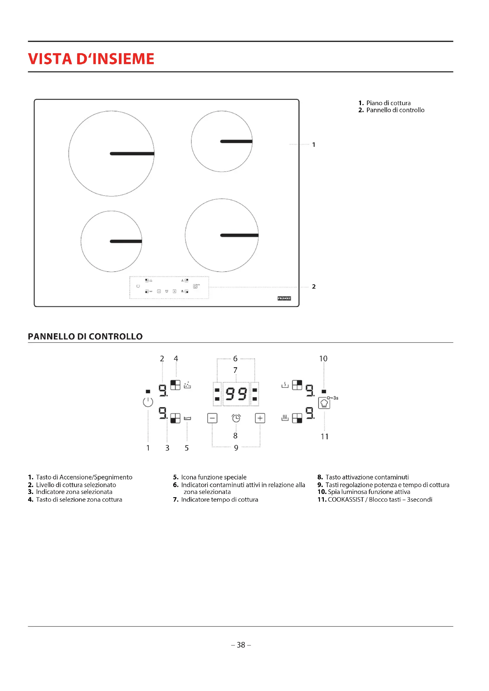 1. Tasto di Accensione/Spegnimento2. Livello di cottura selezionato3. Indicatore zona selezionata4. Tasto di selezione zona cottura5. Icona funzione speciale6. Indicatori contaminuti attivi in relazione alla zona selezionata7. Indicatore tempo di cottura8. Tasto attivazione contaminuti9. Tasti regolazione potenza e tempo di cottura10. Spia luminosa funzione attiva11. COOKASSIST / Blocco tasti – 3secondi – 38 –PRIMO UTILIZZO