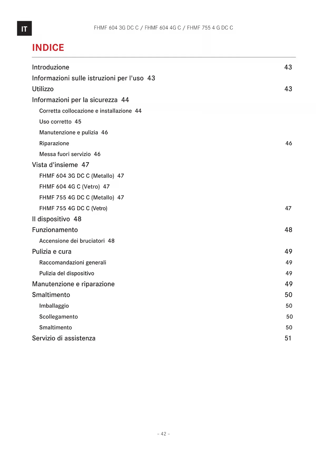 INDICE Introduzione 43 Informazioni sulle istruzioni per l'uso 43 Utilizzo 43 Informazioni per la sicurezza 44 Corretta collocazione e installazione 44 Uso corretto 45 Manutenzione e pulizia 46 Riparazione 46 Messa fuori servizio 46 Vista d'insieme 47 FHMF 604 3G DC C (Metallo) 47 FHMF 604 4G C (Vetro) 47 FHMF 755 4G DC C (Metallo) 47 FHMF 755 4G DC C (Vetro) 47 Il dispositivo 48 Funzionamento 48 Accensione dei bruciatori 48 Pulizia e cura 49 Raccomandazioni generali 49 Pulizia del dispositivo 49 Manutenzione e riparazione 49 Smaltimento 50 Imballaggio 50 Scollegamento 50 Smaltimento 50 Servizio di assistenza 51– 43 – FHMF 604 3G DC C / FHMF 604 4G C / FHMF 755 4 G DC C