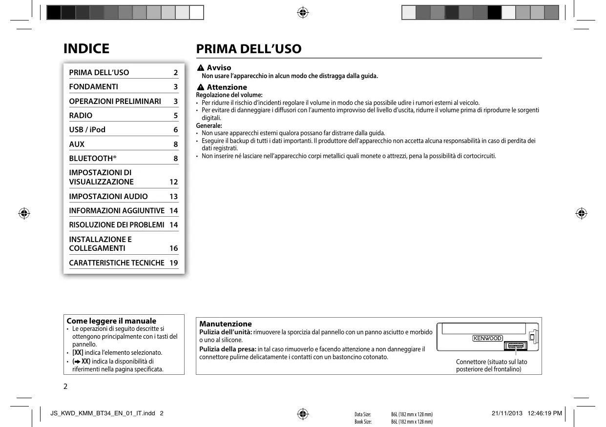 - Se si regola il volume durante la ricezione delle informazioni sul traffico o mentre si sta ricevendo un notiziario o un servizio allarmi, l’apparecchio lo memorizza automaticamente. Ripristinerà quindi lo stesso volume la volta successiva che si accederà agli stessi tipi di programma. ITALIANO | JS_KWD_KMM_BT34_EN_01_IT.indd 5 Data Size: Book Size: B6L (182 mm x 128 mm) B6L (182 mm x 128 mm)