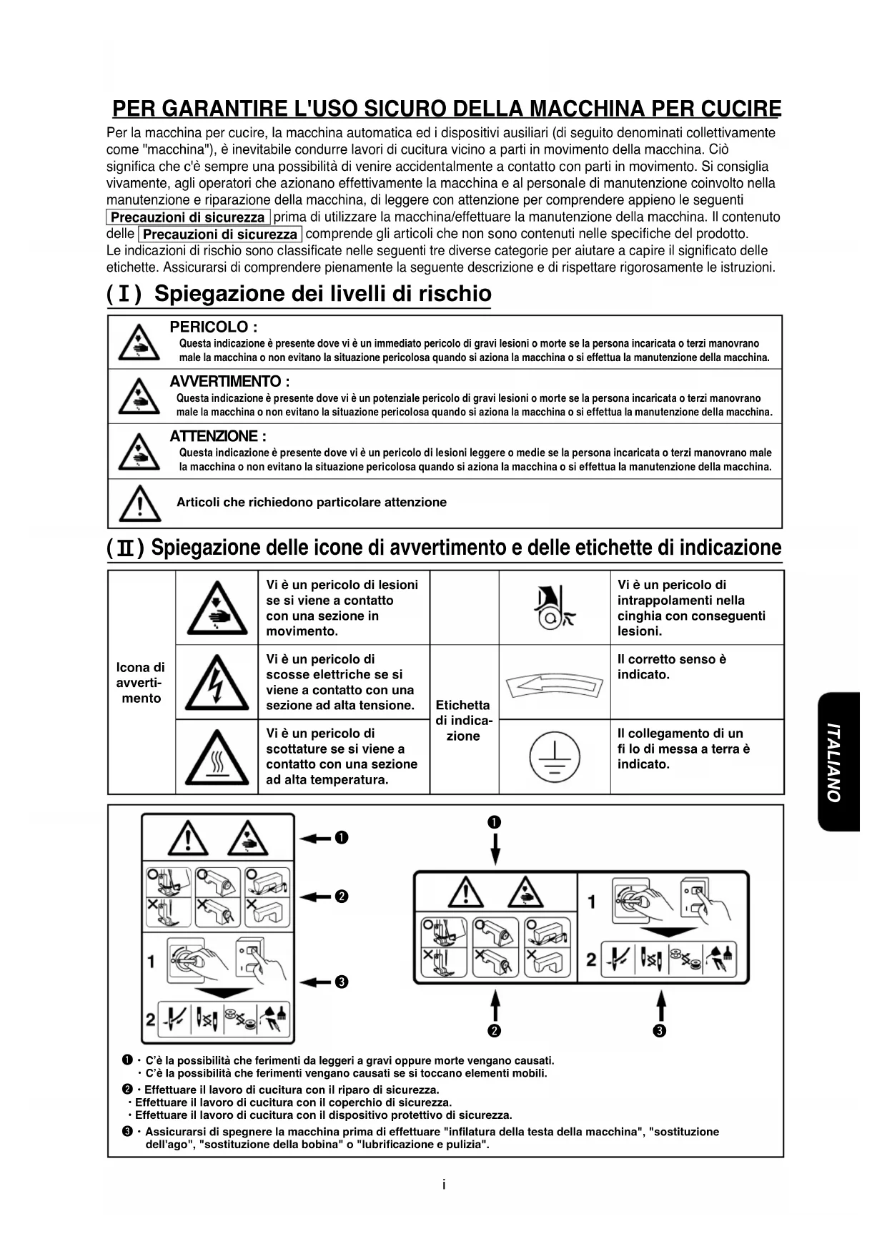- Assicurarsi di spegnere la macchina prima di effettuare "infi latura della testa della macchina", "sostituzione dell'ago", "sostituzione della bobina" o "lubrifi cazione e pulizia". Per la macchina per cucire, la macchina automatica ed i dispositivi ausiliari (di seguito denominati collettivamente come "macchina"), è inevitabile condurre lavori di cucitura vicino a parti in movimento della macchina. Ciò signifi ca che c'è sempre una possibilità di venire accidentalmente a contatto con parti in movimento. Si consiglia vivamente, agli operatori che azionano effettivamente la macchina e al personale di manutenzione coinvolto nella manutenzione e riparazione della macchina, di leggere con attenzione per comprendere appieno le seguenti Precauzioni di sicurezza prima di utilizzare la macchina/effettuare la manutenzione della macchina. Il contenuto delle Precauzioni di sicurezza comprende gli articoli che non sono contenuti nelle specifi che del prodotto. Le indicazioni di rischio sono classifi cate nelle seguenti tre diverse categorie per aiutare a capire il signifi cato delle etichette. Assicurarsi di comprendere pienamente la seguente descrizione e di rispettare rigorosamente le istruzioni. PER GARANTIRE L'USO SICURO DELLA MACCHINA PER CUCIRE