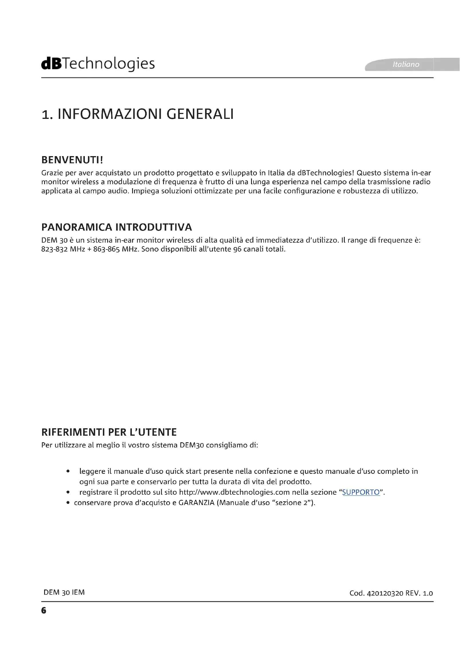 Grazie per aver acquistato un prodotto progettato e sviluppato in Italia da dBTechnologies! Questo sistema in-ear monitor wireless a modulazione di frequenza è frutto di una lunga esperienza nel campo della trasmissione radio applicata al campo audio. Impiega soluzioni ottimizzate per una facile congurazione e robustezza di utilizzo. DEM 30 è un sistema in-ear monitor wireless di alta qualità ed immediatezza d’utilizzo. Il range di frequenze è: 823-832 MHz + 863-865 MHz. Sono disponibili all’utente 96 canali totali. Per utilizzare al meglio il vostro sistema DEM30 consigliamo di: