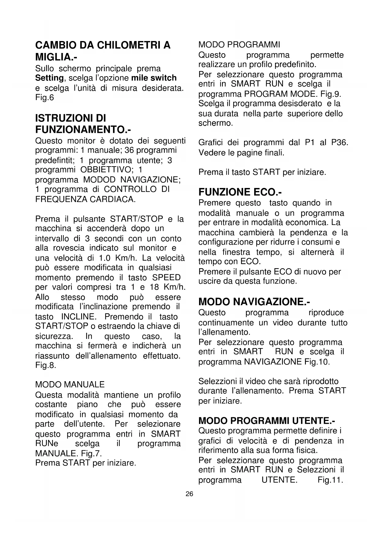Sullo schermo principale prema Setting, scelga l’opzione mile switch e scelga l’unità di misura desiderata. Fig.6 ISTRUZIONI DI FUNZIONAMENTO.- Questo monitor è dotato dei seguenti programmi: 1 manuale; 36 programmi predefintit; 1 programma utente; 3 programmi OBBIETTIVO; 1 programma MODOD NAVIGAZIONE; 1 programma di CONTROLLO DI FREQUENZA CARDIACA. Prema il pulsante START/STOP e la macchina si accenderà dopo un intervallo di 3 secondi con un conto alla rovescia indicato sul monitor e una velocità di 1.0 Km/h. La velocità può essere modificata in qualsiasi momento premendo il tasto SPEED per valori compresi tra 1 e 18 Km/h. Allo stesso modo può essere modificata l’inclinazione premendo il tasto INCLINE. Premendo il tasto START/STOP o estraendo la chiave di sicurezza. In questo caso, la macchina si fermerà e indicherà un riassunto dell’allenamento effettuato. Fig.8. MODO MANUALE Questa modalità mantiene un profilo costante piano che può essere modificato in qualsiasi momento da parte dell’utente. Per selezionare questo programma entri in SMART RUNe scelga il programma MANUALE. Fig.7. Prema START per iniziare. MODO PROGRAMMI Questo programma permette realizzare un profilo predefinito. Per selezzionare questo programma entri in SMART RUN e scelga il programma PROGRAM MODE. Fig.9. Scelga il programma desisderato e la sua durata nella parte superiore dello schermo. Grafici dei programmi dal P1 al P36. Vedere le pagine finali. Prema il tasto START per iniziare. FUNZIONE ECO.- Premere questo tasto quando in modalità manuale o un programma per entrare in modalità economica. La macchina cambierà la pendenza e la configurazione per ridurre i consumi e nella finestra tempo, si alternerà il tempo con ECO. Premere il pulsante ECO di nuovo per uscire da questa funzione. MODO NAVIGAZIONE.- Questo programma riproduce continuamente un video durante tutto l’allenamento. Per selezzionare questo programma entri in SMART RUN e scelga il programma NAVIGAZIONE Fig.10. Selezzioni il video che sarà riprodotto durante l’allenamento. Prema START per iniziare.