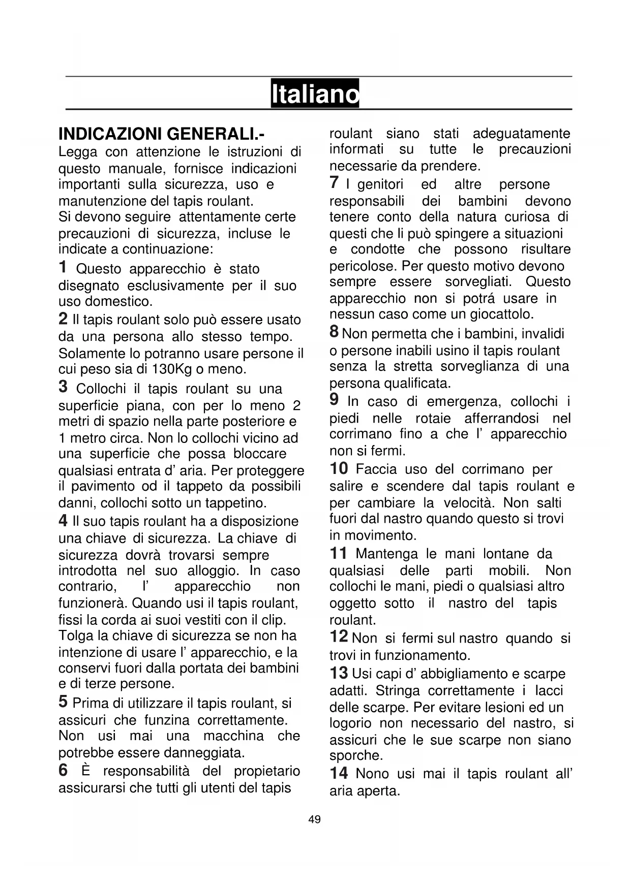 Italiano INDICAZIONI GENERALI.- Legga con attenzione le istruzioni di questo manuale, fornisce indicazioni importanti sulla sicurezza, uso e manutenzione del tapis roulant. Si devono seguire attentamente certe precauzioni di sicurezza, incluse le indicate a continuazione: