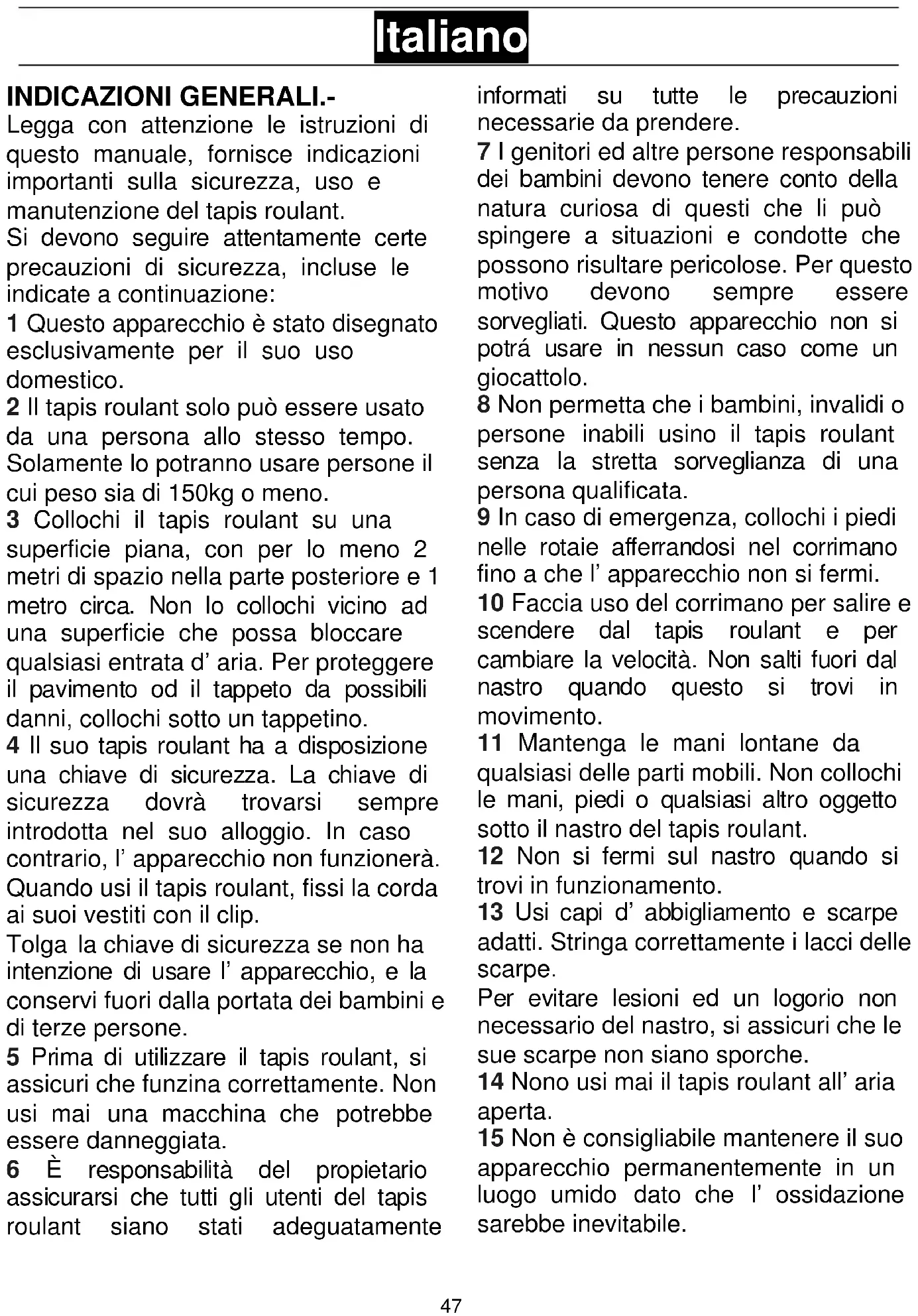 Italiano INDICAZIONI GENERALI.- Legga con attenzione le istruzioni di questo manuale, fornisce indicazioni importanti sulla sicurezza, uso e manutenzione del tapis roulant. Si devono seguire attentamente certe precauzioni di sicurezza, incluse le indicate a continuazione: 1 Questo apparecchio è stato disegnato esclusivamente per il suo uso domestico. 2 Il tapis roulant solo può essere usato da una persona allo stesso tempo. Solamente lo potranno usare persone il cui peso sia di 150kg o meno. 3 Collochi il tapis roulant su una superficie piana, con per lo meno 2 metri di spazio nella parte posteriore e 1 metro circa. Non lo collochi vicino ad una superficie che possa bloccare qualsiasi entrata d’ aria. Per proteggere il pavimento od il tappeto da possibili danni, collochi sotto un tappetino. 4 Il suo tapis roulant ha a disposizione una chiave di sicurezza. La chiave di sicurezza dovrà trovarsi sempre introdotta nel suo alloggio. In caso contrario, l’ apparecchio non funzionerà. Quando usi il tapis roulant, fissi la corda ai suoi vestiti con il clip. Tolga la chiave di sicurezza se non ha intenzione di usare l’ apparecchio, e la conservi fuori dalla portata dei bambini e di terze persone. 5 Prima di utilizzare il tapis roulant, si assicuri che funzina correttamente. Non usi mai una macchina che potrebbe essere danneggiata. 6 È responsabilità del propietario assicurarsi che tutti gli utenti del tapis roulant siano stati adeguatamente informati su tutte le precauzioni necessarie da prendere. 7 I genitori ed altre persone responsabili dei bambini devono tenere conto della natura curiosa di questi che li può spingere a situazioni e condotte che possono risultare pericolose. Per questo motivo devono sempre essere sorvegliati. Questo apparecchio non si potrá usare in nessun caso come un giocattolo. 8 Non permetta che i bambini, invalidi o persone inabili usino il tapis roulant senza la stretta sorveglianza di una persona qualificata. 9 In caso di emergenza, collochi i piedi nelle rotaie afferrandosi nel corrimano fino a che l’ apparecchio non si fermi. 10 Faccia uso del corrimano per salire e scendere dal tapis roulant e per cambiare la velocità. Non salti fuori dal nastro quando questo si trovi in movimento. 11 Mantenga le mani lontane da qualsiasi delle parti mobili. Non collochi le mani, piedi o qualsiasi altro oggetto sotto il nastro del tapis roulant. 12 Non si fermi sul nastro quando si trovi in funzionamento. 13 Usi capi d’ abbigliamento e scarpe adatti. Stringa correttamente i lacci delle scarpe. Per evitare lesioni ed un logorio non necessario del nastro, si assicuri che le sue scarpe non siano sporche. 14 Nono usi mai il tapis roulant all’ aria aperta. 15 Non è consigliabile mantenere il suo apparecchio permanentemente in un luogo umido dato che l’ ossidazione sarebbe inevitabile.48