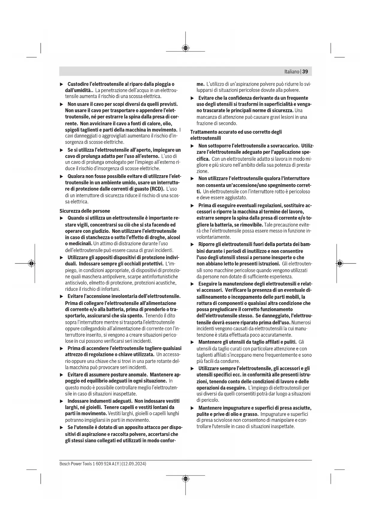 Il livello di vibrazione ed il valore di emissione acustica indi- cati nelle presenti istruzioni sono stati rilevati conformemen- te ad una procedura di misurazione unificata e sono utilizza- bili per confrontare gli elettroutensili. Le stesse procedure sono idonee anche per una valutazione temporanea del livel- lo di vibrazione e dell’emissione acustica. Il livello di vibrazione ed il valore di emissione acustica sono riferiti agli impieghi principali dell’elettroutensile; qualora, tuttavia, l’elettroutensile venisse utilizzato per altre applica- zioni, oppure con accessori differenti o in caso di insufficien- te manutenzione, il livello di vibrazione ed il valore di emis- sione acustica potrebbero variare. Ciò potrebbe aumentare sensibilmente l’emissione di vibrazioni e l’emissione acustica sull’intero periodo di funzionamento. Per valutare con precisione i valori di vibrazione e di emissio- ne acustica, andranno considerati anche i periodi nei quali l’utensile sia spento, oppure acceso, ma non utilizzato. Ciò potrebbe ridurre sensibilmente l’emissione di vibrazioni e l’emissione acustica sull’intero periodo di funzionamento. Adottare misure di sicurezza supplementari per proteggere l’operatore dall’effetto delle vibrazioni: ad esempio, sottopo- nendo a manutenzione l’elettroutensile e gli utensili accesso- ri, mantenendo calde le mani e organizzando i vari processi di lavoro. Batteria Bosch vende elettroutensili a batteria anche senza batteria. Per sapere se nella dotazione dell’elettroutensile è compresa una batteria, leggere quanto riportato sulla confezione. Ricarica della batteria u Utilizzare esclusivamente i caricabatterie indicati nei dati tecnici. Soltanto questi caricabatterie sono adatti al- le batterie al litio utilizzate nell’elettroutensile. Avvertenza: a causa delle norme internazionali per il tra- sporto, le batterie al litio vengono fornite parzialmente cari- che. Per assicurare la piena potenza della batteria, ricaricar- la completamente prima dell’impiego iniziale. Introduzione della batteria Spingere la batteria carica nell’apposito alloggiamento, sino a farlo scattare udibilmente in posizione. Rimozione della batteria Per rimuovere la batteria, premere il tasto di sbloccaggio ed estrarla. Durante tale operazione, non esercitare forza. La batteria è dotata di 2livelli di bloccaggio, preposti ad im- pedire che la batteria stessa cada all’esterno, qualora il tasto di sbloccaggio batteria venga premuto inavvertitamente. Si- no a quando la batteria è inserita nell’elettroutensile, essa viene mantenuta in posizione da un’apposita molla. Bosch Power Tools 1 609 92A A1Y | (12.09.2024)42 | Italiano Indicatore del livello di carica della batteria I LED verdi dell’apposito indicatore indicano il livello di cari- ca della batteria. Per ragioni di sicurezza, il livello di carica si può verificare esclusivamente ad elettroutensile fermo. Per visualizzare il livello di carica, premere il tasto dell’indi- catore livello di carica della batteria o . Ciò sarà possibi- le anche a batteria rimossa. Se premuto il tasto dell’indicatore livello di carica della batte- ria non si illumina alcun LED, ciò significa che la batteria è di- fettosa e che deve essere sostituita. Tipo di batteria GBA 18V... LED Capacità Luce fissa, 3 LED verdi 60–100% Luce fissa, 2 LED verdi 30–60% Luce fissa, 1 LED verde 5–30% Luce lampeggiante, 1 LED verde 0–5% Tipo di batteria ProCORE18V... LED Capacità Luce fissa, 5 LED verdi 80–100% Luce fissa, 4 LED verdi 60–80% Luce fissa, 3 LED verdi 40–60% Luce fissa, 2 LED verdi 20–40% Luce fissa, 1 LED verde 5–20% Luce lampeggiante, 1 LED verde 0–5% Avvertenze per l’impiego ottimale della batteria Proteggere la batteria ricaricabile da umidità ed acqua. Conservare la batteria esclusivamente nel campo di tempe- ratura fra −20 °C e 50°C. Non lasciare la batteria all’interno dell’auto, ad es. nel periodo estivo. Pulire di tanto in tanto le fessure di ventilazione della batte- ria ricaricabile con un pennello morbido, pulito ed asciutto. Una sensibile riduzione della durata del funzionamento dopo l’operazione di ricarica sta ad indicare che la batteria ricari- cabile dovrà essere sostituita. Attenersi alle indicazioni relative allo smaltimento. Montaggio u Prima di qualsiasi intervento sull’elettroutensile (ad es. per manutenzione, sostituzione dell’accessorio ecc.), prelevare la batteria. Qualora l’interruttore di av- vio/arresto venga premuto inavvertitamente, vi è rischio di lesioni. Sostituzione del foglio abrasivo (vederefig.A) Per rimuovere il foglio abrasivo (8), sollevarlo lateralmente ed estrarlo dal platorello (5). Prima di applicare un nuovo foglio abrasivo, rimuovere es impurità e polvere dal platorello (5), ad es. con un pennello. La superficie del platorello (5) consiste in un tessuto a strap- po, che consente di fissare gli appositi fogli abrasivi in modo semplice e rapido. Premere saldamente il foglio abrasivo (8) sul lato inferiore del platorello (5). Per garantire un’ottimale aspirazione della polvere, accertar- si che le incisioni praticate nel foglio abrasivo (8) coincidano con i fori sul platorello (5). Per incrementare la durata del platorello, in particolare se si utilizza l’abrasivo a rete (ad es. Bosch M480), si potrà appli- care il PadSaver (accessorio) fra platorello e abrasivo. Scelta del platorello In base al tipo di applicazione, l’elettroutensile può essere dotato di platorelli di durezza differente: – Platorello morbido: adatto per la levigatura accurata, an- che su superfici convesse – Platorello di media durezza: adatto per tutti i lavori di levi- gatura, impiego universale – Platorello duro: adatto per elevata capacità di levigatura su superfici piane Sostituzione del platorello (vederefig.B) Avvertenza: Sostituire immediatamente il platorello (5), qualora sia danneggiato. Rimuovere il foglio abrasivo. Svitare completamente le
