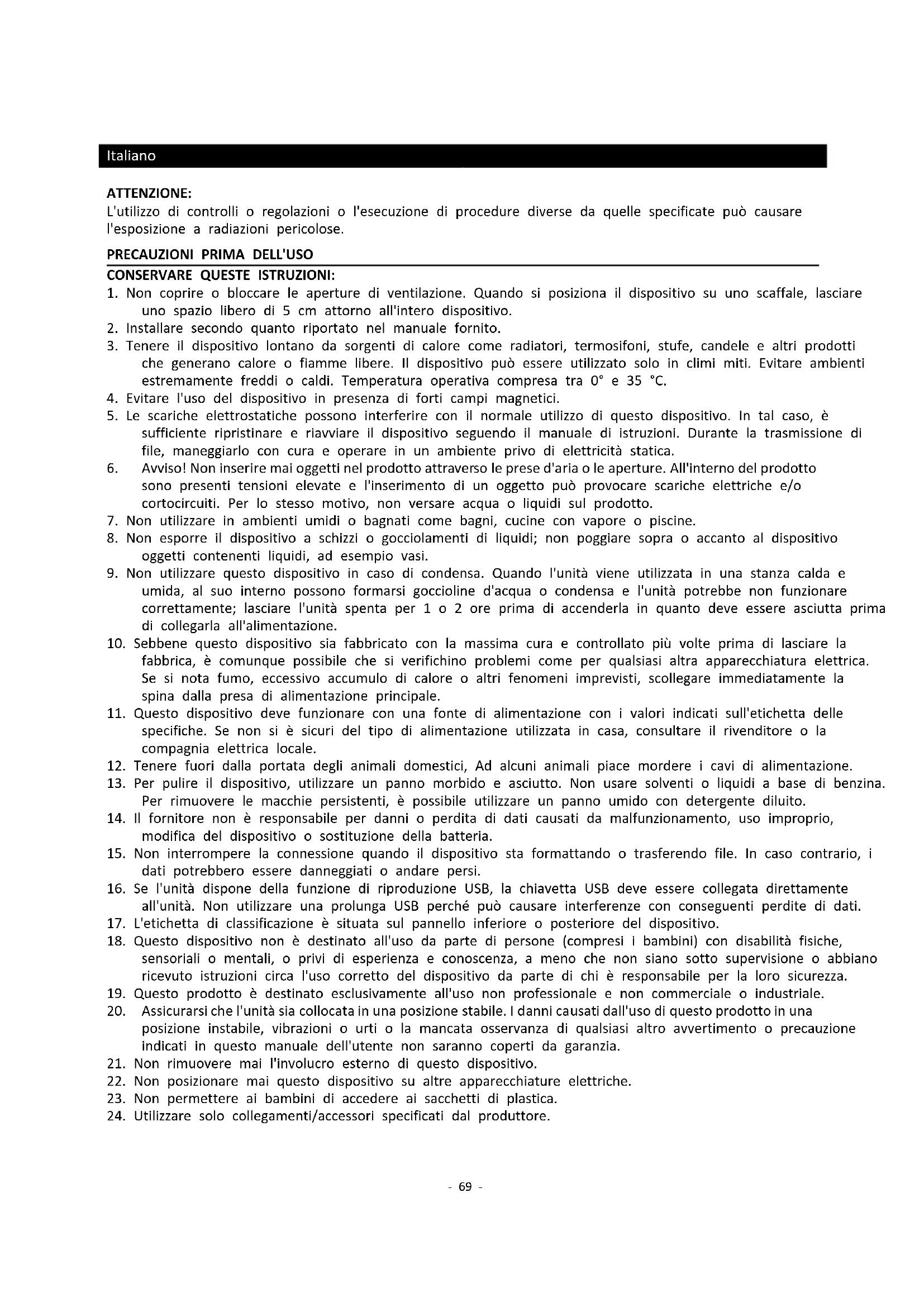 sufficiente ripristinare e riavviare il dispositivo seguendo il manuale di istruzioni. Durante la trasmissione di file, maneggiarlo con cura e operare in un ambiente privo di elettricità statica.