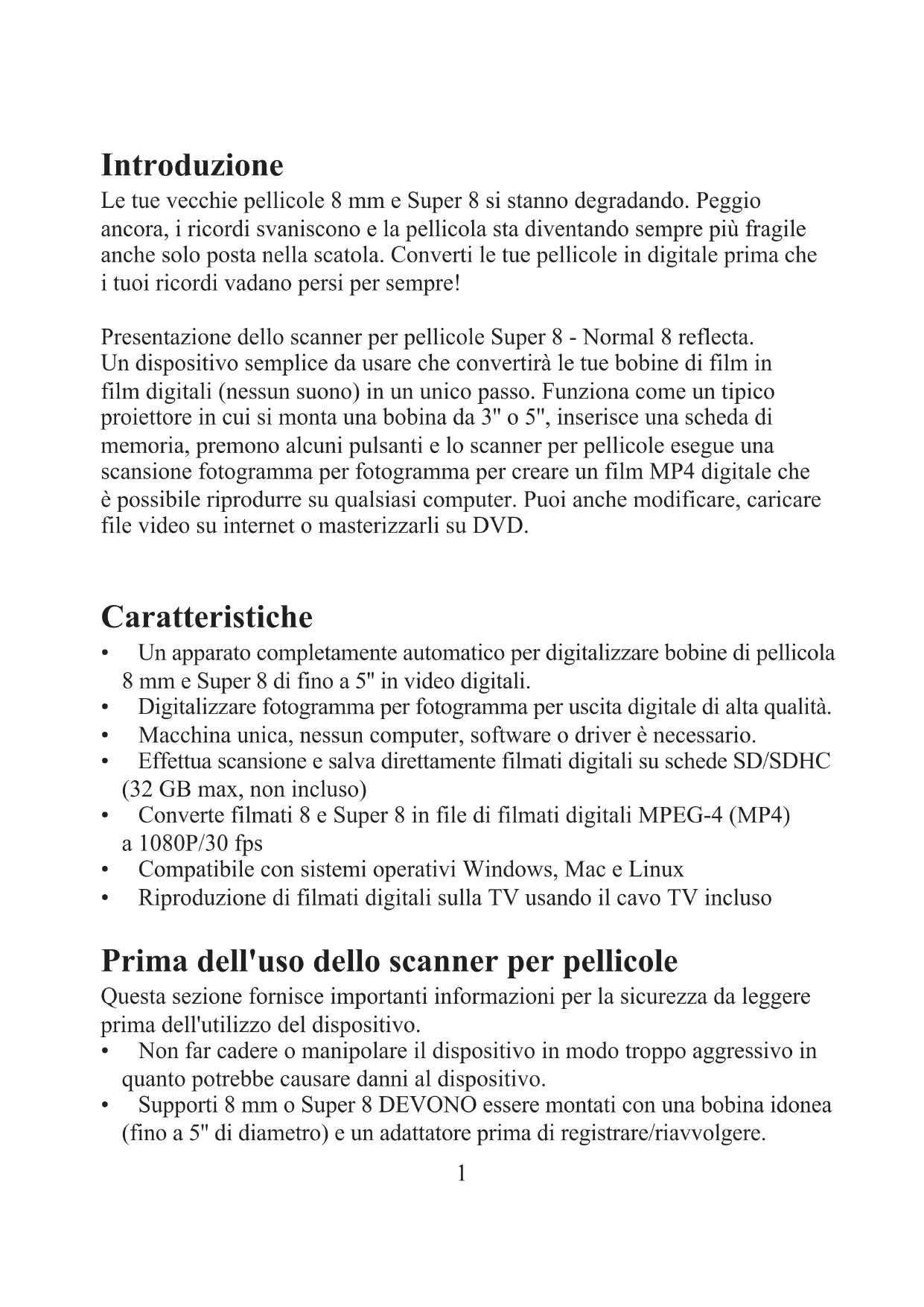 - Riproduzione di filmati digitali sulla TV usando il cavo TV incluso Prima dell'uso dello scanner per pellicole Questa sezione fornisce importanti informazioni per la sicurezza da leggere prima dell'utilizzo del dispositivo.