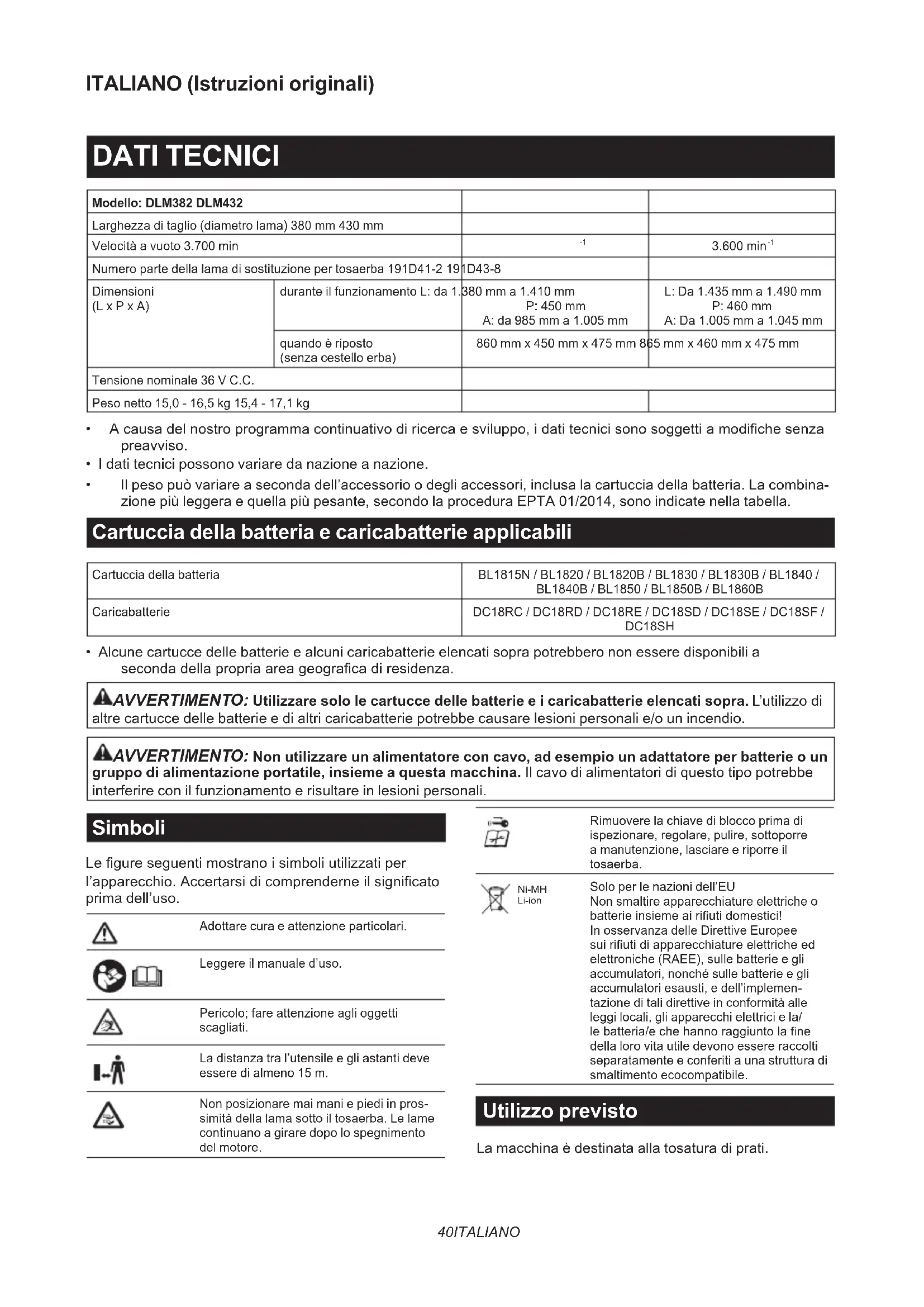 - Alcune cartucce delle batterie e alcuni caricabatterie elencati sopra potrebbero non essere disponibili a secondadellapropriaareageogracadiresidenza. AVVERTIMENTO: Utilizzare solo le cartucce delle batterie e i caricabatterie elencati sopra. L’utilizzo di altre cartucce delle batterie e di altri caricabatterie potrebbe causare lesioni personali e/o un incendio. AVVERTIMENTO: Non utilizzare un alimentatore con cavo, ad esempio un adattatore per batterie o un gruppo di alimentazione portatile, insieme a questa macchina. Il cavo di alimentatori di questo tipo potrebbe interferire con il funzionamento e risultare in lesioni personali. Simboli Legureseguentimostranoisimboliutilizzatiper l’apparecchio.Accertarsidicomprenderneilsignicato prima dell’uso. Adottare cura e attenzione particolari. Leggere il manuale d’uso. Pericolo; fare attenzione agli oggetti scagliati. La distanza tra l’utensile e gli astanti deve essere di almeno 15 m. Non posizionare mai mani e piedi in pros- simità della lama sotto il tosaerba. Le lame continuano a girare dopo lo spegnimento del motore. Rimuovere la chiave di blocco prima di ispezionare, regolare, pulire, sottoporre a manutenzione, lasciare e riporre il tosaerba. Ni-MH Li-ion Solo per le nazioni dell’EU Non smaltire apparecchiature elettriche o batterieinsiemeairiutidomestici! In osservanza delle Direttive Europee suiriutidiapparecchiatureelettricheed elettroniche (RAEE), sulle batterie e gli accumulatori, nonché sulle batterie e gli accumulatori esausti, e dell’implemen- tazione di tali direttive in conformità alle leggi locali, gli apparecchi elettrici e la/ lebatteria/echehannoraggiuntolane della loro vita utile devono essere raccolti separatamente e conferiti a una struttura di smaltimento ecocompatibile. Utilizzo previsto La macchina è destinata alla tosatura di prati.41 ITALIANO Rumore Livello tipico di rumore pesato A determinato in base allo standard EN60335-2-77: Modello DLM382 Livello di pressione sonora (L