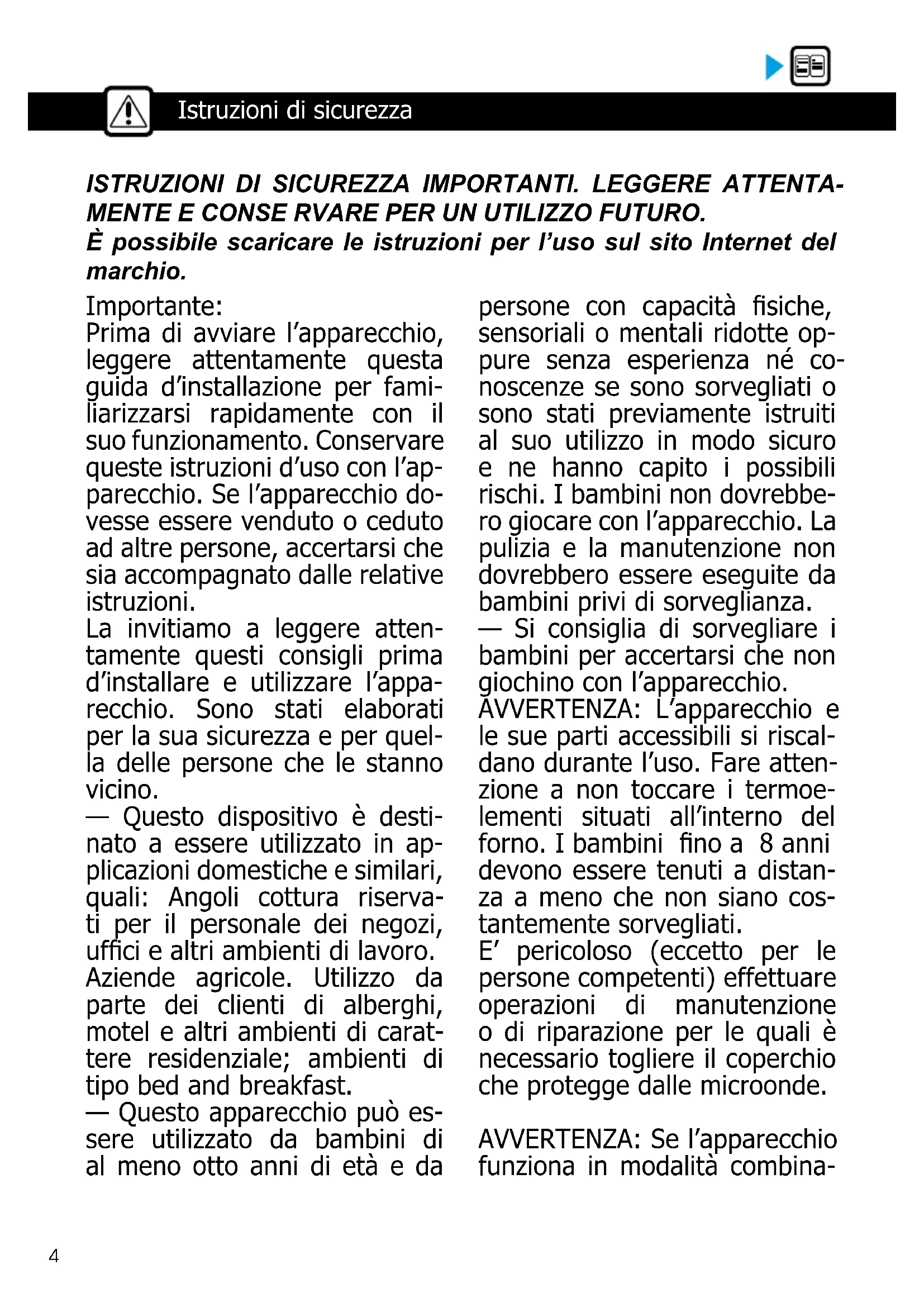 MENTE E CONSE RVARE PER UN UTILIZZO FUTURO. È possibile scaricare le istruzioni per l’uso sul sito Internet del marchio.5 Istruzioni di sicurezza Istruzioni di sicurezza ta, si consiglia di non lasciare utilizzare il forno ai bambini se non sorvegliati da una persona adulta, a causa delle tempera- ture erogate. — Utilizzare soltanto gli utensili adatti ad un forno a microonde. — Durante il riscaldamento di derrate alimentari in contenito- ri di plastica o di carta, control- lare a vista il forno per via dei possibili rischi d’inammazione. — Se appare del fumo, spe- gnere o scollegare il forno e mantenere chiusa la porta per soffocare le eventuali amme. AVVERTENZA: I liquidi o altri alimenti non vanno riscaldati in recipienti ermetici in quanto rischiano di esplodere. Non è permesso usare reci- pienti metallici per alimenti e bevande per la cottura al mi- croonde. — Riscaldare bevande nel mi- croonde può causare la fuorius- cita improvvisa e differita del liquido in ebollizione, vanno prese pertanto le debite pre- cauzioni nel manipolare il reci- piente. — Il contenuto dei biberon e degli omogeneizzati per neona- ti va agitato e la temperatura va controllata prima del consu- mo, onde evitare ustioni. — Si consiglia di non riscal- dare le uova nel guscio o le uova sode intere nel forno a microonde giacché rischiano di esplodere, anche dopo la ne della cottura. — Questo apparecchio è stato ideato per cuocere le pietanze con la porta chiusa. — Il forno a microonde serve a scaldare alimenti e bevande. L’asciugatura di alimenti o di bucato e il riscaldamento di cuscini riscaldanti, pantofole, spugne, bucato umido e altri articoli simili possono provo- care rischi di lesioni, combus- tione o incendio. AVVERTENZA: Se la porta o la sua guarnizione sono danneg- giate, il forno non deve essere utilizzato se non dopo essere stato riparato da una persona qualicata. Si consiglia di pulire il forno re- golarmente e di togliere i resi- dui di alimenti. — Se l’apparecchio non viene mantenuto in buono stato di pulizia, la supercie rischia di deteriorarsi, inuire negativa- mente sulla durata di vita ope- rativa del forno e indurre situa-Ambiente Ambiente