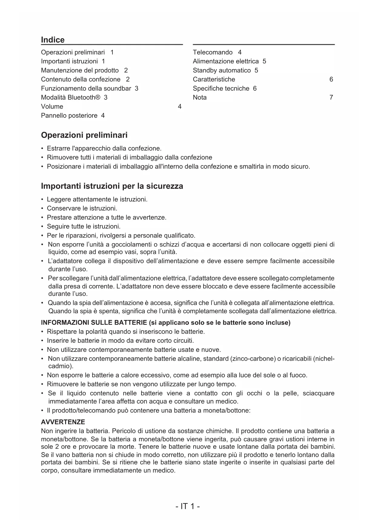 SOUNDBAR 2.1 con subwoofer esterno Bluetooth® / HDMI / OPTICAL / LINE IN / AUX IN- IT 1 - Indice Operazioni preliminari 1 Importanti istruzioni 1 Manutenzione del prodotto 2 Contenuto della confezione 2 Funzionamento della soundbar 3 Modalità Bluetooth® 3 Volume 4 Pannello posteriore 4 Telecomando 4 Alimentazione elettrica 5 Standby automatico 5 Caratteristiche 6 Speciche tecniche 6 Nota 7 Operazioni preliminari