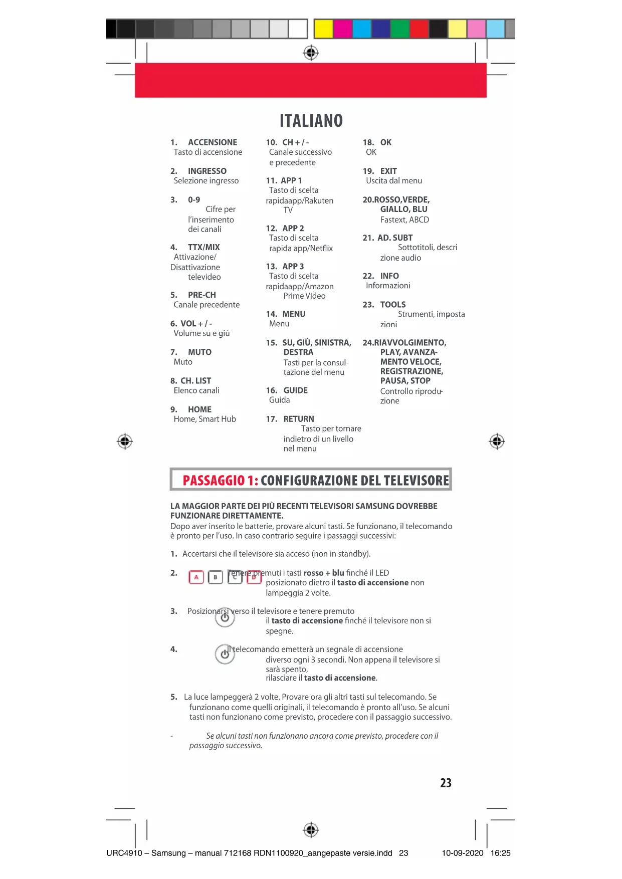 URC4910 – Samsung – manual 712168 RDN1100920_aangepaste versie.indd 23URC4910 – Samsung – manual 712168 RDN1100920_aangepaste versie.indd 23 10-09-2020 16:2510-09-2020 16:2524 ACQUISIZIONE DI UNA NUOVA FUNZIONE SUL TELECOMANDO Il telecomando ONE FOR ALL può acquisire qualsiasi funzione dal telecomando originale (funzionante). Posizionare il telecomando originale rivolto verso il telecomando ONE FOR ALL su una supercie piana.2. Per acquisire una funzione: tenere premuti i tasti VERDE + GIALLO nché il LED non lampeggia 2 volte.3. Premere 975. Il LED lampeggerà 2 volte.4. Premere il tasto sul telecomando ONE FOR ALL su cui si desi dera acquisire una funzione, ad esempio il tasto VOL +. Il LED lampeggerà rapidamente. Premere il tasto sul telecomando originale di cui si desidera acqui-sire una funzione, ad esempio il tasto VOL + del dispositivo audio.6. Due lampeggiamenti: ok. Per acquisire le funzioni di altri tasti, ripetere i passaggi dal numero 4. Lampeggiamento lungo: ripetere dal passaggio 4.7. Una volta acquisite tutte le funzioni sui tasti necessari, tenere premuto il tasto OK per 3 secondi. Il LED lampeggerà 2 volte.COME CANCELLARE UNA FUNZIONE ACQUISITA 1. Tenere premuti i tasti VERDE + GIALLO nché il LED non lampeggia 2 volte. 2. Premere 976.3. Premere il tasto per eettuare il reset 2 volte.4. Il LED lampeggerà 2 volte e il tasto tornerà alla funzione originale. PROGRAMAR