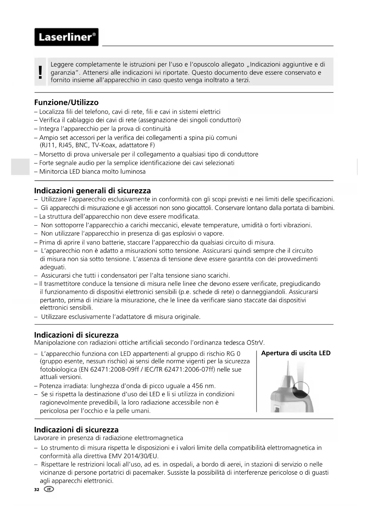 Funzione/Utilizzo – Localizza li del telefono, cavi di rete, li e cavi in sistemi elettrici – Verica il cablaggio dei cavi di rete (assegnazione dei singoli conduttori) – Integra l‘apparecchio per la prova di continuità – Ampio set accessori per la verica dei collegamenti a spina più comuni (RJ11, RJ45, BNC, TV-Koax, adattatore F) – Morsetto di prova universale per il collegamento a qualsiasi tipo di conduttore – Forte segnale audio per la semplice identicazione dei cavi selezionati – Minitorcia LED bianca molto luminosa Indicazioni generali di sicurezza – Utilizzare l‘apparecchio esclusivamente in conformità con gli scopi previsti e nei limiti delle specicazioni. – Gli apparecchi di misurazione e gli accessori non sono giocattoli. Conservare lontano dalla portata di bambini. – La struttura dell‘apparecchio non deve essere modicata. – Non sottoporre l‘apparecchio a carichi meccanici, elevate temperature, umidità o forti vibrazioni. – Non utilizzare l‘apparecchio in presenza di gas esplosivi o vapore. – Prima di aprire il vano batterie, staccare l‘apparecchio da qualsiasi circuito di misura. – L‘apparecchio non è adatto a misurazioni sotto tensione. Assicurarsi quindi sempre che il circuito di misura non sia sotto tensione. L‘assenza di tensione deve essere garantita con dei provvedimenti adeguati. – Assicurarsi che tutti i condensatori per l‘alta tensione siano scarichi. – Il trasmettitore conduce la tensione di misura nelle linee che devono essere vericate, pregiudicando il funzionamento di dispositivi elettronici sensibili (p.e. schede di rete) o danneggiandoli. Assicurarsi pertanto, prima di iniziare la misurazione, che le linee da vericare siano staccate dai dispositivi elettronici sensibili. – Utilizzare esclusivamente l‘adattatore di misura originale. Indicazioni di sicurezza Manipolazione con radiazioni ottiche articiali secondo l’ordinanza tedesca OStrV. Indicazioni di sicurezza Lavorare in presenza di radiazione elettromagnetica – L’apparecchio funziona con LED appartenenti al gruppo di rischio RG 0 (gruppo esente, nessun rischio) ai sensi delle norme vigenti per la sicurezza fotobiologica (EN 62471:2008-09ff / IEC/TR 62471:2006-07ff) nelle sue attuali versioni. – Potenza irradiata: lunghezza d’onda di picco uguale a 456 nm. – Se si rispetta la destinazione d‘uso dei LED e li si utilizza in condizioni ragionevolmente prevedibili, la loro radiazione accessibile non è pericolosa per l’occhio e la pelle umani. – Lo strumento di misura rispetta le disposizioni e i valori limite della compatibilità elettromagnetica in conformità alla direttiva EMV 2014/30/EU. – Rispettare le restrizioni locali all’uso, ad es. in ospedali, a bordo di aerei, in stazioni di servizio o nelle vicinanze di persone portatrici di pacemaker. Sussiste la possibilità di interferenze pericolose o di guasti agli apparecchi elettronici. Apertura di uscita LEDMultiCable-Checker