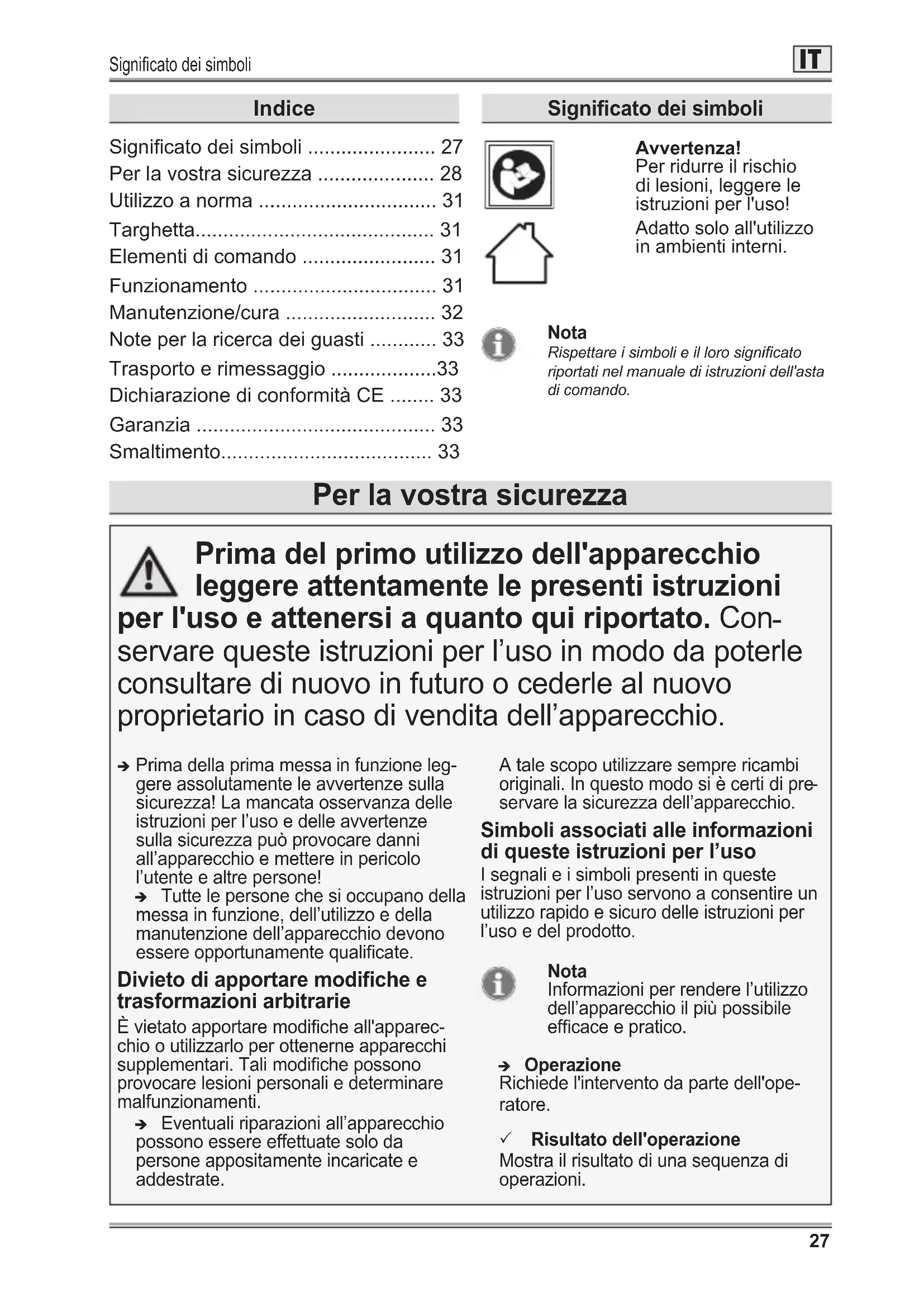 servare la sicurezza dell’apparecchio. Simboli associati alle informazioni di queste istruzioni per l’uso I segnali e i simboli presenti in queste istruzioni per l’uso servono a consentire un utilizzo rapido e sicuro delle istruzioni per l’uso e del prodotto. Nota Informazioni per rendere l’utilizzo dell’apparecchio il più possibile efcace e pratico. Î Operazione Richiede l'intervento da parte dell'ope- ratore. 3 Risultato dell'operazione Mostra il risultato di una sequenza di operazioni. Avvertenza! Per ridurre il rischio di lesioni, leggere le istruzioni per l'uso! Adatto solo all'utilizzo in ambienti interni. Nota Rispettare i simboli e il loro signicato riportati nel manuale di istruzioni dell'asta di comando.Per la vostra sicurezza
