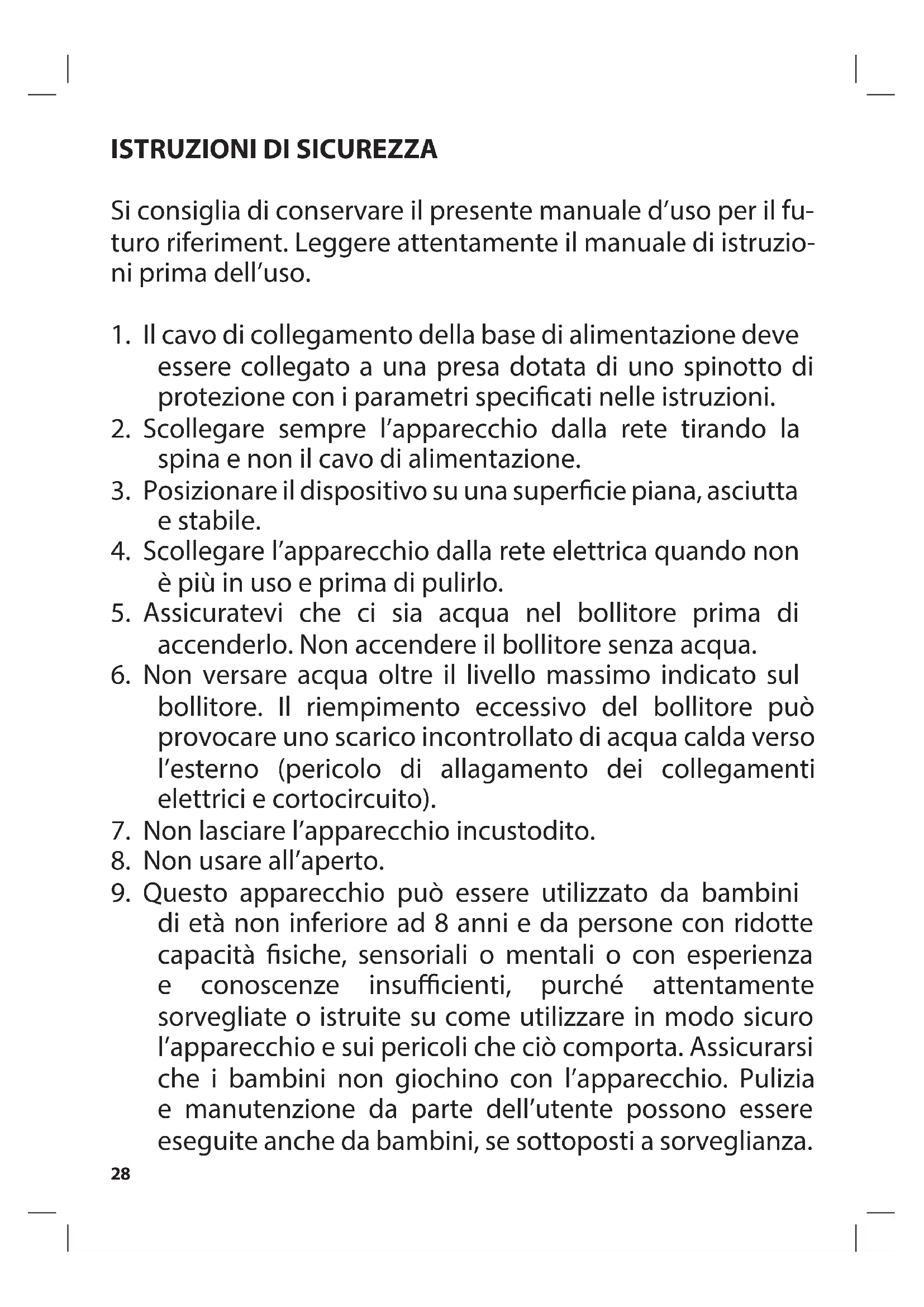 di età non inferiore ad 8 anni e da persone con ridotte capacità siche, sensoriali o mentali o con esperienza e conoscenze insucienti, purché attentamente sorvegliate o istruite su come utilizzare in modo sicuro l’apparecchio e sui pericoli che ciò comporta. Assicurarsi che i bambini non giochino con l’apparecchio. Pulizia e manutenzione da parte dell’utente possono essere eseguite anche da bambini, se sottoposti a sorveglianza.29