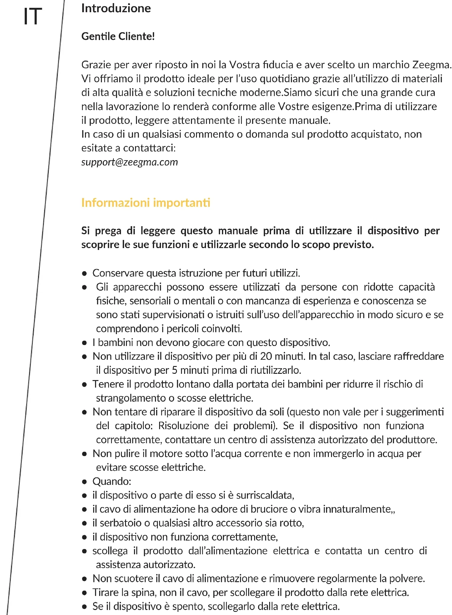 Passare alla modalità di velocità di retomarcia (REN/), dopo alcuni secondi e impostarlo sulla modalità normale (STA). La polpa è troppo umida Il setaccio è ostruito? Controllare che non ci sia troppa polpa nel meccanismo della coclea. Pulirlo. Il motore funziona troppo rumoroso o vibra Tu gli elemen del set sono assembla correamente? Se il prodoo è assemblato correamente: è normale che il disposivo funzioni più forte quando si spremono succhi di frua e verdura eccessivamente matura. Il contenitore vibra durante il funzionamento Questo è il normale funzionamento del prodoo. Il motore fa muovere il contenitoreIT Pulizia e manutenzione Non u lizzare detergen come solven , diluen , diluen , candeggina o altri agen contenen cloro o benzene. Non u lizzare abrasivi. Scollegare il disposi vo prima della pulizia. Pulizia della base del motore: U lizzare un panno morbido e umido. Non immergere la base dello spremiagrumi in acqua o pulirla so o l’acqua corrente. U lizzare un panno asciu o per pulire il cavo e la spina. Pulizia della coclea rotante: U lizzare una spazzola o un panno umido per pulire i residui di carne. Il verme può essere pulito so o l’acqua corrente. Pulire il prodo o dopo ogni u lizzo. Pulizia di altri elemen del set: Non usare la lavastoviglie. Non asciugare gli ar coli con un essiccatore. Pulire il prodo o dopo ogni u lizzo. Togliere la carne dalla macchina non più di 5 minu dopo la ne della spremitura. Prodo o conforme ai requisi delle dire ve dell’Unione Europea. In conformità alla dire va 2012/19/ UE, questo prodo o è sogge o a raccolta di erenziata. Il prodo o non deve essere smal to con i ri u domes ci perché può cos tuire una minaccia per l’ambiente e la salute umana. Si prega di res tuire il vecchio prodo o al punto di raccolta applicabile per il riciclaggio di apparecchiature ele riche ed ele roniche. Le foto sono a solo scopo illustra vo, l’aspe o eff e vo dei prodo può diff erire da quello presentato nelle immagini.FR Introducon Cher client ! Merci de nous avoir fait conance et d’avoir choisi la marque Zeegma. Nous vous donnons un produit parfait à l’usage quodien grâce à l’applicaon de maères primaires de haute qualité et des soluons techniques modernes. Nous sommes sûrs que grâce à un grand soin que nous avons pris pour fabriquer ce produit, il répondra à toutes vos exigences. Avant d’uliser le produit pour la première fois, lisez aenvement ce mode d’emploi. Si vous avez des quesons ou remarques relaves au produit acheté, n’hésitez pas à nous contacter à l’adresse : support@zeegma.com Renseignements importants Veuillez lire cee noce d’ulisaon avant de commencer à manipuler l’appareil an de connaître ses foncons et l’uliser conformément à son usage prévu.